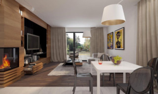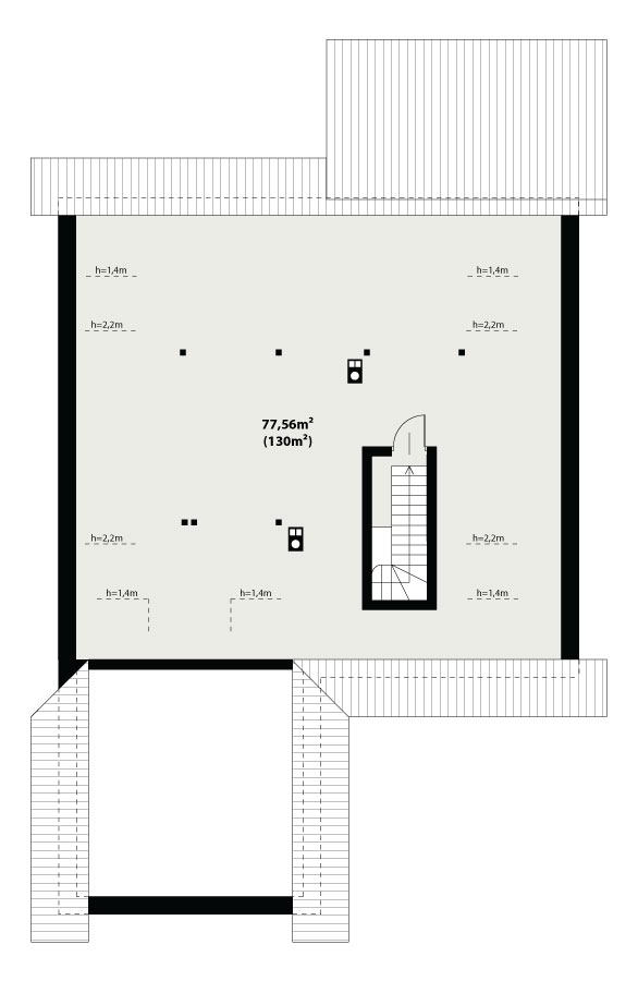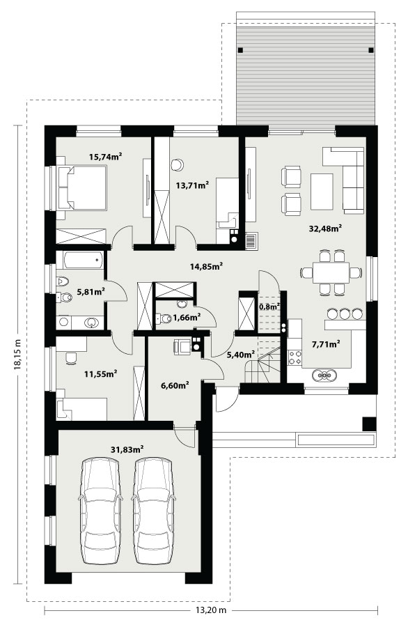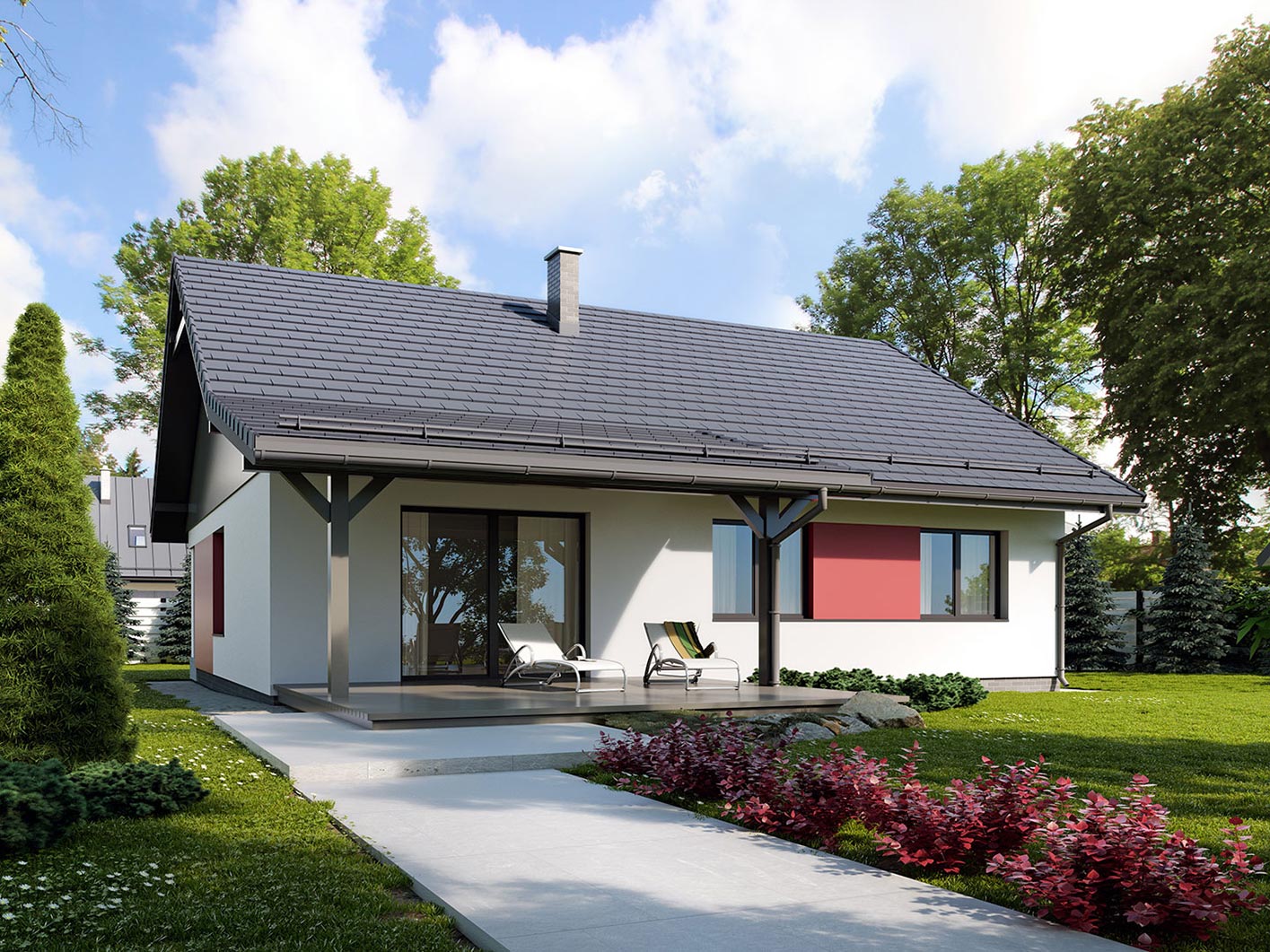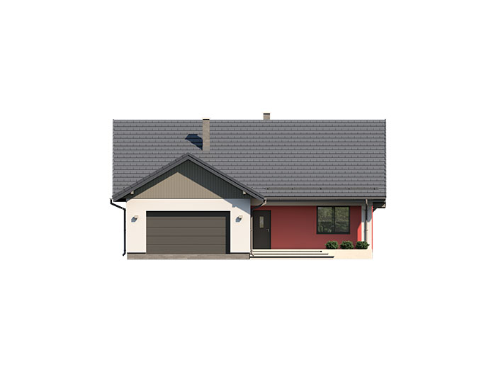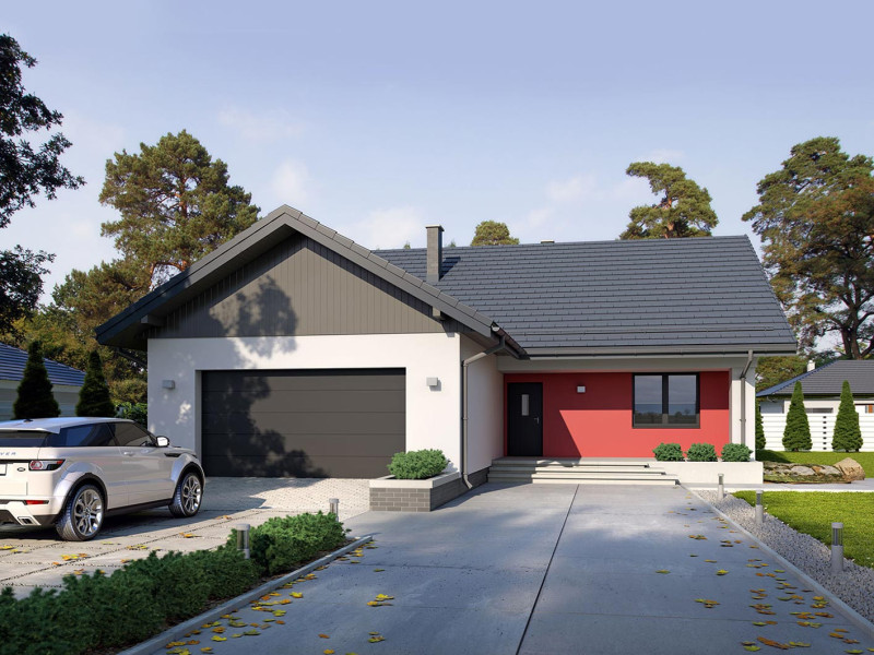 Dom jednorodzinny parterowy, z nieużytkowym poodaszem, z garażem dwustanowiskowym. Prosty i funkcjonalny. Duży salon z jadalnią posiada bezpośrednie wyjście na zadaszony taras. Kuchnia jest otwarta na salon, można ją jednak bez problemu wydzielić i zamknąć. Dom ten posiada dużo dodatkowego miejsca na szafy i schowki oraz dużą kotłownię dostępną z wiatrołapu. Wejście do domu jest przez praktyczny podcień chroniący przed deszczem i słońcem. Strych (nieużytkowy) posiada wejscie ze schodami dostępnymi z wiatrołapu. Można go zaadaptować na dodatkowe pokoje, mieszkanie czy biuro.