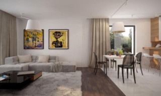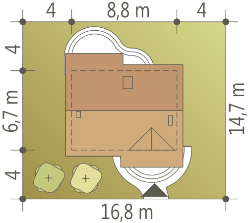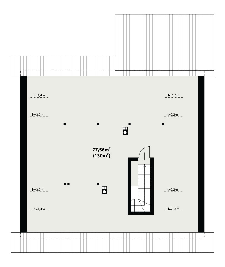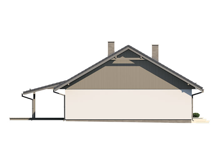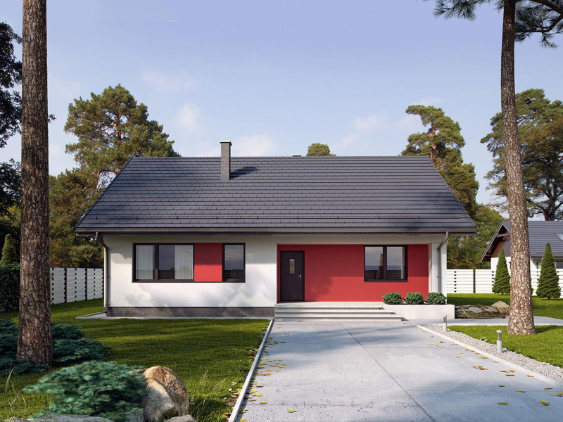 Dom jednorodzinny parterowy, z nieużytkowym poodaszem, bez garażu. Prosty i funkcjonalny. Duży salon z jadalnią posiada bezpośrednie wyjście na zadaszony taras. Kuchnia jest otwarta na salon, można ją jednak bez problemu wydzielić i zamknąć. Dom ten posiada dużo dodatkowego miejsca na szafy i schowki oraz dużą kotłownię dostępną z wiatrołapu. Wejście do domu jest przez praktyczny podcień chroniący przed deszczem i słońcem. Strych (nieużytkowy) posiada wejście ze schodami dostępnymi z wiatrołapu. Można go zaadaptować na dodatkowe pokoje, mieszkanie czy biuro.