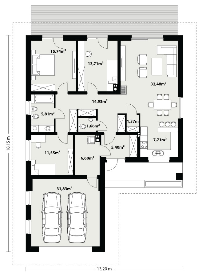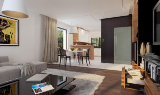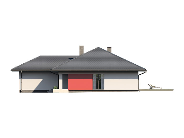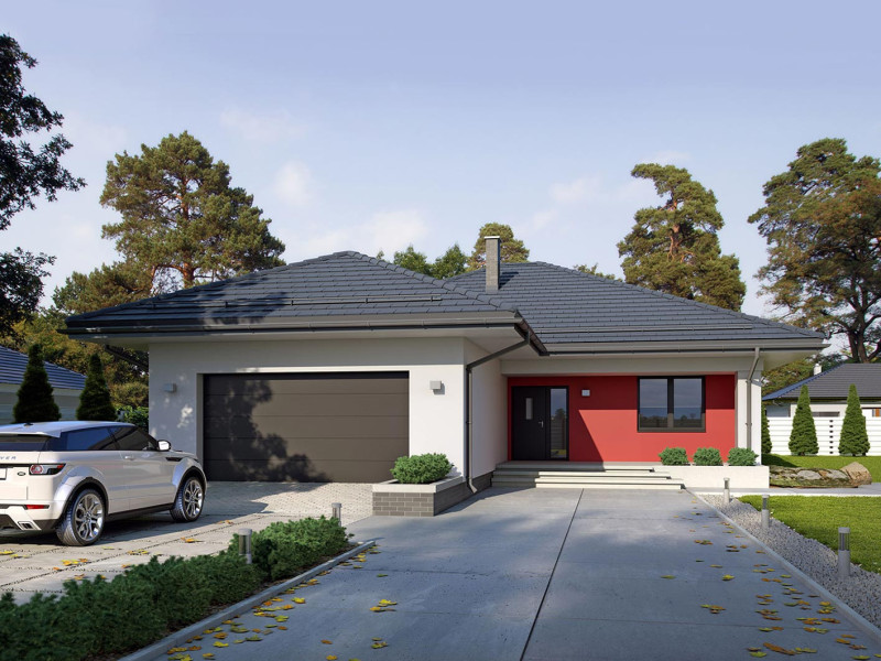 Dom jednorodzinny parterowy, z nieużytkowym poodaszem, z garażem dwustanowiskowym. Prosty i funkcjonalny. Duży salon z jadalnią posiada bezpośrednie wyjście na taras. Kuchnia jest otwarta na salon, można ją jednak bez problemu wydzielić i zamknąć. Dom ten posiada dużo dodatkowego miejsca na szafy i schowki oraz dużą kotłownię dostępną z wiatrołapu. Dwie z trzech sypialni mają własne wyjścia na taras. Wejście do domu jest przez praktyczny podcień chroniący przed deszczem i słońcem.