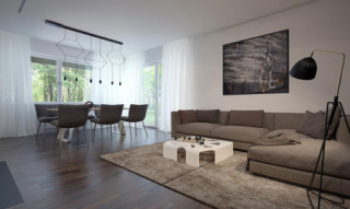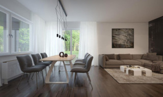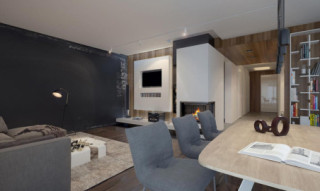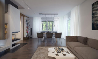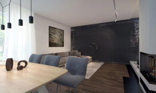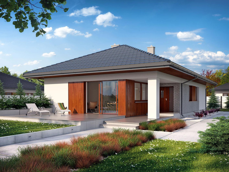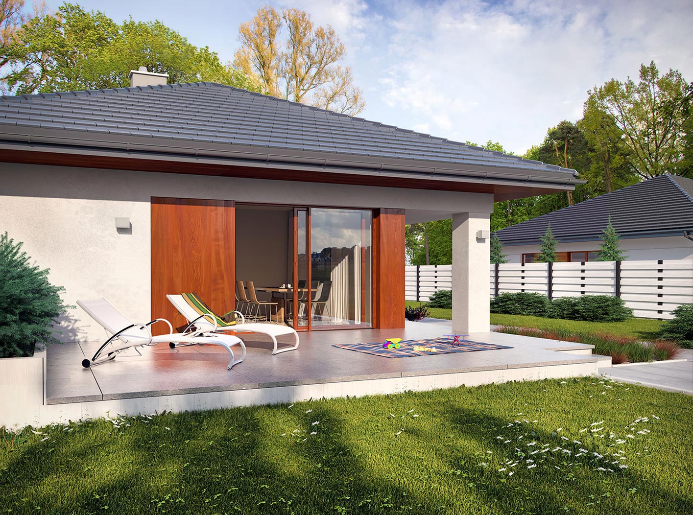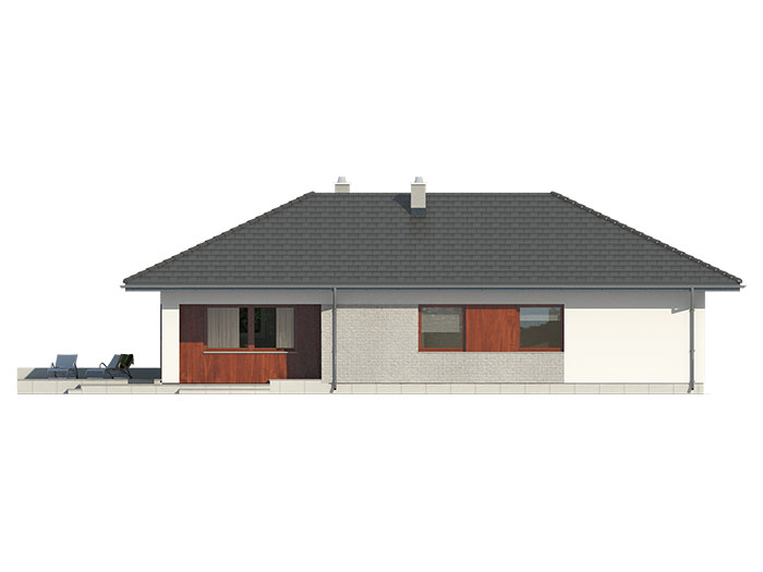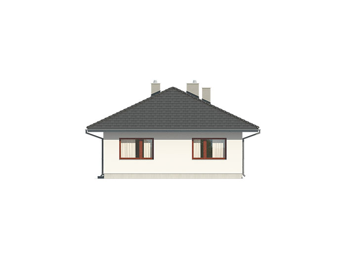 Parterowy dom jednorodzinny, z wjazdem od południa. Swoim pełnym programem funkcjonalnym zapewnia komfort i wygodę 4-osobowej rodzinie. Przestronna część dzienna to duży salon połączony z jadalnią, otwierający się na ogród poprzez przeszklenia, kuchnia ze spiżarnią oraz wc. Część nocna to 3 wygodne sypialnie oraz łazienka. W domu zaprojektowano dużą kotłownię dostępną z wiatrołapu, której parametry pozwalają na montaż kotła na każdy rodzaj paliwa, w tym na paliwo stałe. Ten optymalny i ciekawy program funkcjonalny został ujęty w prostej bryle na rzucie prostokąta, przykrytej kopertowym dachem. Atutem projektu jest jego prostota zarówno w układzie pomieszczeń, jak i w rozwiązaniach elewacji, gdzie elegancki, nowoczesny styl osiągnięto poprzez klasyczne, proste ale szlachetne materiały.