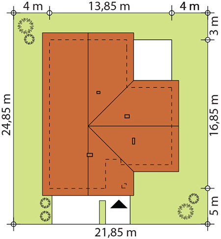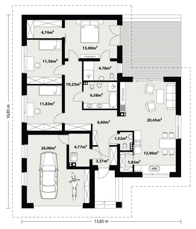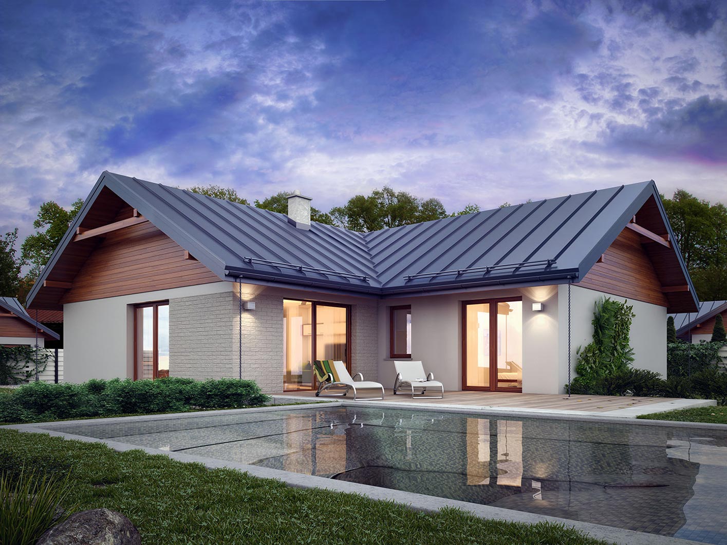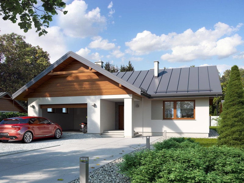 Jednorodzinny budynek mieszkalny, parterowy, niepodpiwniczony z jednostanowiskowym garażem. Funkcjonalny i optymalny układ pomieszczeń zapewnia komfort 4-osobowej rodzinie. Ergonomicznie zaprojektowana przestrzeń została wyraźnie podzielona na część dzienną, nocną i gospodarczą. Część reprezentacyjna domu, to przestronny salon połączony z jadalnią oraz kuchnia ze spiżarnią. Oprócz części dziennej, przewidziano strefę intymną domu, która składa się z trzech sypialni oraz łazienki. Największa sypialnia posiada własną, oddzielną garderobę i łazienkę. Dużą kotłownię oraz garaż zaprojektowano w części gospodarczej domu. Ciekawie zaprojektowaną wnękę w garażu można wykorzystać jako pomieszczenie gospodarcze. Geometria rzutu oraz prostota bryły czynią ten dom tanim i prostym w budowie oraz niedrogim w utrzymaniu i eksploatacji.