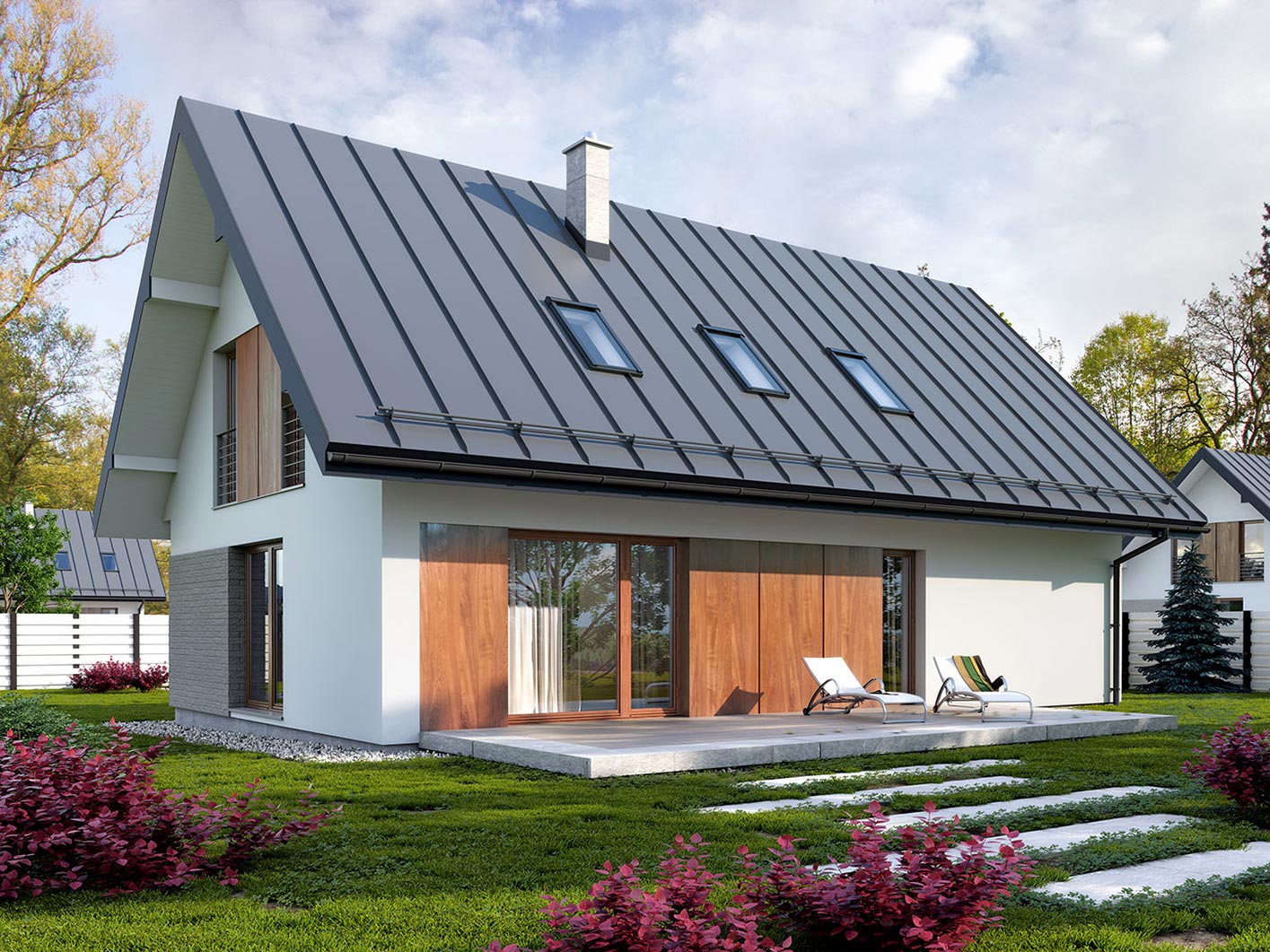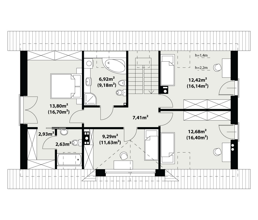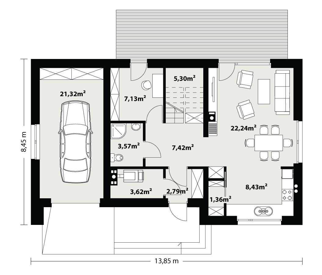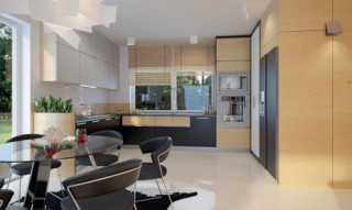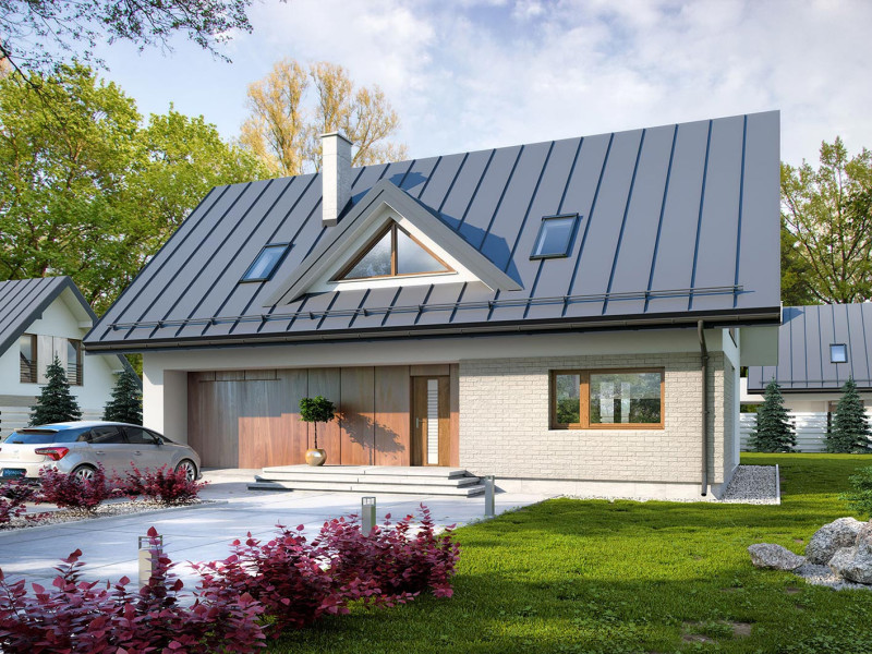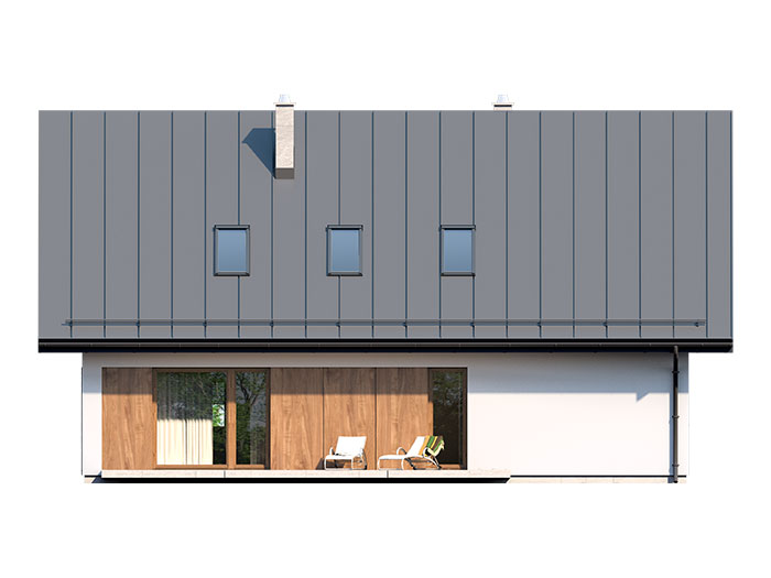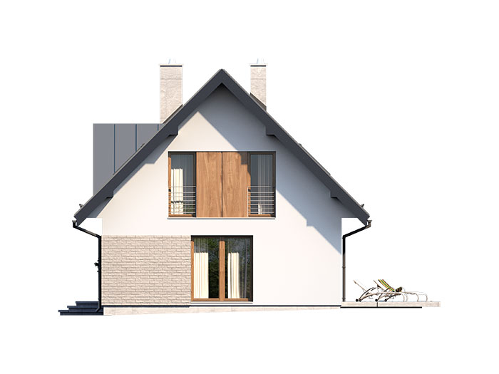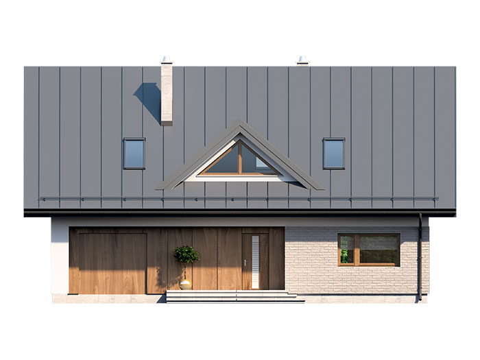 Prosty, ale zarazem interesujący dom o średnich gabarytach. Bardzo funkcjonalny układ pomieszczeń zapewnia optymalny komfort 5-osobowej rodzinie. Na parterze zaprojektowano kuchnię ze spiżarnią, salon z jadalnią, kotłownię, łazienkę oraz garaż. Atutem tego projektu jest dodatkowy pokój na parterze, który może pełnić rolę gabinetu. Na poddaszu przewidziano 4 sypialnie, w tym jedną z własną łazienką i garderobą oraz łazienkę. Elegancki styl tego budynku uzyskano poprzez połączenie klasycznej bryły domu jednorodzinnego z nowoczesnymi elewacjami i materiałami oraz z delikatnym detalem.