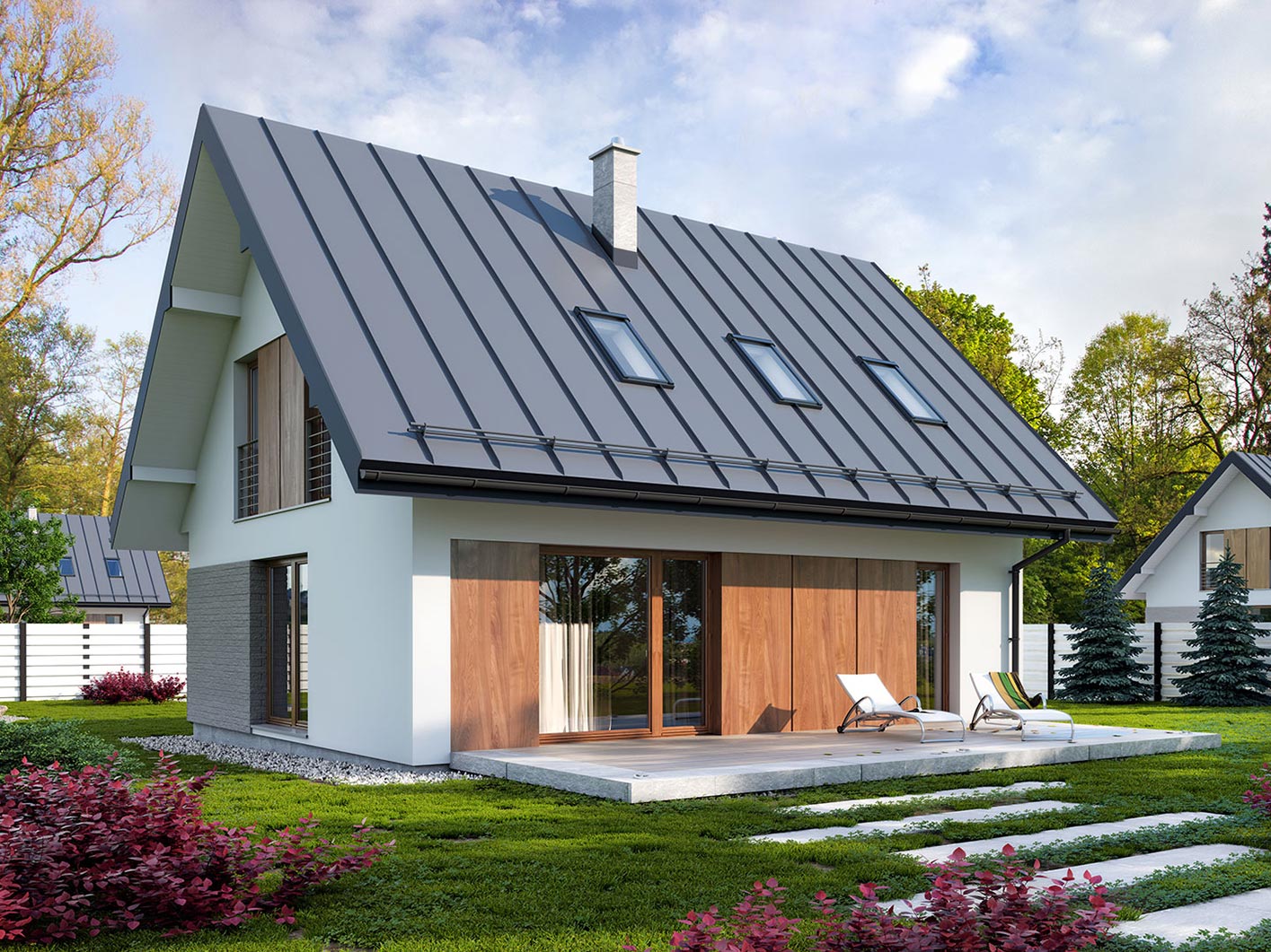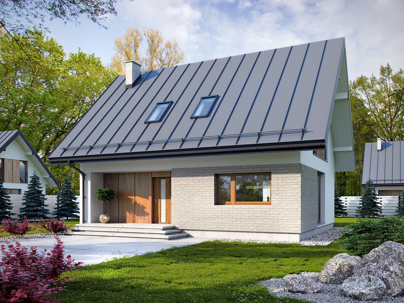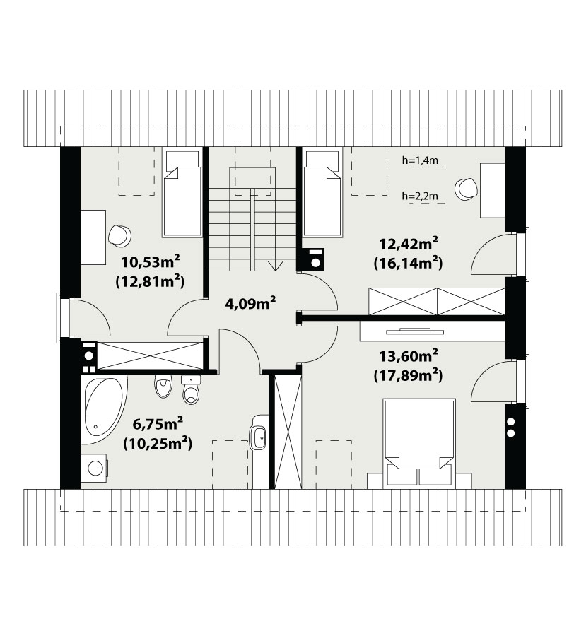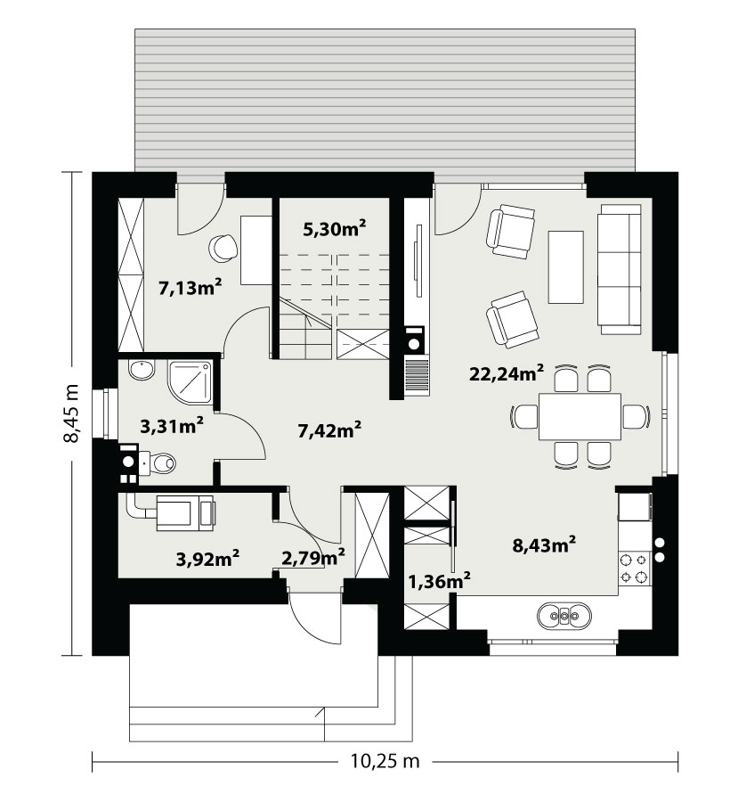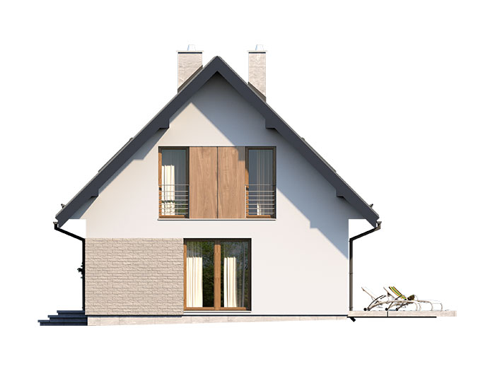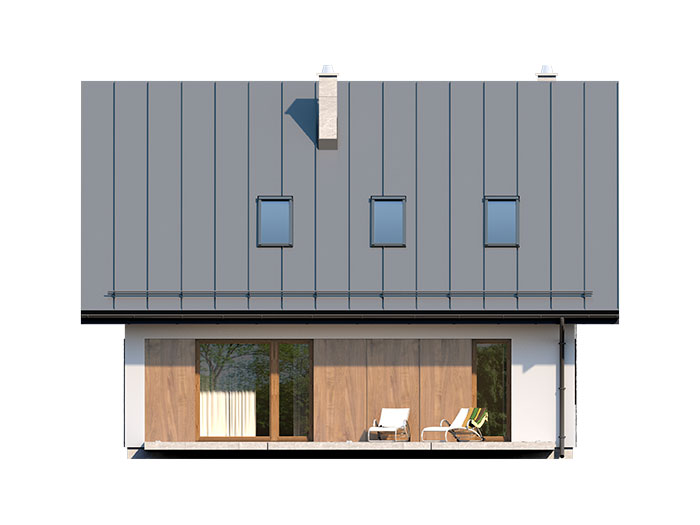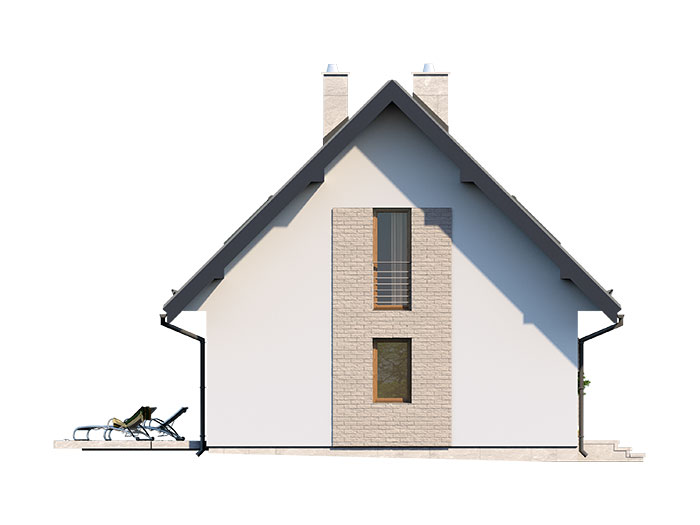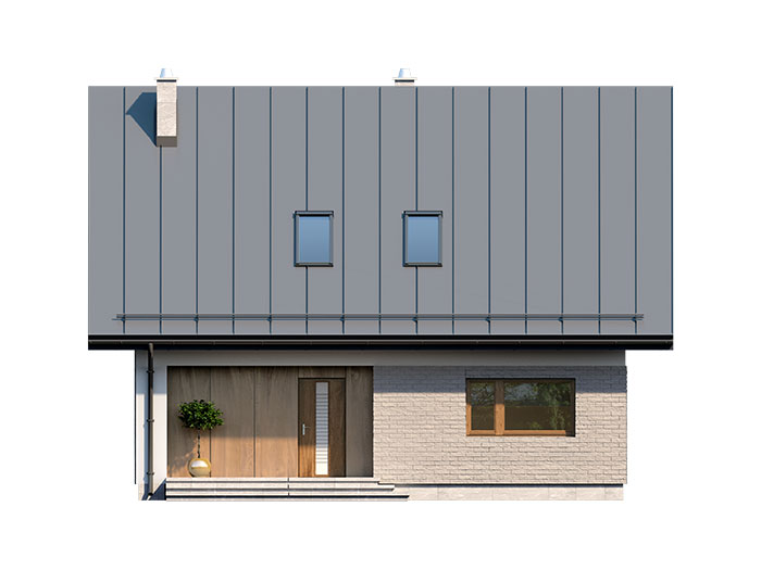 Prosty, ale zarazem interesujący dom o niewielkich gabarytach. Bardzo funkcjonalny układ pomieszczeń zapewnia optymalny komfort 4-osobowej rodzinie. Na parterze zaprojektowano kuchnię ze spiżarnią, salon, kotłownię i łazienkę. Atutem tego projektu, przy tak niewielkiej powierzchni użytkowej jest dodatkowy pokój na parterze, który może pełnić rolę gabinetu. Na poddaszu przewidziano 3 sypialnię oraz łazienkę. Elegancki styl tego budynku uzyskano poprzez połączenie klasycznej bryły domu jednorodzinnego z nowoczesnymi elewacjami i materiałami oraz z delikatnym detalem.