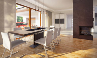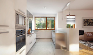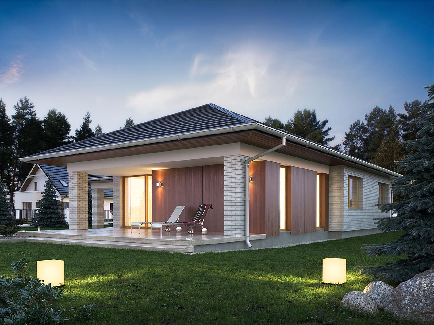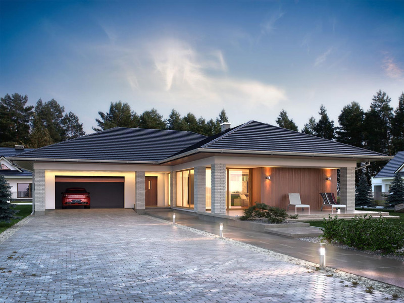Parterowy dom jednorodzinny, niepodpiwniczony z dwustanowiskowym garażem. Jest to wygodny , funkcjonalny dom, który swoim pełnym programem zapewnia optymalny komfort 4-osobowej rodzinie. Przestronna część dzienna to salon połączony z jadalnią, otwierający się na ogród poprzez ogromne przeszklenie oraz otwarta kuchnia wraz z półwyspem i ze spiżarnią. Tak zaproponowany, ciekawy i przestronny układ pomieszczeń umożliwia szereg aranżacji. Część nocna to 3 wygodne sypialnie oraz przestronna łazienka. W domu zaprojektowano dużą kotłownię dostępną z garażu, której parametry pozwalają na montaż kotła na każdy rodzaj paliwa, w tym na paliwo stałe. Sam garaż, którego wielkość przekracza parametry standardowego garażu dwustanowiskowego, umożliwia umieszczenie tam np. kosiarki. Ten optymalny i ciekawy program funkcjonalny został ujęty w prostej bryle na rzucie litery L, przykrytej wielospadowym dachem. Atutem projektu jest jego prostota zarówno w układzie pomieszczeń jak i w rozwiązaniach elewacji, gdzie elegancki, nowoczesny styl osiągnięto poprzez klasyczne, proste ale szlachetne materiały oraz delikatny, subtelny detal.