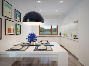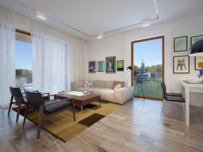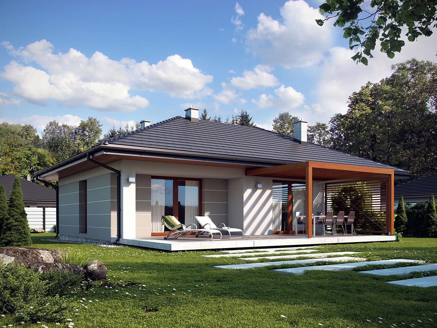 Nieduży jednorodzinny budynek mieszkalny, parterowy, niepodpiwniczony z jednostanowiskowym garażem. Funkcjonany układ pomieszczeń zapewnia komfort 3-osobowej rodzinie. Ergonomicznie i optymalnie rozplanowana przestrzeń została wyraźnie podzielona na część dzienną, nocną i gospodarczą. Część reprezentacyjna domu, to przestronny salon połączony z jadalnią, który otwiera się na duży, zadaszony taras oraz kuchnia. Oprócz części dziennej, zaprojektowano dwie sypialnie i dużą łazienkę, które stanowią część intymną domu. Duża kotłownia, garaż oraz pomieszczenie gospodarcze mogące pełnić funkcje spiżarni i pralni przewidziano w części gospodarczej domu. Wymiary kotłowni umożliwiają montaż kotła na każdy rodzaj paliwa. Rzut budynku powstał w oparciu o rzut prostokąta, zaś sam dom został przykryty dachem wielospadowym. Dom tym samym jest tani i prosty w budowie oraz niedrogi w utrzymaniu i eksploatacji.
