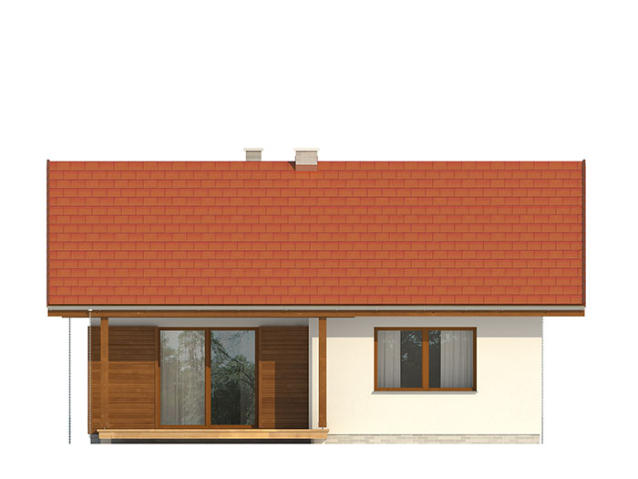 Nieduży jednorodzinny budynek mieszkalny, parterowy, zaprojektowany w technologii szkieletu drewnianego. Ergonomiczny i optymalny układ pomieszczeń zapewnia komfort 3-osobowej rodzinie. Funkcjonalnie rozplanowana przestrzeń została wyraźnie podzielona na część dzienną i nocną. Część reprezentacyjna domu, to przestronny salon połączony z jadalnią, który otwiera się na duży, zadaszony taras oraz kuchnia. Oprócz części dziennej, zaprojektowano dwie sypialnie i dużą łazienkę, które stanowią część intymną domu. Wymiary kotłowni umożliwiają montaż kotła na każdy rodzaj paliwa. Sama bryła budynku nawiązuje do archetypu domu jednorodzinnego. Rzut budynku powstał w oparciu o rzut prostokąta, zaś sam dom został przykryty dachem dwuspadowym. Dom tym samym jest tani i prosty w budowie oraz niedrogi w utrzymaniu i eksploatacji. Projekt dostępny jest również w technologii murowanej.