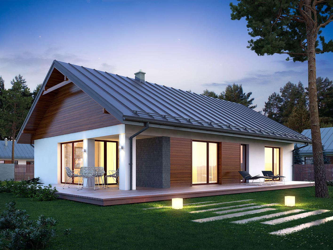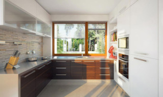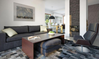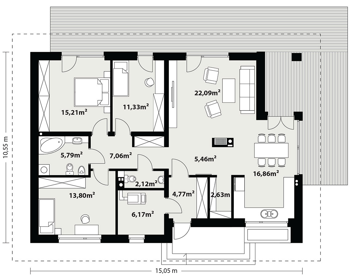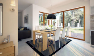 Parterowy dom jednorodzinny, łączący nowoczesny charakter elewacji z prostym, klasycznym układem pomieszczeń. Jest to bardzo wygodny , prosty i funkcjonalny dom, który swoim pełnym programem zapewnia optymalny komfort 4-osobowej rodzinie. Przestronna część dzienna to duży salon, jadalnia otwierająca się na ogród poprzez ogromne przeszklenie, kuchnia ze spiżarnią oraz wc. Atutem projektu jest zadaszony taras. Tak zaproponowany, ciekawy i przestronny układ pomieszczeń umożliwia szereg aranżacji. Część nocna to 3 wygodne sypialnie, z czego dwie posiadają wyjście na taras oraz przestronna łazienka. W domu zaprojektowano dużą kotłownię dostępną z wiatrołapu, której parametry pozwalają na montaż kotła na każdy rodzaj paliwa, w tym na paliwo stałe. Ten optymalny i ciekawy program funkcjonalny został ujęty w prostej bryle na rzucie prostokąta, przykrytej dwuspadowym dachem. Atutem projektu jest jego prostota zarówno w układzie pomieszczeń jak i w rozwiązaniach elewacji, gdzie elegancki, nowoczesny styl osiągnięto poprzez klasyczne, proste ale szlachetne materiały oraz delikatny, subtelny detal.