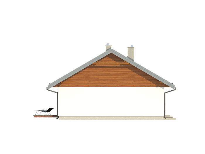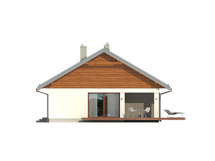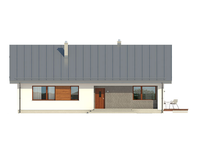 Parterowy dom jednorodzinny, niepodpiwniczony, zaprojektowany w technologii szkieletu drewnianego. Łączy w sobie nowoczesny charakter elewacji z prostym, klasycznym układem pomieszczeń. Jest to bardzo wygodny , prosty i funkcjonalny dom, który swoim pełnym programem zapewnia optymalny komfort 4-osobowej rodzinie. Przestronna część dzienna to duży salon, jadalnia otwierająca się na ogród poprzez ogromne przeszklenie, kuchnia ze spiżarnią oraz wc. Atutem projektu jest zadaszony taras. Tak zaproponowany, ciekawy i przestronny układ pomieszczeń umożliwia szereg aranżacji. Część nocna to 3 wygodne sypialnie, z czego dwie posiadają wyjście na taras oraz przestronna łazienka. W domu zaprojektowano dużą kotłownię dostępną z wiatrołapu, której parametry pozwalają na montaż kotła na każdy rodzaj paliwa, w tym na paliwo stałe. Ten optymalny i ciekawy program funkcjonalny został ujęty w prostej bryle na rzucie prostokąta, przykrytej dwuspadowym dachem. Atutem projektu jest jego prostota zarówno w układzie pomieszczeń jak i w rozwiązaniach elewacji, gdzie elegancki, nowoczesny styl osiągnięto poprzez klasyczne, proste ale szlachetne materiały oraz delikatny, subtelny detal.