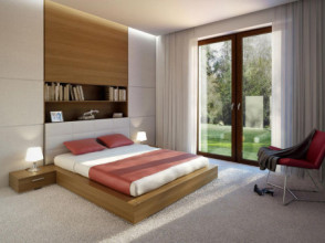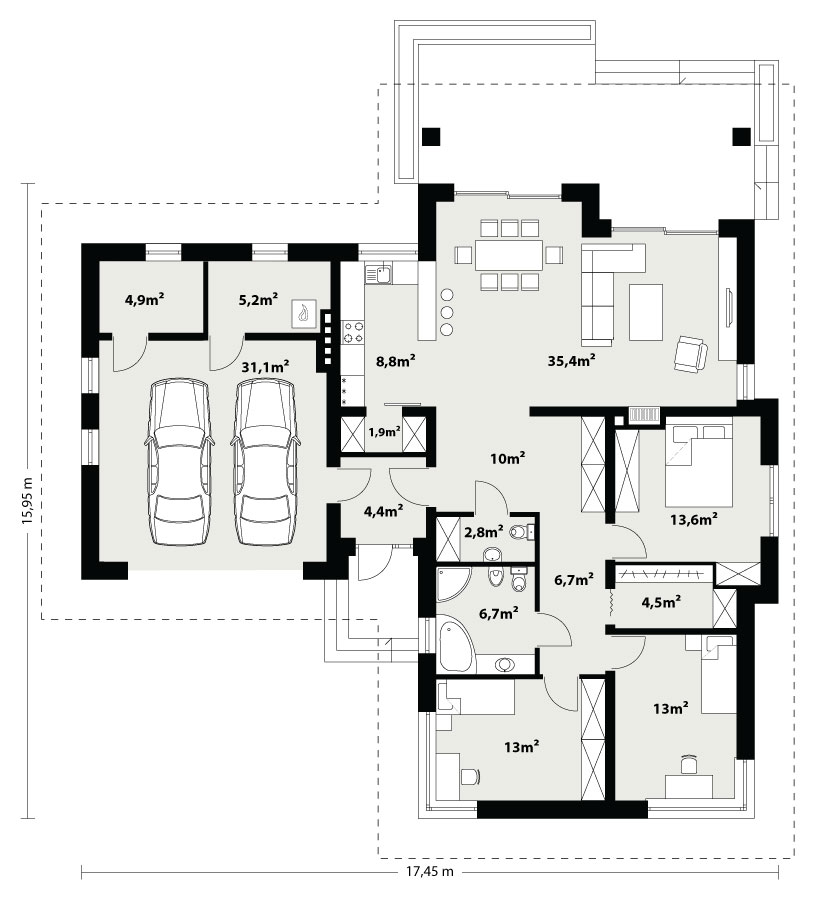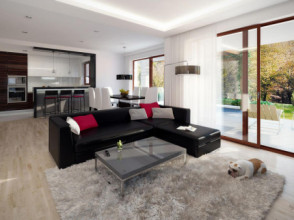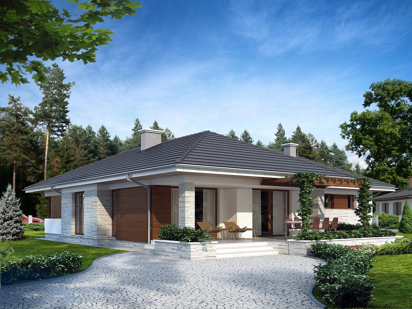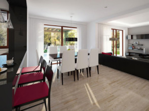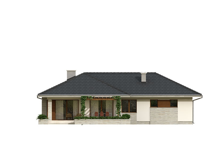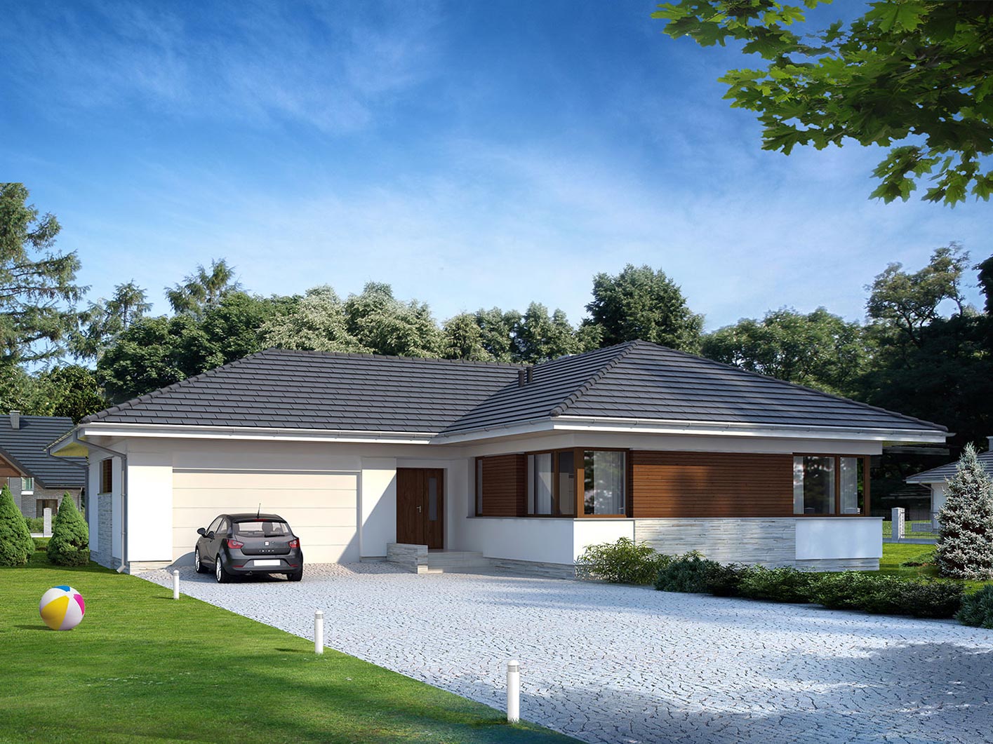 Dom jednorodzinny, parterowy, niepodpiwniczony, z dwustanowiskowym garażem. Wygodny, z przestronną i otwartą częścią dzienną oraz wydzieloną częścią nocną z trzema sypialniami, łazienką i garderobą. Posiada duże przeszklenia w salonie i jadalni z wyjściami na zadaszony taras. Kominek w salonie jest zgrabnie schowany w ścianę przez co nie pomniejsza go. Kuchnia posiada spiżarnię, w domu dodatkowo przewidziano wiele miejsca na szafy i schowki. Duża kotłownia oraz pomieszczenie na skład opału pozwola na montaż kotła na dowolny rodzaj paliwa. Dostępna jest również wersja z kątem dachu 30 stopni