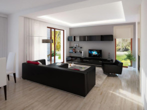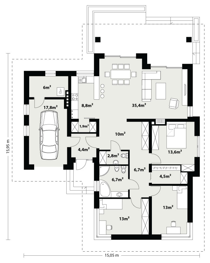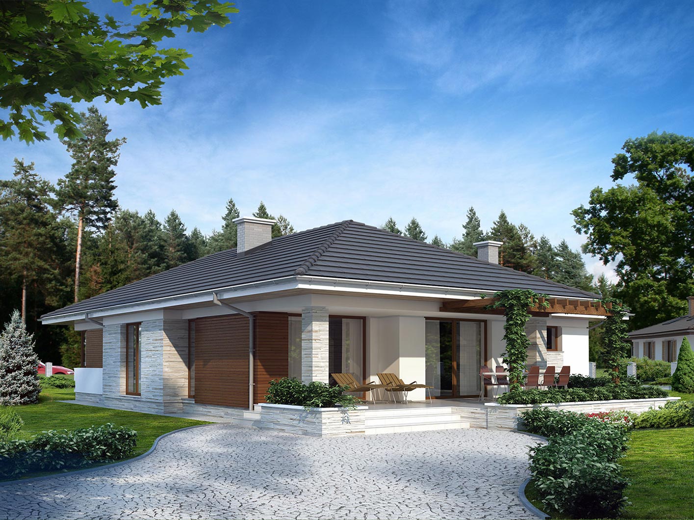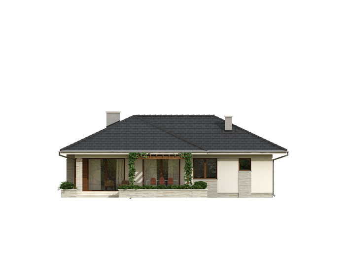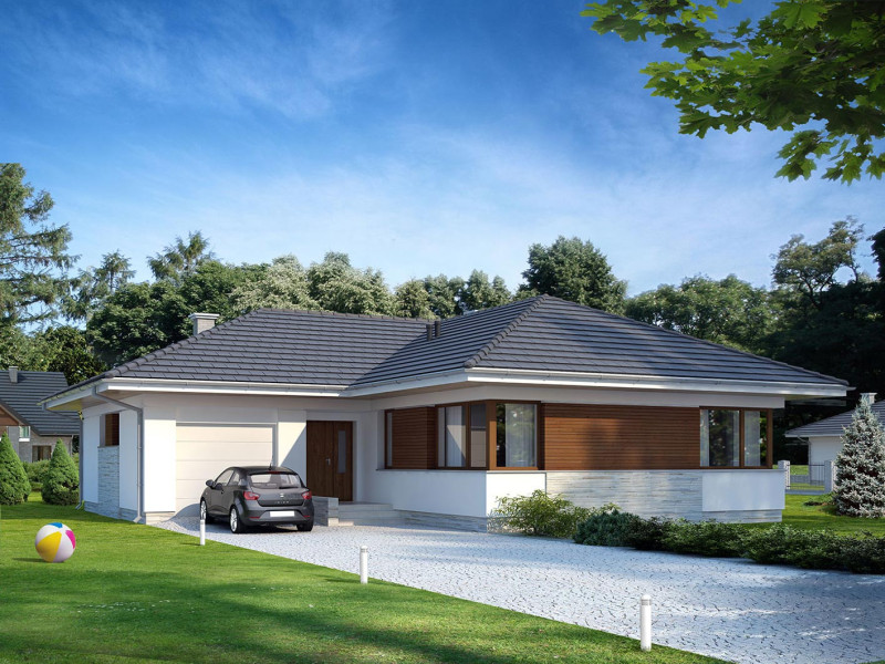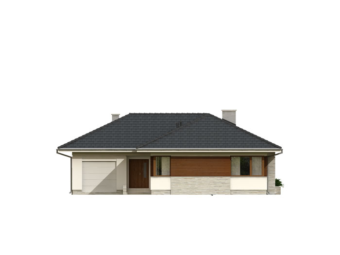 Dom jednorodzinny, parterowy, niepodpiwniczony, z garażem. Wygodny, z przestronną i otwartą częścią dzienną oraz wydzieloną częścią nocną z trzema sypialniami, łazienką i garderobą. Posiada duże przeszklenia w salonie i jadalni z wyjściami na zadaszony taras. Kominek w salonie jest zgrabnie schowany w ścianę przez co nie pomniejsza go. Kuchnia posiada spiżarnię, w domu dodatkowo przewidziano wiele miejsca na szafy i schowki. Duża kotłownia pozwola na montaż kotła na dowolny rodzaj paliwa.