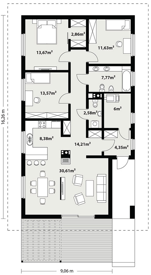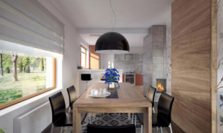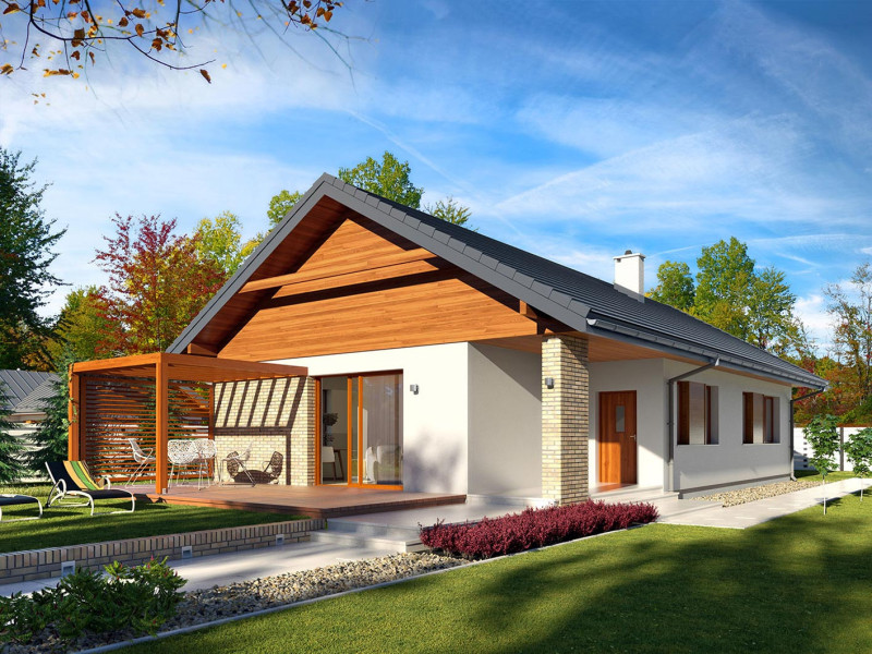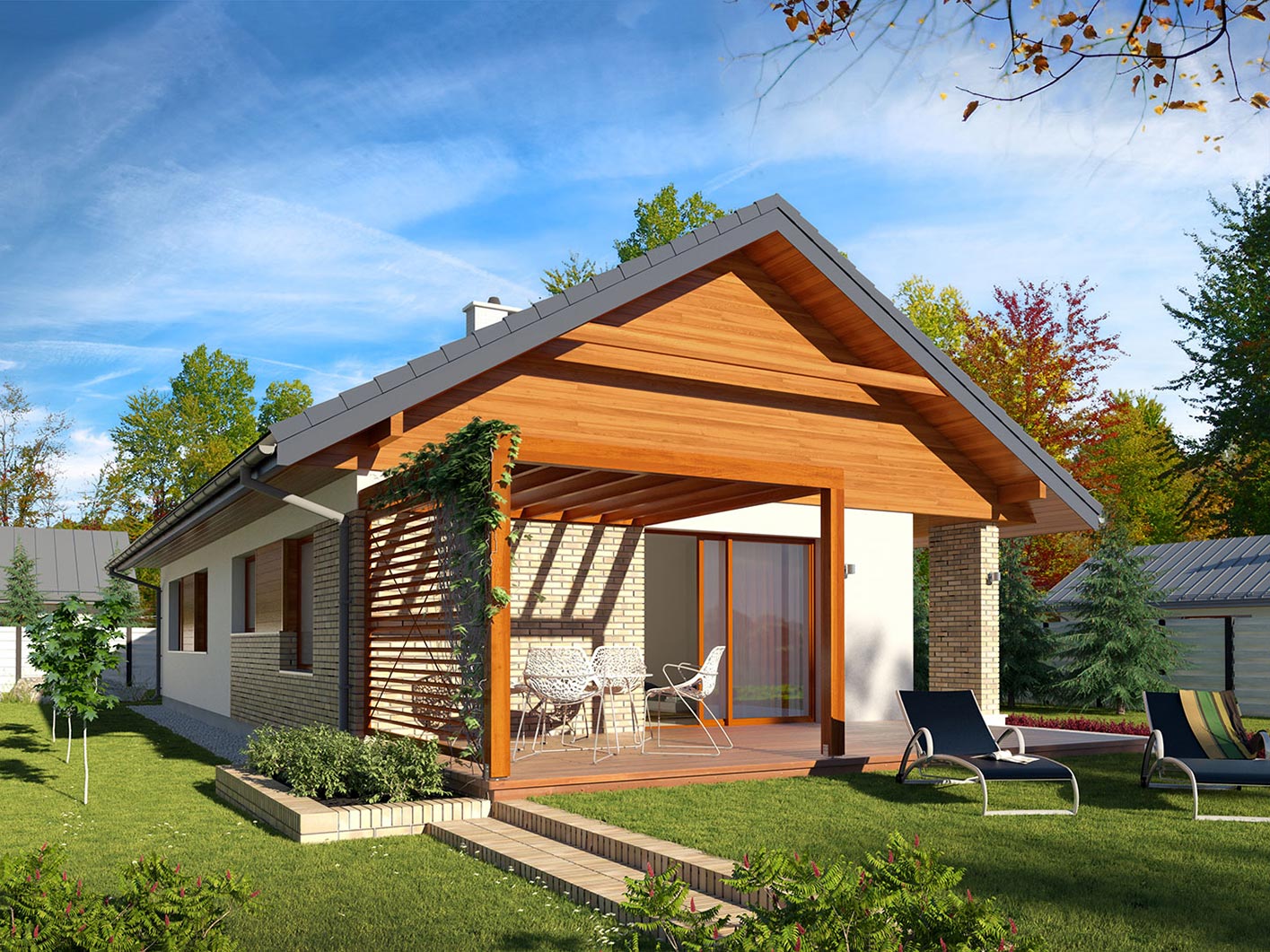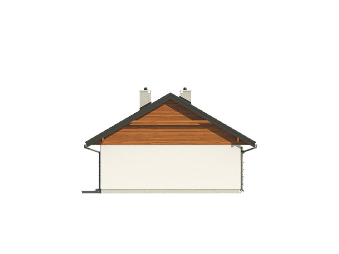 Parterowy dom jednorodzinny zaprojektowany na wąską działkę z wejściem od południa, zaprojektowany w technologii szkieletu drewnianego. W prostej bryle przykrytej dwuspadowym dachem zawiera się fukncjonalne i wygodne wnętrze. Od strony wejścia zaprojektowano dużą przestrzeń dzienną z otwartą kuchnią, jadalnią i salonem z przeszklonym wyjściem na taras. Dom ten zapewni wygodę 4-osobowej rodzinie oferując 3 wygodne sypialnie, łazienkę i wc. Sporo miejsca przewidziano też na szafy i schowki. Kotłownia umożliwia zastosowanie kotła na dowolny rodzaj paliwa a jej powierzchnię można dodatkowo powiększyć kosztem pomieszczeń sąsiednich przesuwając ściany działowe. Jest to prosty dom, tani w budowie i późniejszej eksploatacji. Projekt dostępny również w wersji murowanej