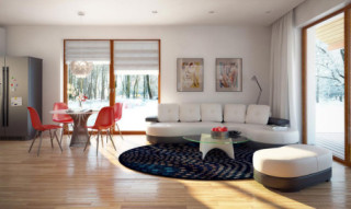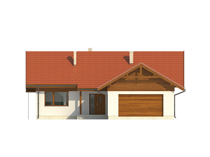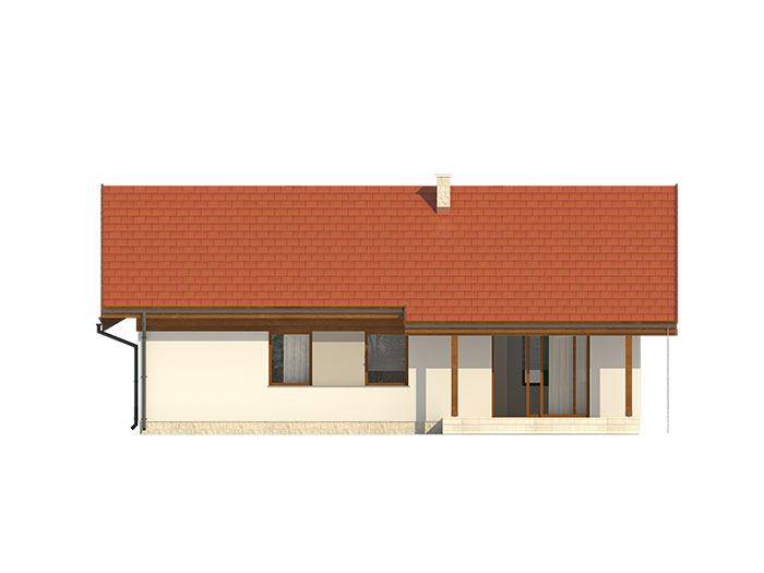 Niewielki jednorodzinny budynek mieszkalny, parterowy, niepodpiwniczony z dwustanowiskowym garażem. W swojej niewielkiej formie zawarł wygodny i optymalny układ pomieszczeń, który zapewni komfort 4-osobowej rodzinie. Funkcjonalnie rozplanowana przestrzeń została wyraźnie podzielona na część dzienną i nocną. Część reprezentacyjna domu, to przestronny salon połączony z jadalnią, który otwiera się na duży zadaszony taras, kuchnia wzbogacona o spiżarnię oraz wc. Oprócz części reprezentacyjnej, zaprojektowano trzy sypialnie i dużą łazienkę stanowiącą cześć intymną domu, oraz dużą kotłownię i dwustanowiskowy garaż w części gospodarczej. Wymiary kotłowni umożliwiają montaż kotła na każdy rodzaj paliwa, w tym na paliwo stałe. Sama bryła budynku nawiązuje do archetypu domu jednorodzinnego. Dom tym samym jest tani i prosty w budowie oraz niedrogi w utrzymaniu i eksploatacji.