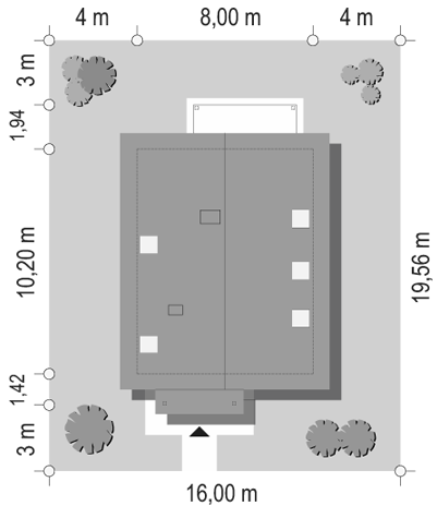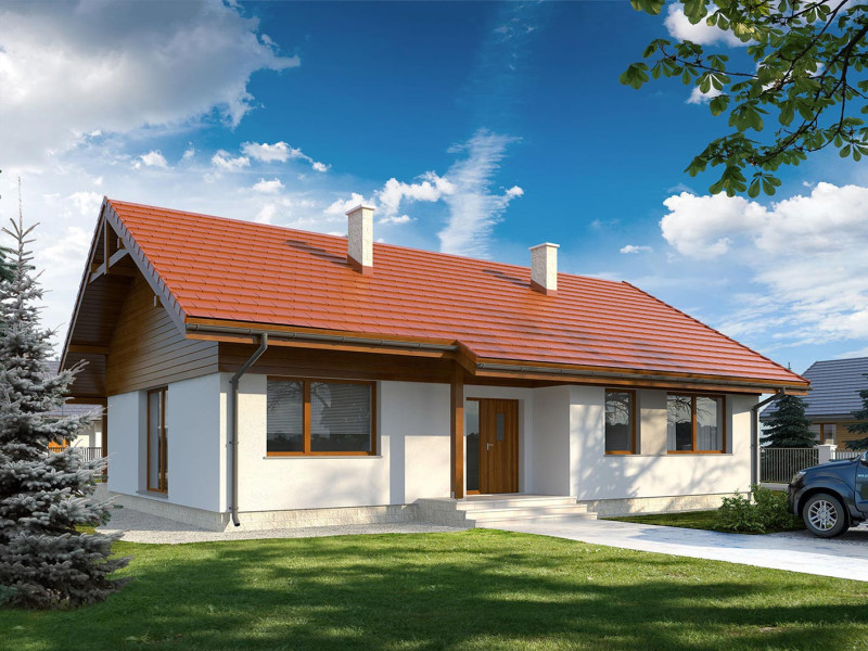 Niewielki jednorodzinny budynek mieszkalny, parterowy, niepodpiwniczony. W swojej niewielkiej formie zawarł wygodny i optymalny układ pomieszczeń, który zapewni komfort 4-osobowej rodzinie. Funkcjonalnie rozplanowana przestrzeń została wyraźnie podzielona na część dzienną i nocną. Część reprezentacyjna domu, to przestronny salon połączony z jadalnią, który otwiera się na duży zadaszony taras, kuchnia wzbogacona o spiżarnię. Oprócz części reprezentacyjnej, zaprojektowano trzy sypialnie i dużą łazienkę stanowiącą cześć intymną domu, oraz dużą kotłownię w części gospodarczej. Wymiary kotłowni umożliwiają montaż kotła na każdy rodzaj paliwa, w tym na paliwo stałe. Sama bryła budynku nawiązuje do archetypu domu jednorodzinnego. Rzut budynku powstał w oparciu o rzut prostokąta, zaś sam dom został przykryty dachem dwuspadowym. Dom tym samym jest tani i prosty w budowie oraz niedrogi w utrzymaniu i eksploatacji.