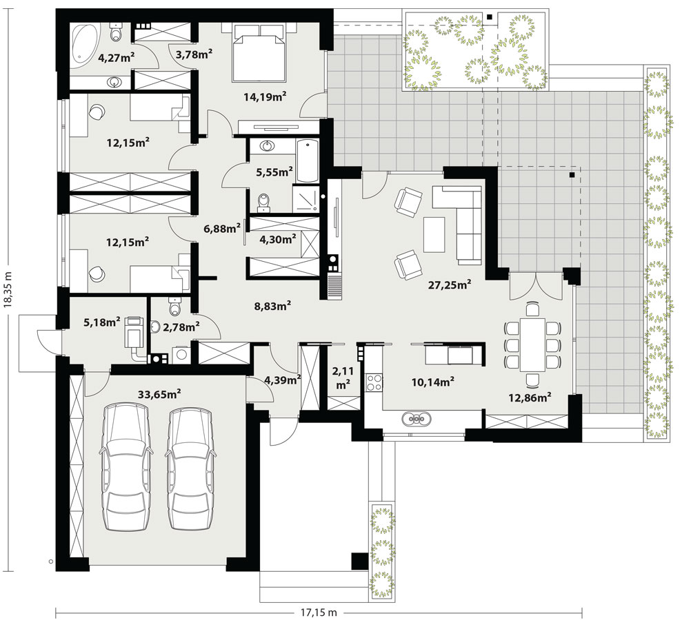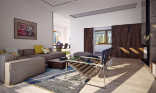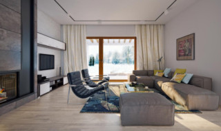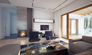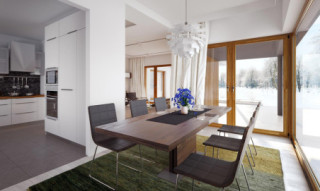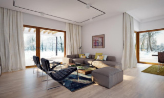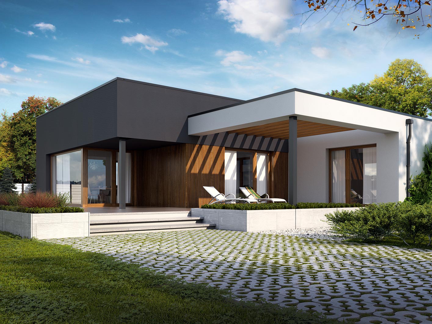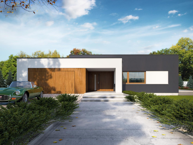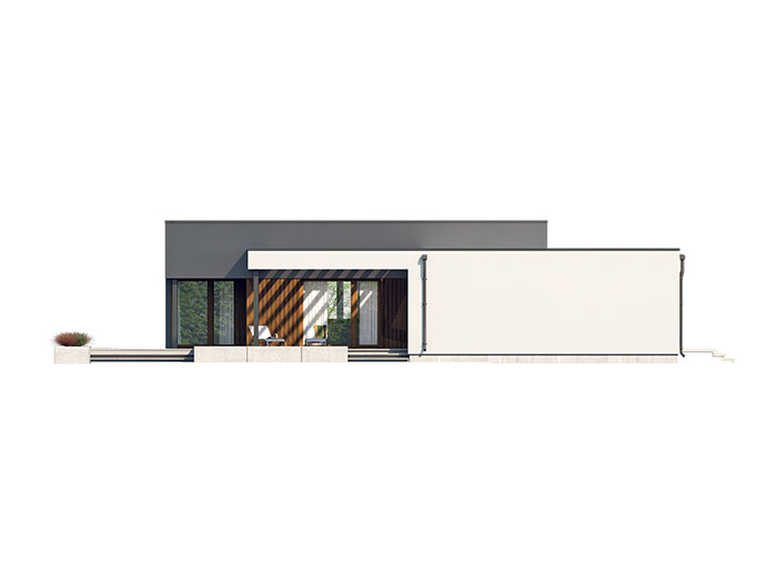 Nowoczesny, parterowy dom jednorodzinny, niepodpiwniczony z dwustanowiskowym garażem. Wyglądem nawiązuje do nadmorskich, kalifornijskich willi. Swoim pełnym programem funkcjonalnym zapewnia komfort i wygodę 4-osobowej rodzinie. Przestronną część dzienną tworzy salon połączony z jadalnią i otwierający się na ogród poprzez ogromne przeszklenia. Zewnętrznym odbiciem salonu są rozległe tarasy, całkowicie zadaszony lub przykryty drewnianymi belkami w formie pergoli. W części dziennej zaprojektowano również kuchnię, spizarnię i wc. Część nocna to 3 wygodne sypialnie, łazienka oraz garderoba. Dodatkowo główna sypialnia posiada własną garderobę i łazienkę. W domu zaprojektowano dużą kotłownię dostępną z garażu, której parametry pozwalają na montaż kotła na każdy rodzaj paliwa, w tym na paliwo stałe. Ten optymalny i ciekawy program funkcjonalny został ujęty w prostej bryle na rzucie litery T.Atutem projektu jest jego prostota zarówno w układzie pomieszczeń, jak i w rozwiązaniach elewacji, gdzie elegancki, nowoczesny styl osiągnięto poprzez klasyczne, proste ale szlachetne materiały oraz delikatny, subtelny detal.