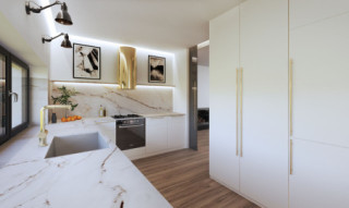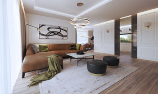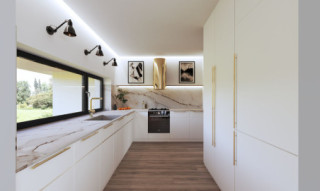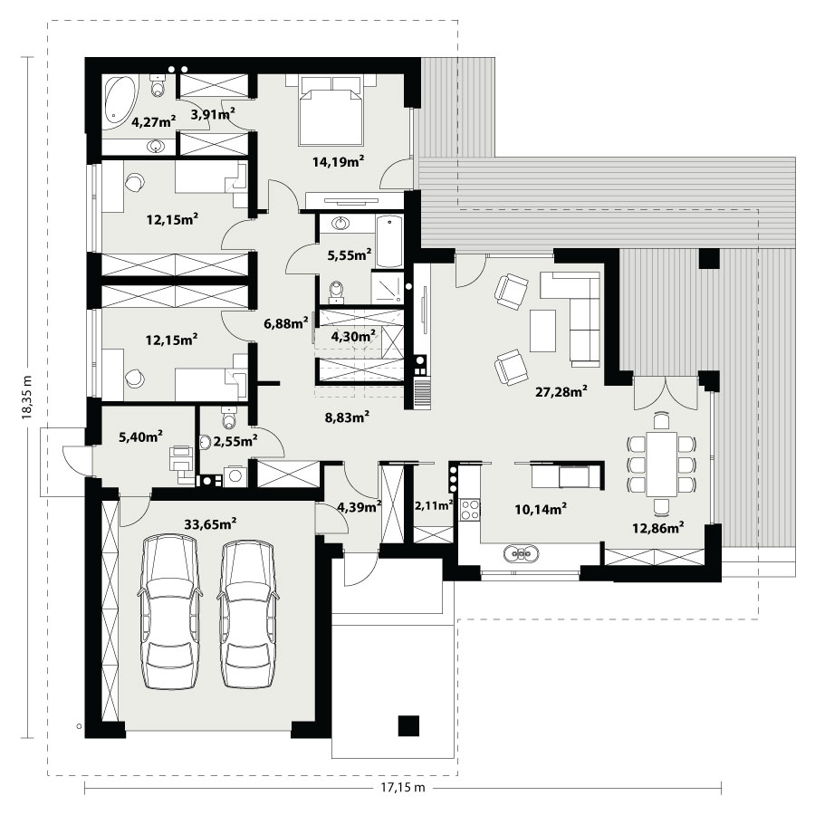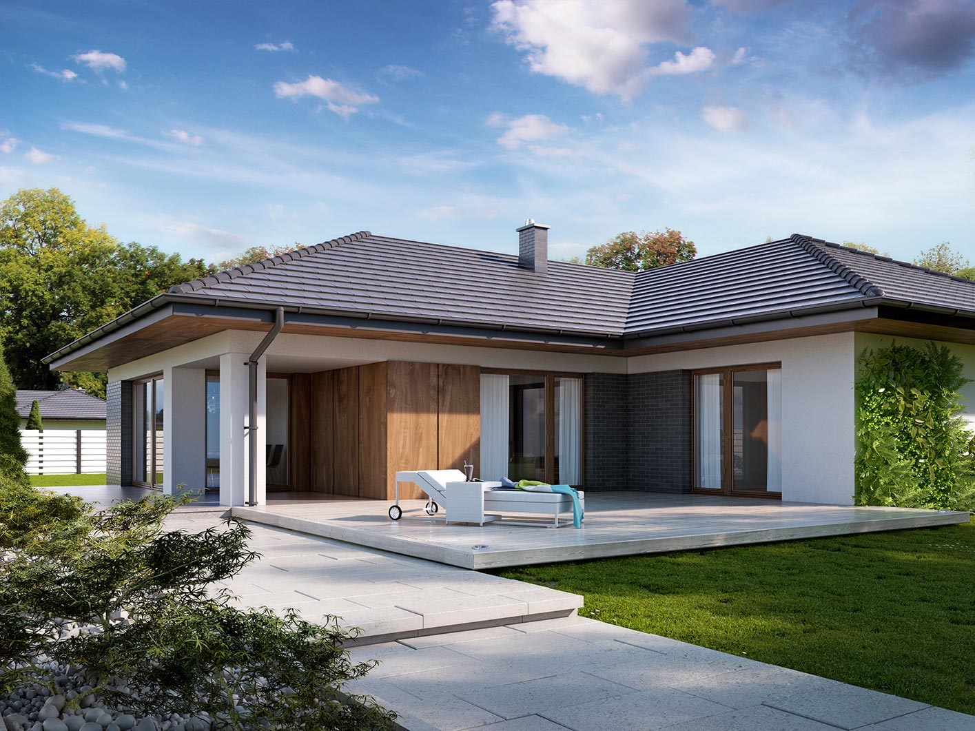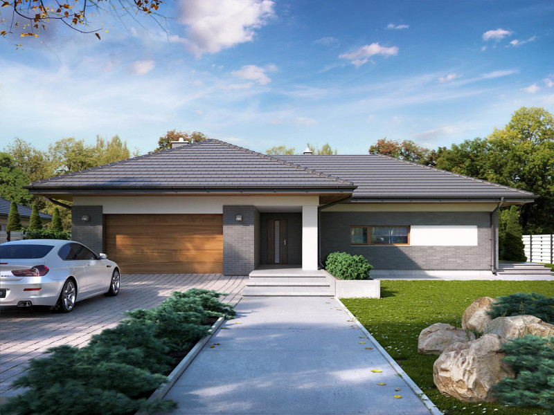 Parterowy dom jednorodzinny, z dwustanowiskowym garażem. Swoim pełnym programem funkcjonalnym zapewnia komfort i wygodę 4-osobowej rodzinie. Przestronna część dzienna to salon połączony z jadalnią, otwierający się na ogród poprzez ogromne przeszklenia, kuchnia ze spiżarnią oraz wc. Część nocna to 3 wygodne sypialnie, łazienka oraz garderoba. Dodatkowo główna sypialnia posiada własną garderobę i łazienkę. W domu zaprojektowano dużą kotłownię dostępną z garażu, której parametry pozwalają na montaż kotła na każdy rodzaj paliwa, w tym na paliwo stałe. Ten optymalny i ciekawy program funkcjonalny został ujęty w prostej bryle na rzucie litery T, przykrytej wielospadowym dachem. Atutem projektu jest jego prostota zarówno w układzie pomieszczeń, jak i w rozwiązaniach elewacji, gdzie elegancki, nowoczesny styl osiągnięto poprzez klasyczne, proste ale szlachetne materiały takie jak szalówka oraz delikatny, subtelny detal.