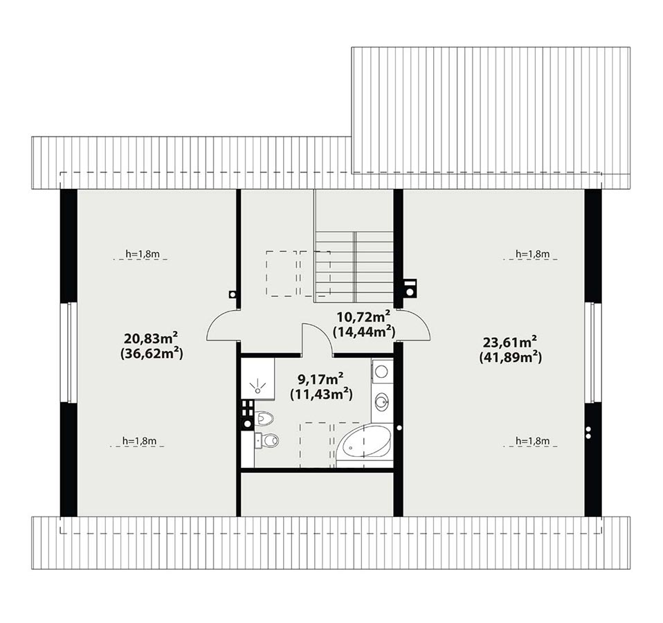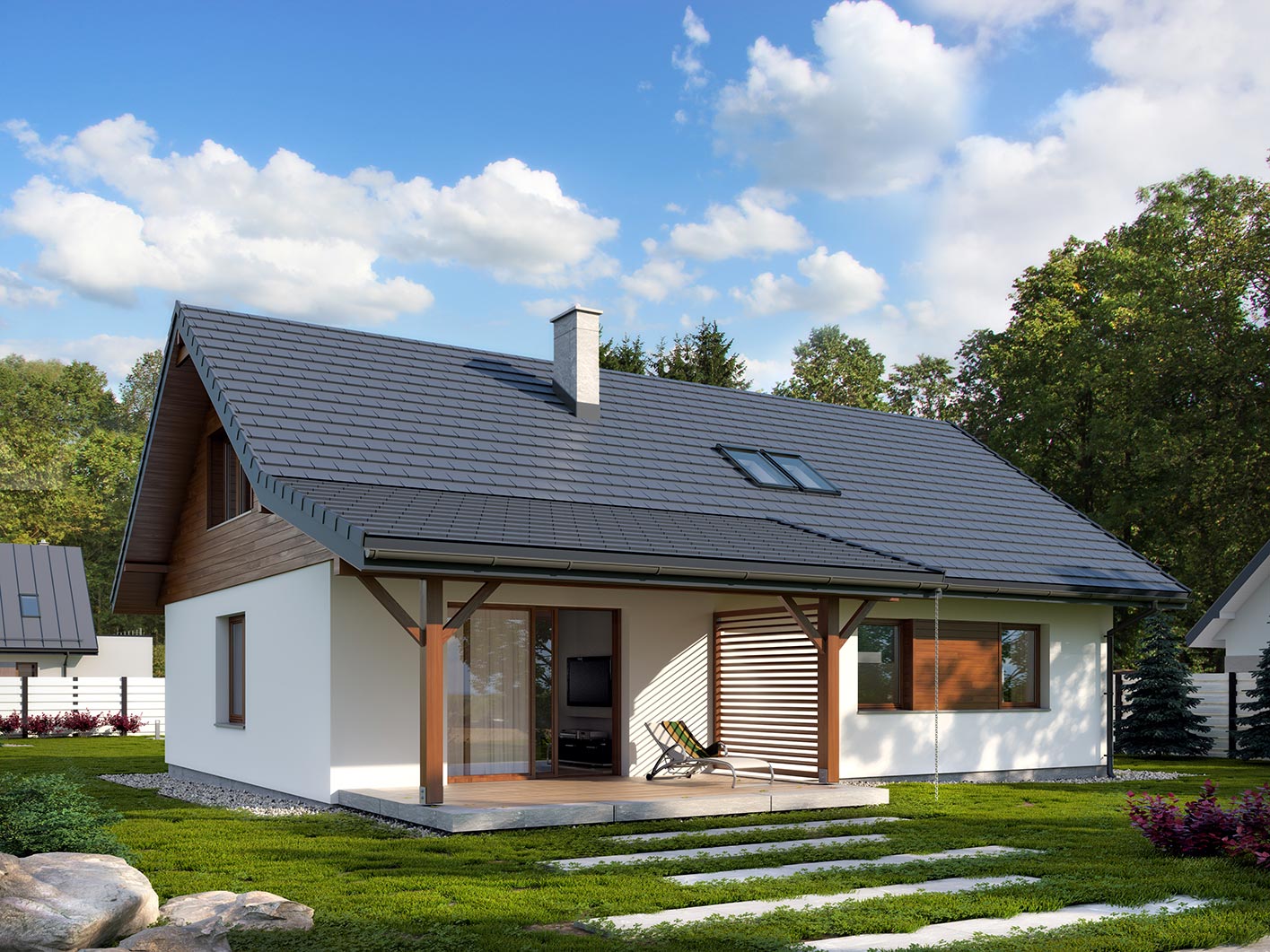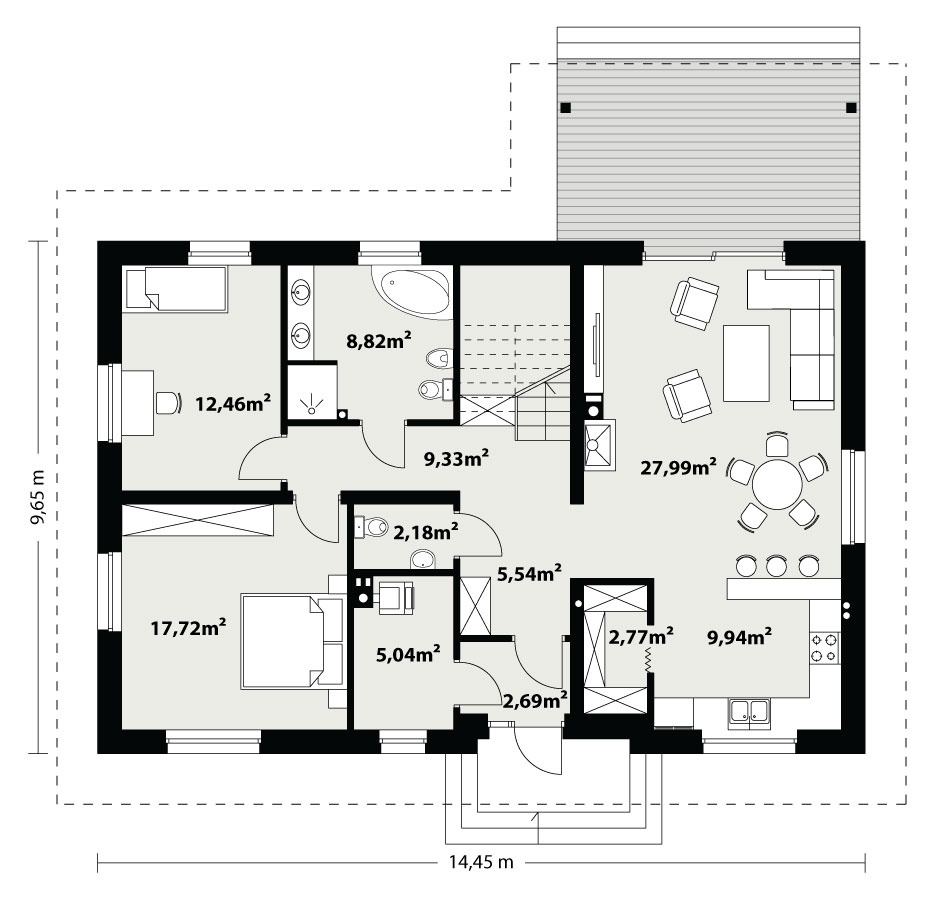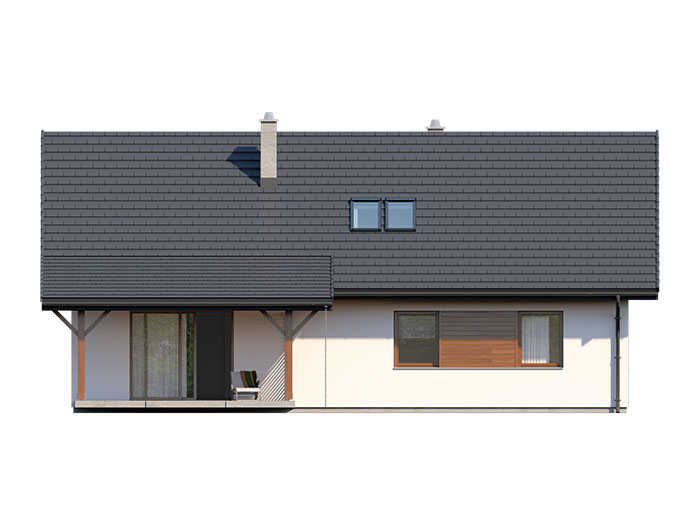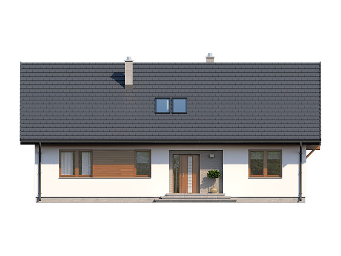 Dom jednorodzinny, parterowy, z poddaszem użytkowym. Wygodny, funkcjonalny, z optymalnie rozplanowaną przestrzenią. Przestronny salon połączony z kuchnią otwiera się na duży, zadaszony taras. W parterze ponadto znadjują się dwie sypialnie, duża łazienka, wc, spiżarnia. Na poddaszu znajdują się dwa duże pokoje oraz łazienka. Dom jest tani i prosty w budowie a przez zastosowanie rozwiązań energooszczędnych również niedrogi w utrzymaniu.