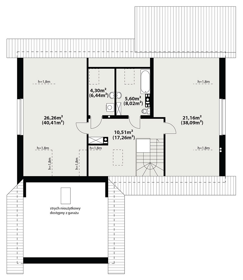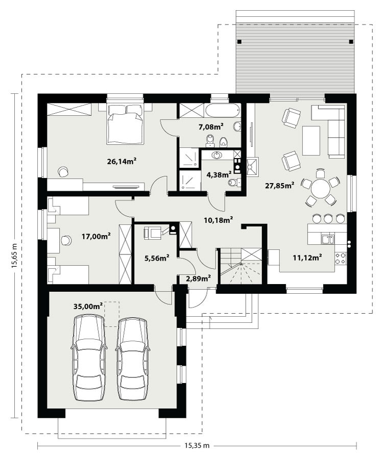Dom jednorodzinny, parterowy, z poddaszem użytkowym i dwustanowiskowym garażem. Wygodny, funkcjonalny, z optymalnie rozplanowaną przestrzenią. Przestronny salon połączony z kuchnią otwiera się na duży, zadaszony taras. W parterze znadjują się dwie sypialnie z czego jedna z łazienką i możliwością wydzielenia garderoby. Poddasze można zagospodarować wydzielając dwie duże sypialnie lub jedną i pokój dzienny połączony z holem. Znajduje się tu też łazienka oraz pralnia. Dom jest tani i prosty w budowie a przez zastosowanie rozwiązań energooszczędnych również niedrogi w utrzymaniu.