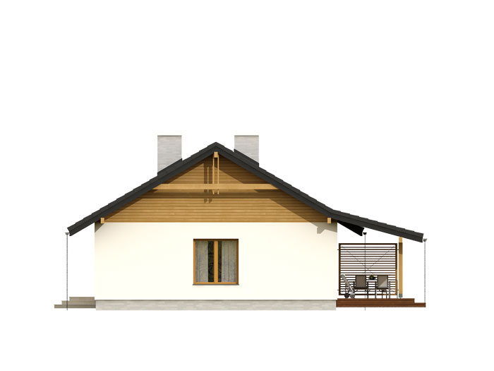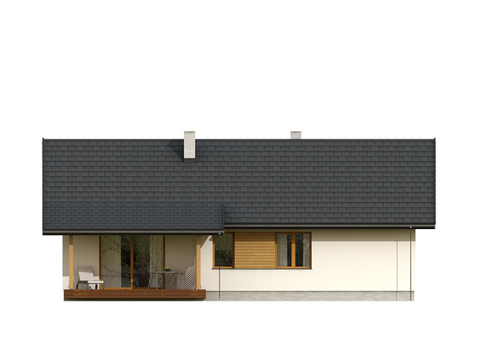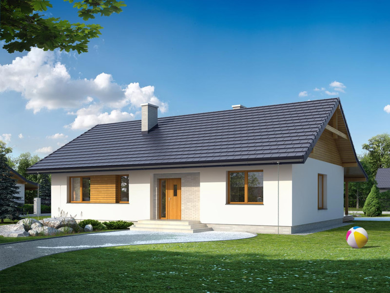 Dom jednorodzinny, parterowy, niepodpiwniczony. Wygodny, funkcjonalny, z optymalnie rozplanowaną przestrzenią. Przestronny salon połączony z kuchnią otwiera się na duży, zadaszony taras. Posiada spiżarnię dostępną z kuchni oraz kotłownię z możliwością zastosowania kotła na paliwo stałe. Dom jest tani i prosty w budowie a przez zastosowanie rozwiązań energooszczędnych również niedrogi w utrzymaniu. Projekt dostępny również w technologii szkieletu drewnianego.