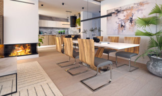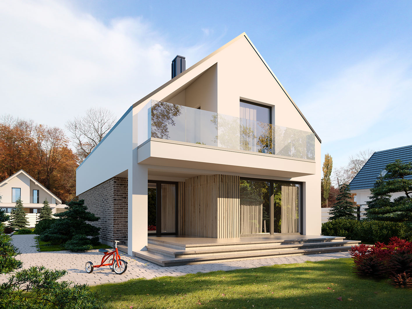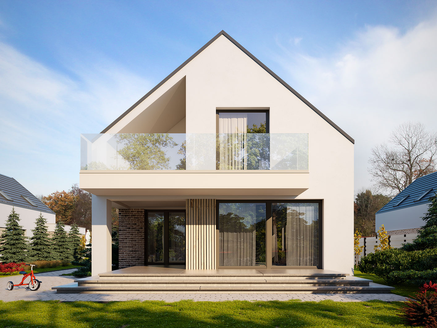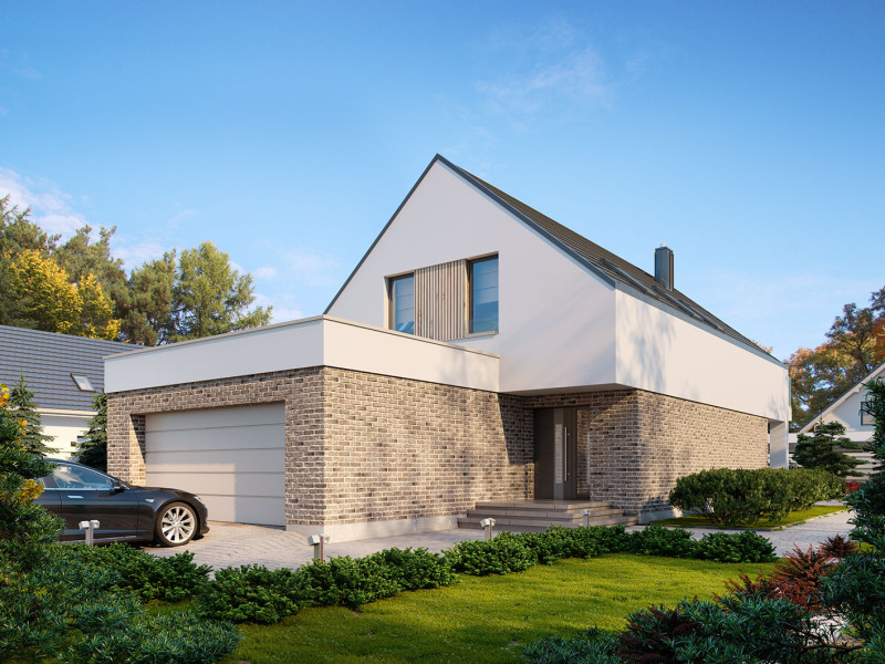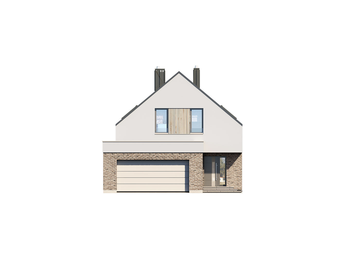 Anaka to jednorodzinny budynek mieszkalny, parterowy z użytkowym poddaszem i dwustanowiskowym garażem. Projekt charakteryzuje się prostą bryłą z dwuspadowym dachem, co czyni go niedrogim w budowie i tanim w eksploatacji. Biały tynk na elewacji został urozmaicony drewnianą szalówką i beżową płytką elewacyjną imitującą cegłę. Grafitowa płaska dachówka, szklane balustrady, biała podsufitka nadają budynkowi nowoczesnego charakteru. Ergonomicznie zaprojektowana i wyraźnie podzielona przestrzeń mieszkalna składa się ze strefy dziennej, nocnej i gospodarczej. Najbardziej reprezentacyjna część domu, to przestronny salon połączony z jadalnią, który otwiera się na duży taras oraz kuchnia ze spiżarnią i łazienką. Oprócz części dziennej przewidziano na parterze dodatkowy pokój, który można wykorzystać na gabinet lub kolejną sypialnię. Na poddaszu przewidziano 3 sypialnie, łazienkę i pralnię. Największa sypialnia ma dodatkowo własną łazienkę i garderobę. Dużą kotłownię, na każdy rodzaj paliwa oraz dwustanowiskowy garaż zlokalizowano w części gospodarczej domu.