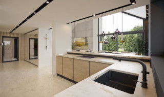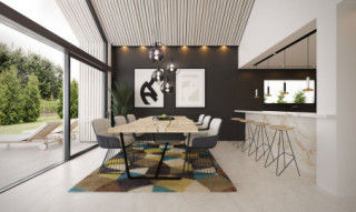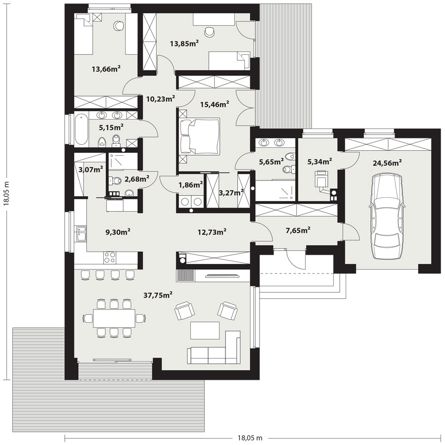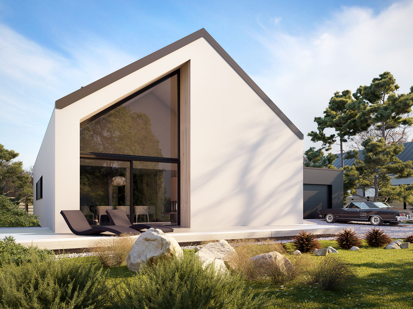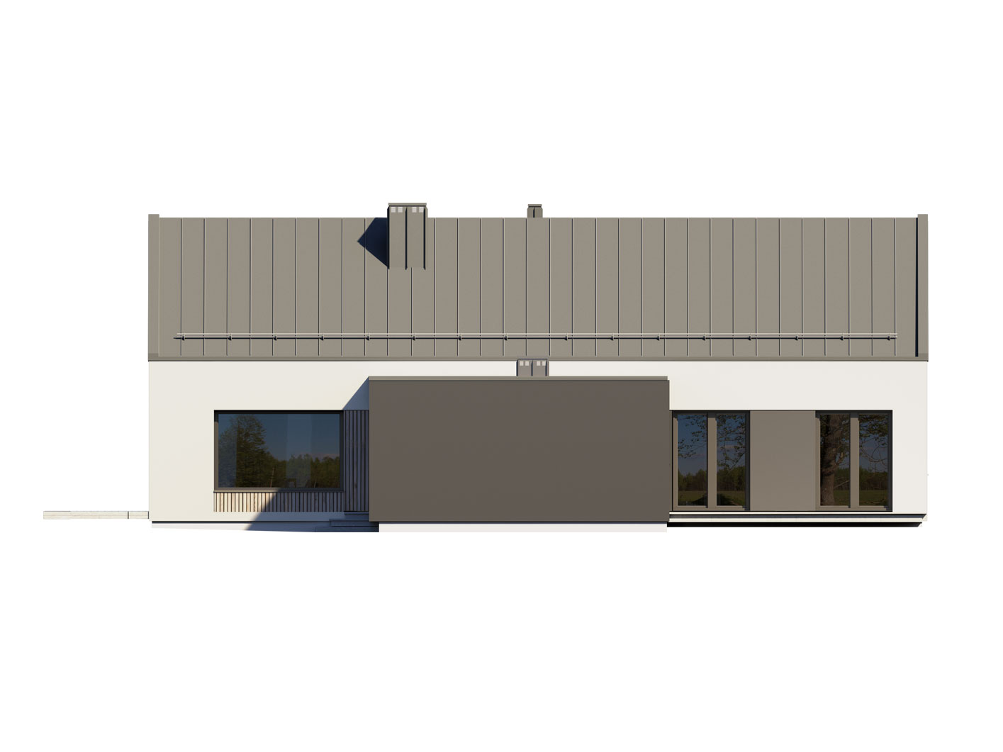 Dom Alani to ciekawa propozycja dla inwestorów ceniących współczesne spojrzenie na architekturę. Projekt ma bardzo interesującą aranżację zewnętrzną i swoim charakterem nawiązuje do stylu nowoczesnej stodoły. W domu Alani główna bryła budynku, która odwołuję się do archetypu domu, na rzucie prostokąta przykrytego dwuspadowym, bezokapowym dachem, zestawiona jest z prostą bryłą garażu i wejścia z płaskim dachem. Nowoczesną stylistykę podkreśla dodatkowo ogromne przeszklenie w części dziennej, stanowiące obok cofniętego wejścia, główny akcent budynku. Współczesny, minimalistyczny charakter domu uzyskano dzięki elewacjom wykończonym kontrastującym ze sobą białym i czarnym tynkiem, urozmaiconym szalówką w kolorze naturalnego drewna, które idealnie komponują się z szarą blachą na rąbek. Dom Alani, który kształtem nawiązuje do tradycyjnych wzorców typowych dla terenów wiejskich, we wnętrzu zachował bardzo przejrzysty i funkcjonalny program użytkowy dla 4-5 osobowej rodziny. Układ domu został podzielony na 3 strefy, gdzie część dzienna to przestronny salon z jadalnią, kuchnia ze spiżarnią i wc. Strefa intymna składa się z 3 sypialni i łazienki, z czego największa sypialnia ma własną garderobę i łazienkę. Część gospodarcza to jednostanowiskowy garaż, kotłownia i pralnia. Niewątpliwym atutem projektu jest zastosowanie dużego tarasu oraz licznych przeszkleń zarówno w części dziennej, jak i w każdej z sypialni, co pozwala na otwarcie domu "na zewnątrz" i cieszenie się z pięknych, naturalnych walorów działki.