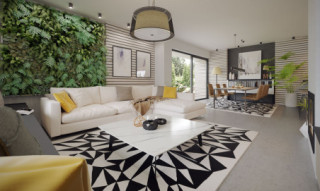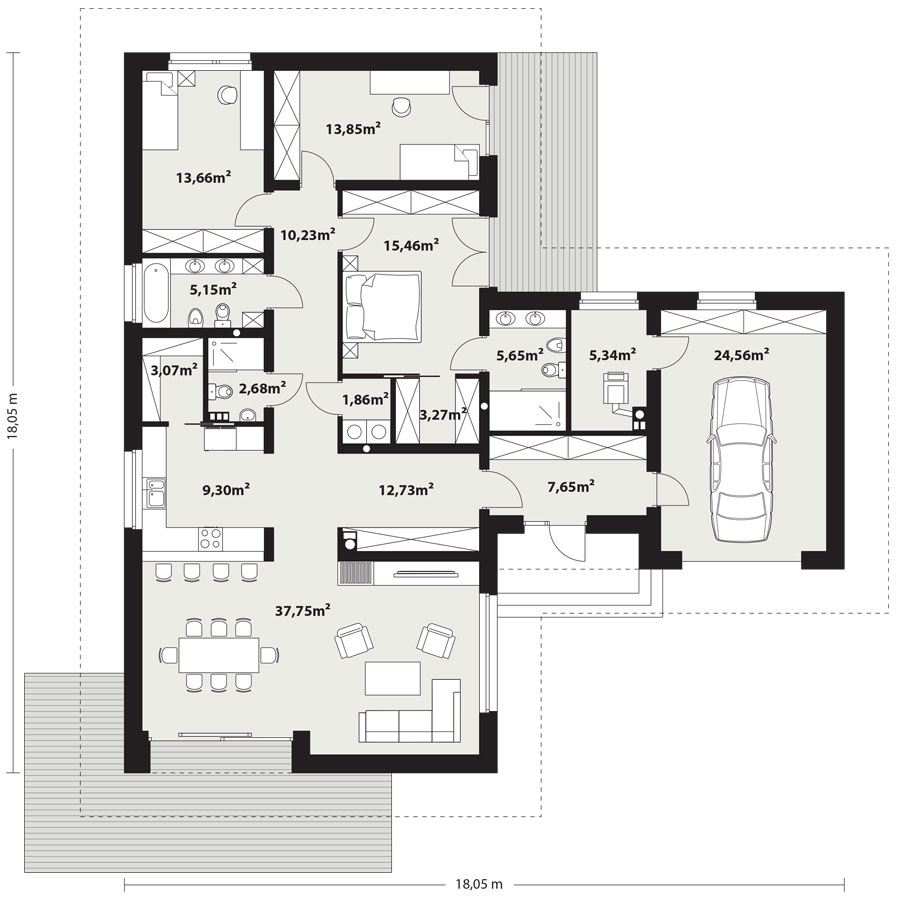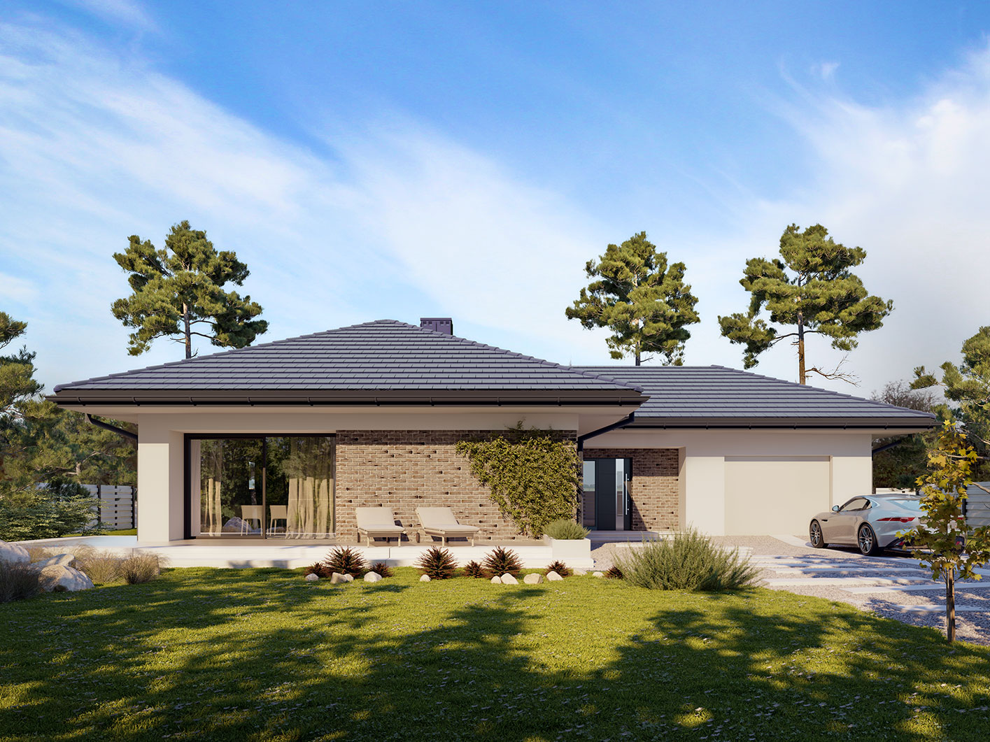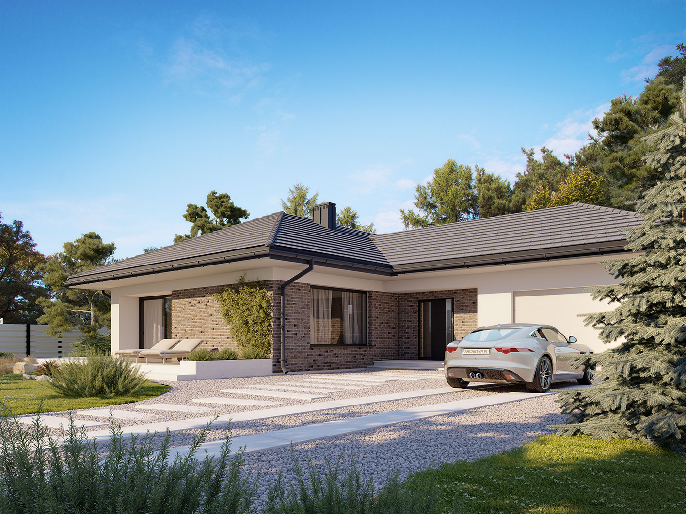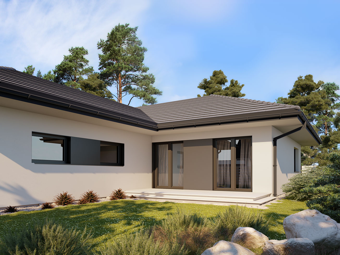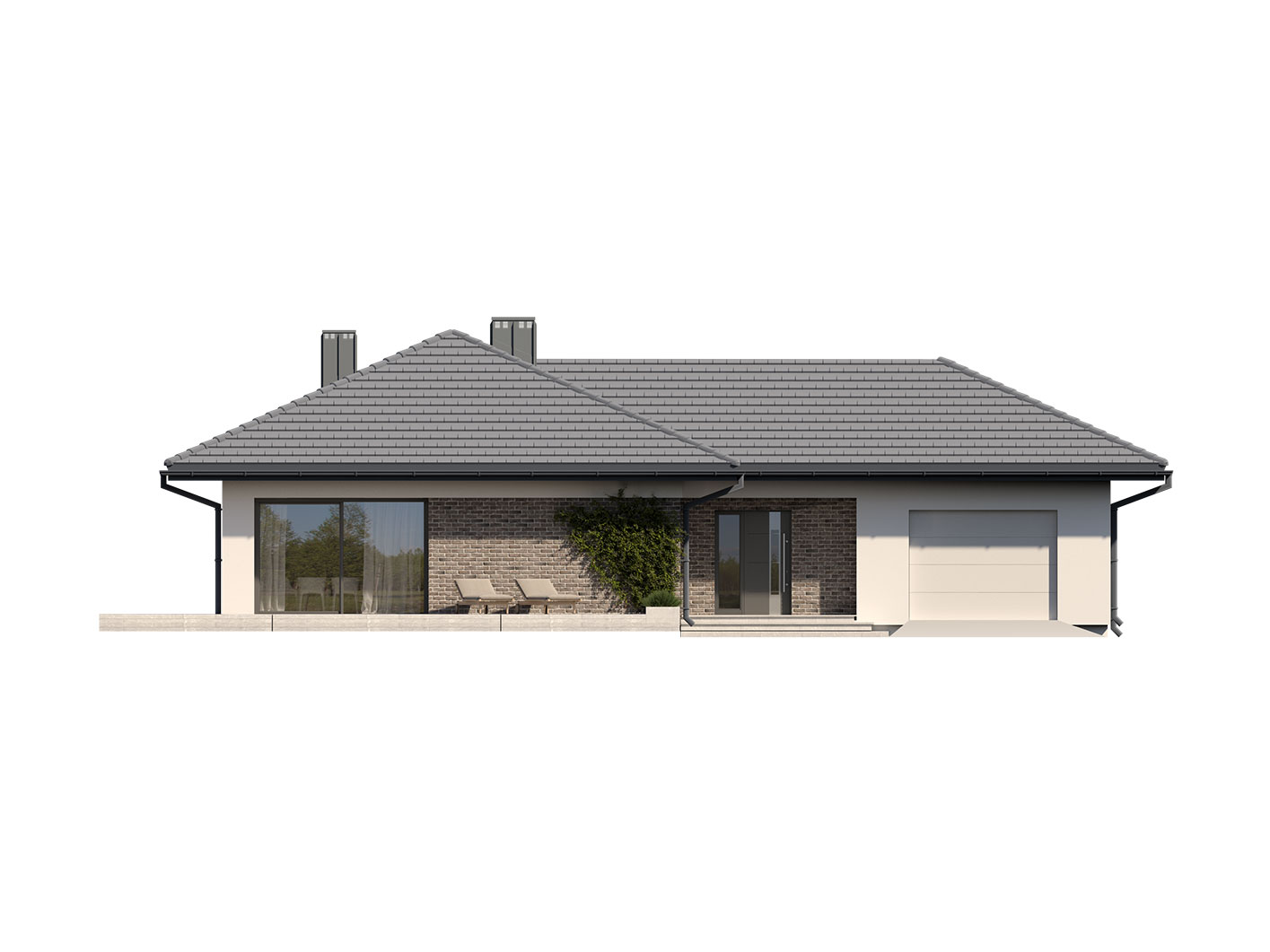 Alan to parterowy dom jednorodzinny, niepodpiwniczony z jednostanowiskowym garażem. Swoim pełnym programem funkcjonalnym zapewnia komfort i wygodę 4-osobowej rodzinie. Przestronna część dzienna to salon połączony z jadalnią, otwierający się na ogród poprzez ogromne przeszklenia, kuchnia ze spiżarnią oraz wc. Część nocna to 3 wygodne sypialnie, łazienka oraz garderoba. Dodatkowo główna sypialnia posiada własną garderobę i łazienkę. W domu zaprojektowano dużą kotłownię dostępną z garażu, której parametry pozwalają na montaż kotła na każdy rodzaj paliwa, w tym na paliwo stałe. Część gospodarczą uzupełnia jeszcze pralnia i garaż. Ten optymalny i ciekawy program funkcjonalny został ujęty w prostej bryle na rzucie litery T, przykrytej wielospadowym dachem. Atutem projektu jest jego prostota zarówno w układzie pomieszczeń, jak i w rozwiązaniach elewacji, gdzie elegancki, nowoczesny styl osiągnięto poprzez klasyczne, proste ale szlachetne materiały takie jak szalówka oraz delikatny, subtelny detal.