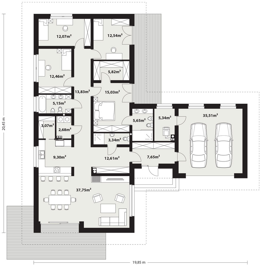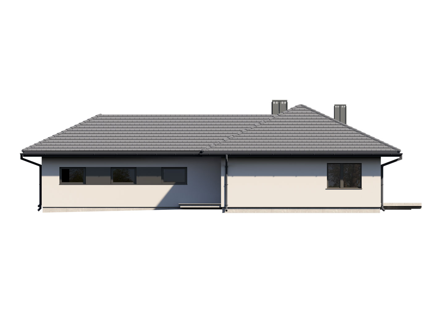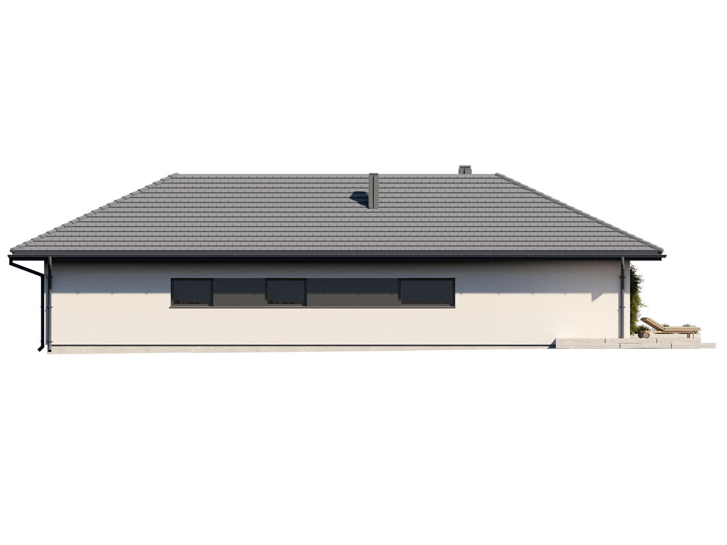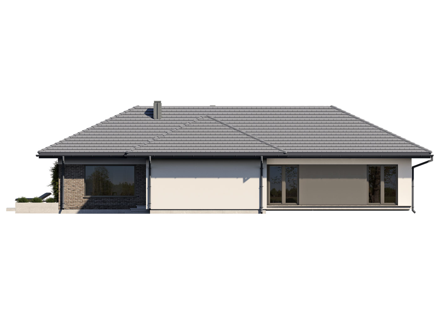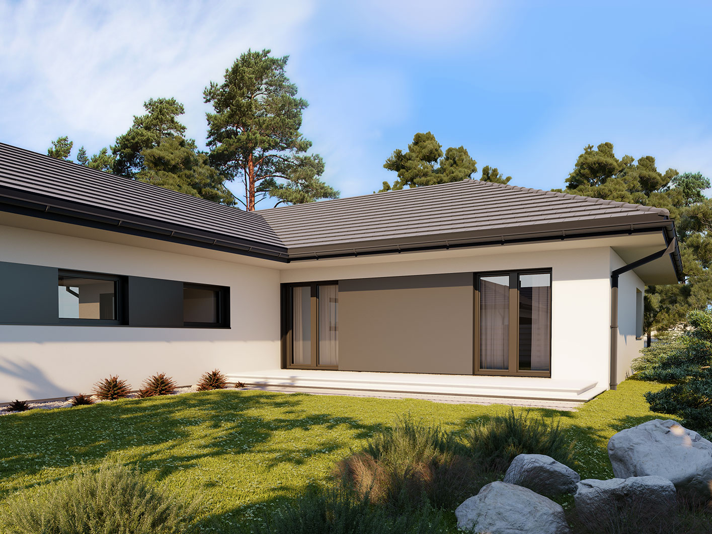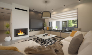 Alan 3 to parterowy dom jednorodzinny, niepodpiwniczony z dwustanowiskowym garażem. Swoim pełnym programem funkcjonalnym zapewnia komfort i wygodę 5-osobowej rodzinie. Przestronna część dzienna to salon połączony z jadalnią, otwierający się na ogród poprzez ogromne przeszklenia, kuchnia ze spiżarnią oraz wc. Część nocna to 4 wygodne sypialnie, łazienka. Dodatkowo główna sypialnia posiada własną garderobę i łazienkę. W domu zaprojektowano dużą kotłownię dostępną z garażu, której parametry pozwalają na montaż kotła na każdy rodzaj paliwa, w tym na paliwo stałe. Część gospodarczą uzupełnia jeszcze pralnia i garaż. Ten optymalny i ciekawy program funkcjonalny został ujęty w prostej bryle na rzucie litery T, przykrytej wielospadowym dachem. Atutem projektu jest jego prostota zarówno w układzie pomieszczeń, jak i w rozwiązaniach elewacji, gdzie elegancki, nowoczesny styl osiągnięto poprzez klasyczne, proste ale szlachetne materiały takie jak szalówka oraz delikatny, subtelny detal.