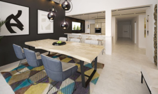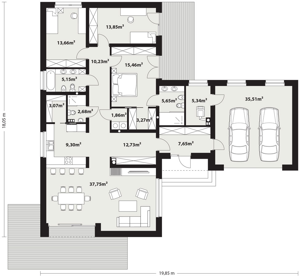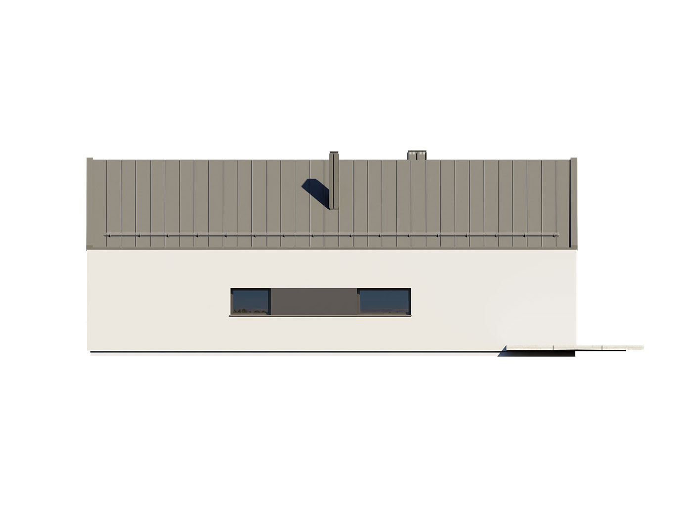 Dom Alani 2 to ciekawa propozycja dla inwestorów ceniących współczesne spojrzenie na architekturę. Projekt ma bardzo interesującą aranżację zewnętrzną i swoim charakterem nawiązuje do stylu nowoczesnej stodoły. W domu Alani 2 główna bryła budynku, która odwołuję się do archetypu domu, na rzucie prostokąta przykrytego dwuspadowym, bezokapowym dachem, zestawiona jest z prostą bryłą garażu i wejścia z płaskim dachem. Nowoczesną stylistykę podkreśla dodatkowo ogromne przeszklenie w części dziennej, stanowiące obok cofniętego wejścia, główny akcent budynku. Współczesny, minimalistyczny charakter domu uzyskano dzięki elewacjom wykończonym kontrastującym ze sobą białym i czarnym tynkiem, urozmaiconym szalówką w kolorze naturalnego drewna, które idealnie komponują się z szarą blachą na rąbek. Dom Alani 2, który kształtem nawiązuje do tradycyjnych wzorców typowych dla terenów wiejskich, we wnętrzu zachował bardzo przejrzysty i funkcjonalny program użytkowy dla 4-5 osobowej rodziny. Układ domu został podzielony na 3 strefy, gdzie część dzienna to przestronny salon z jadalnią, kuchnia ze spiżarnią i wc. Strefa intymna składa się z 3 sypialni i łazienki, z czego największa sypialnia ma własną garderobę i łazienkę. Część gospodarcza to dwustanowiskowy garaż, kotłownia i pralnia. Niewątpliwym atutem projektu jest zastosowanie dużego tarasu oraz licznych przeszkleń zarówno w części dziennej, jak i w każdej z sypialni, co pozwala na otwarcie domu "na zewnątrz" i cieszenie się z pięknych, naturalnych walorów działki.