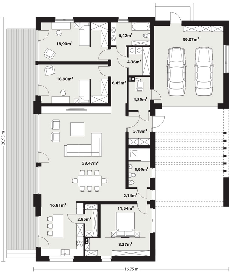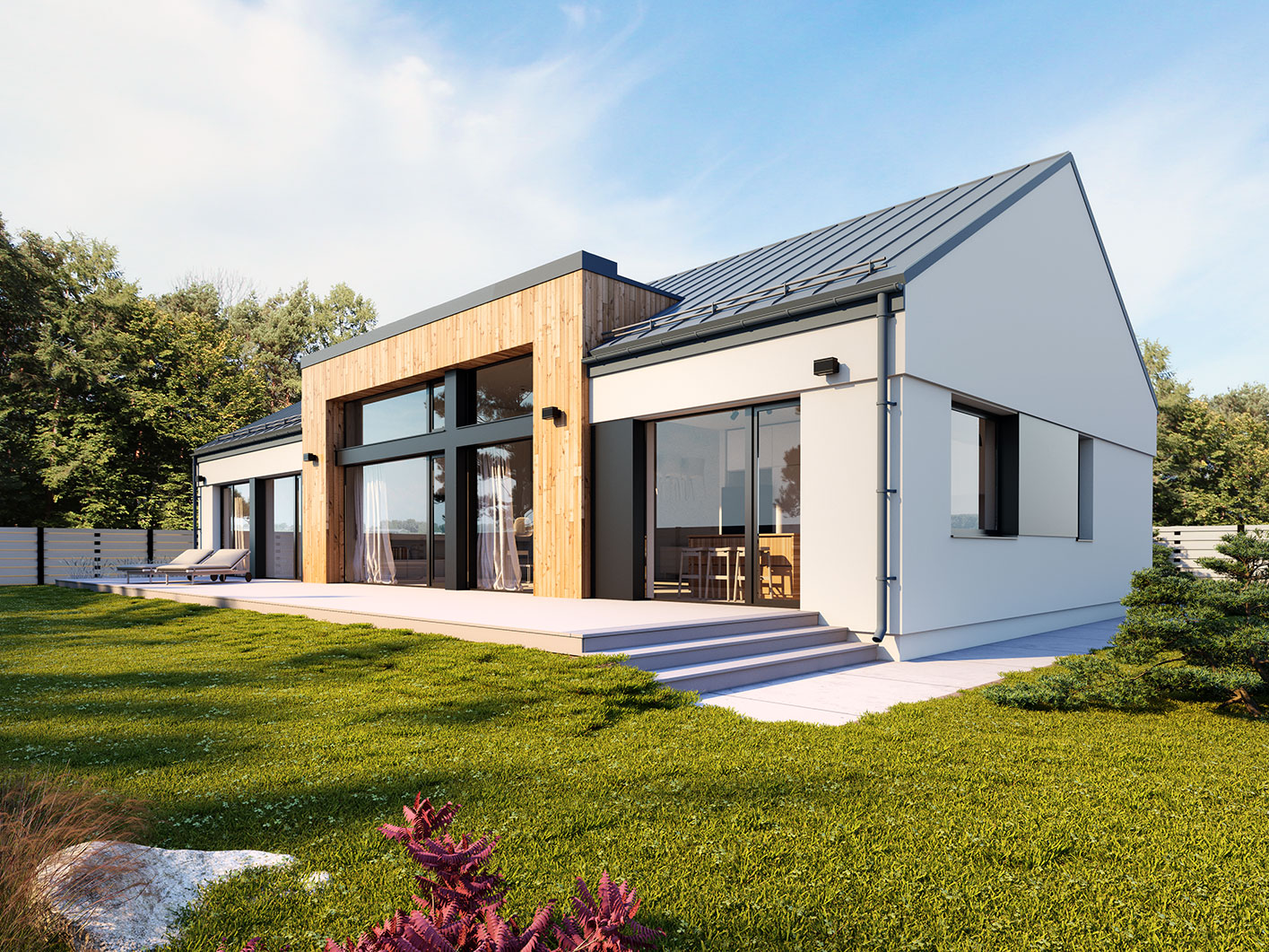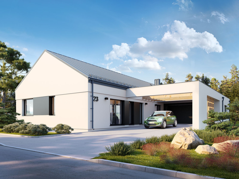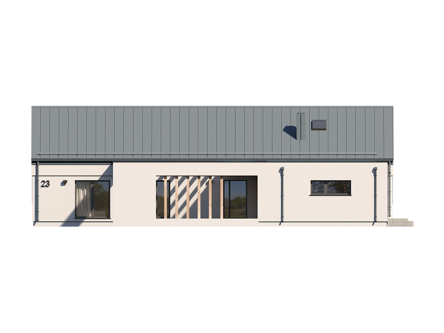 Dom Multi to ciekawa propozycja dla inwestorów ceniących współczesne spojrzenie na architekturę. Projekt ma bardzo interesującą aranżację zewnętrzną i swoim charakterem nawiązuje do stylu nowoczesnej stodoły. W domu Multi główna bryła budynku, która odwołuję się do archetypu domu, na rzucie prostokąta przykrytego dwuspadowym, bezokapowym dachem, zestawiona jest z prostą bryłą garażu z płaskim dachem. Nowoczesną stylistykę podkreśla dodatkowo ogromne przeszklenie w części dziennej oraz podwyższony salon. We wnętrzu zachowano bardzo przejrzysty i funkcjonalny program użytkowy dla 4-5 osobowej rodziny. Układ domu został podzielony na 3 strefy, gdzie część dzienna to przestronny salon z jadalnią, kuchnia ze spiżarnią i wc. Strefa intymna składa się z 3 sypialni i łazienki, z czego największa sypialnia ma własną garderobę i łazienkę. Część gospodarcza to dwustanowiskowy garaż, kotłownia i pralnia. Niewątpliwym atutem projektu jest zastosowanie dużego tarasu oraz licznych przeszkleń zarówno w części dziennej, jak i w każdej z sypialni, co pozwala na otwarcie domu "na zewnątrz" i cieszenie się z pięknych, naturalnych walorów działki.