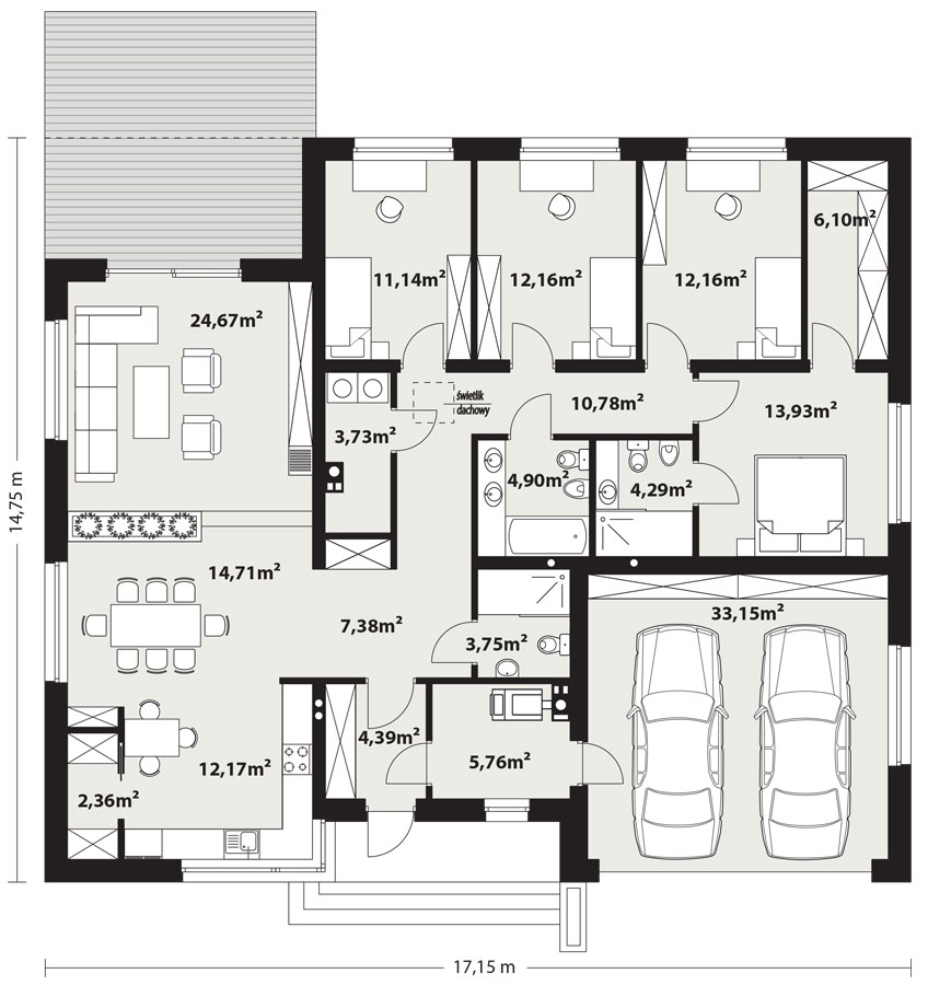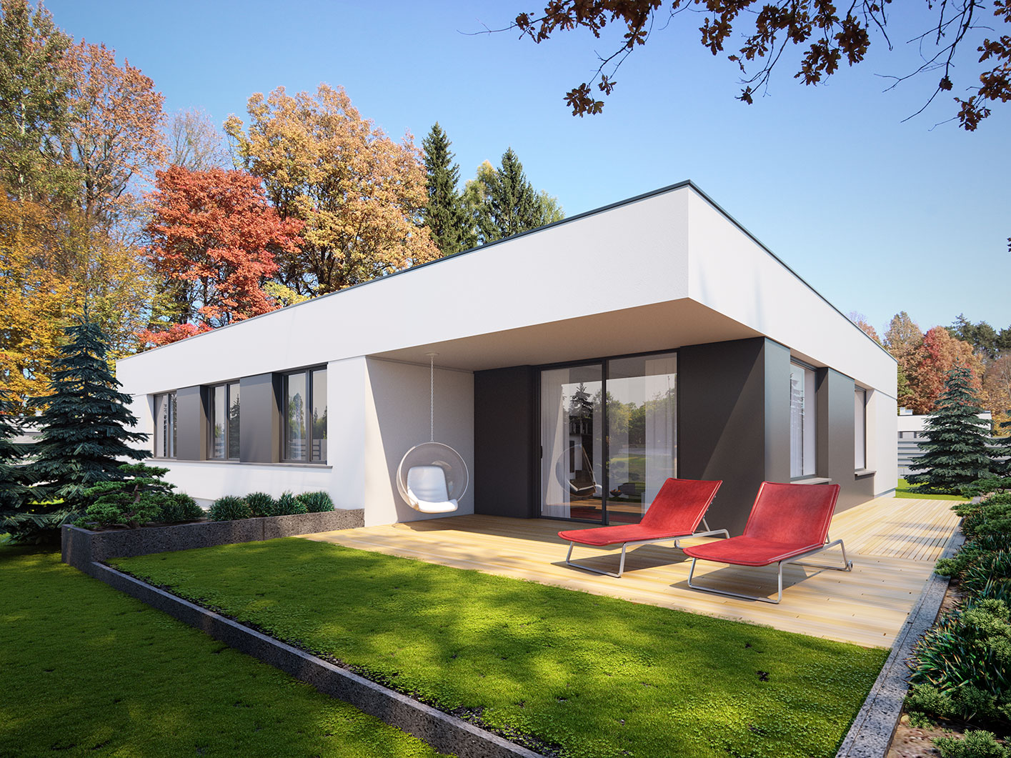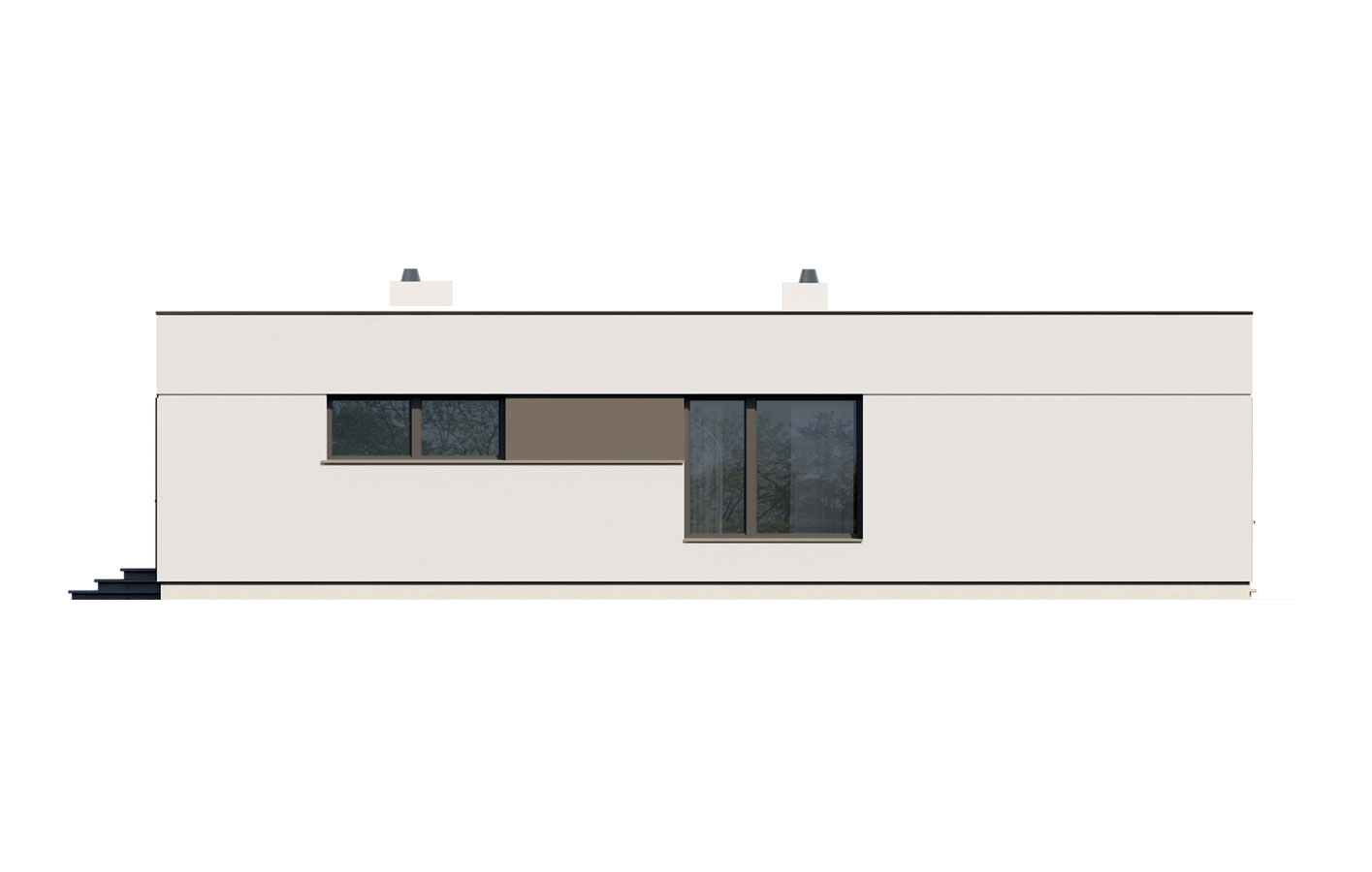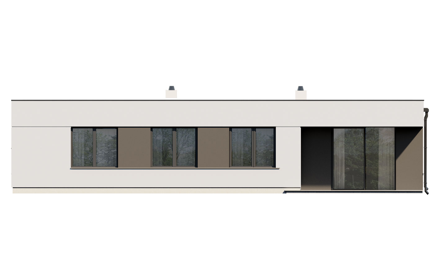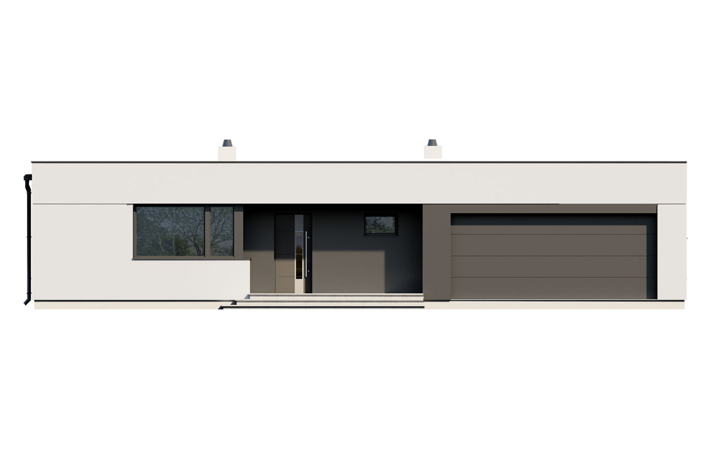 Igo 3 to ciekawy projekt domu nowoczesnego, który zasługuje na uwagę zarówno pod względem funkcjonalnym, jak i estetycznym. Jest to parterowy dom z dwustanowiskowym garażem, nawiązuje klimatem do nadmorskich willi. Przestronna część dzienna z dużymi przeszkleniami, złożona z salonu i jadalni, płynnie łączy wnętrze domu z rozległym, częściowo zadaszonym tarasem. Duża kuchnia posiada dodatkowo spiżarnię. W wydzielonej części nocnej znajdują się cztery przestronne sypialnie i łazienka. Dodatkowo główna sypialnia posiada własną garderobę i łazienkę. Atutem tego projektu są również pralnia oraz duża kotłownia. Igo 3 to prosty dom parterowy odpowiadający potrzebom 4-5 osobowej rodziny. Ten optymalny i ciekawy program funkcjonalny został ujęty w prostej bryle na rzucie kwadratu. Atutem projektu jest jego prostota zarówno w układzie pomieszczeń, jak i w rozwiązaniach elewacji, gdzie elegancki, nowoczesny styl osiągnięto poprzez klasyczne, proste ale szlachetne materiały oraz delikatny, subtelny detal.