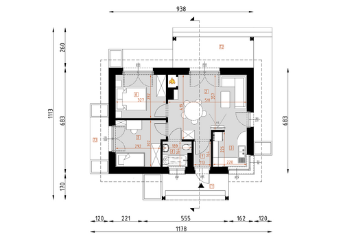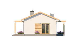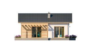Nowoczesny, mały dom parterowy. Projekt domu oferuje dwa pokoje sypialniane, przestronny pokój dzienny połączony z kuchnią oraz łazienkę. Atutem domu są dwa duże tarasy.