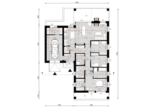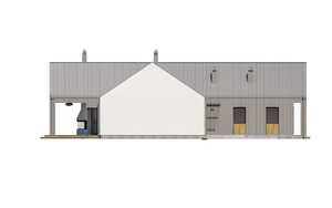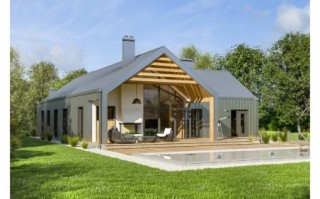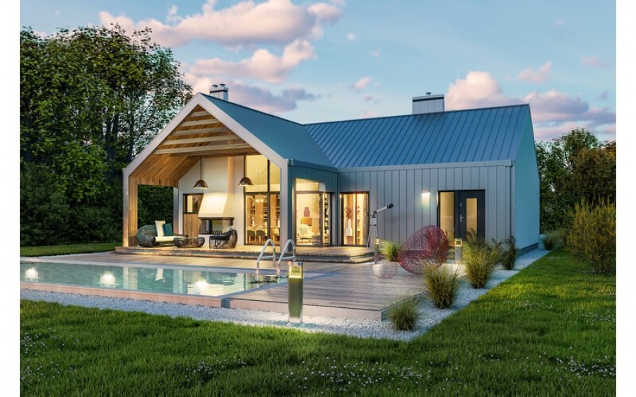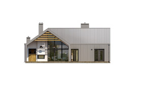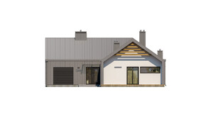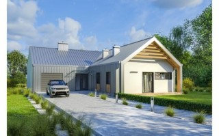 Nowoczesny, duży dom parterowy z garażem. Projekt domu oferuje trzy pokoje sypialniane, przestronny pokój dzienny połączony z kuchnią i jadalnią oraz trzy łazienki. Atutem domu są schowki, garderoby, spiżarnia oraz dwa duże tarasy.