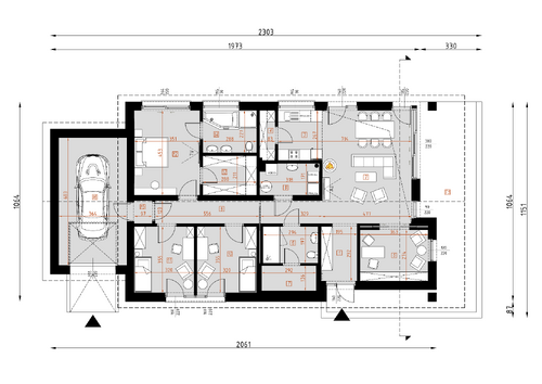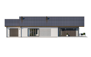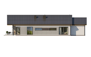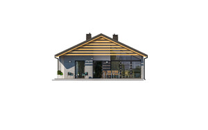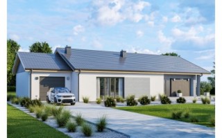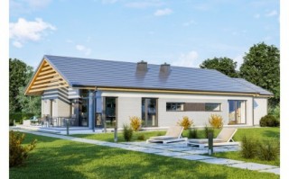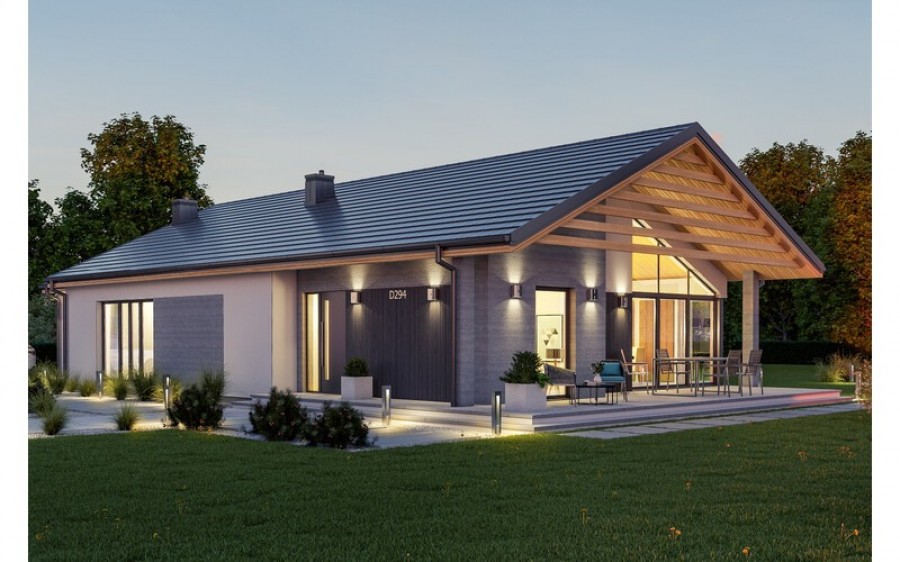 D294 to ciekawa propozycja domu parterowego. Bogaty układ wewnętrzny: 3 pokoje sypialne, gabinet, 2 łazienki, kuchnia wraz ze spiżarnią. Na uwagę zasługuje domowa sauna. Atutem tego domu są też duże przeszklenia oraz przestronny taras.