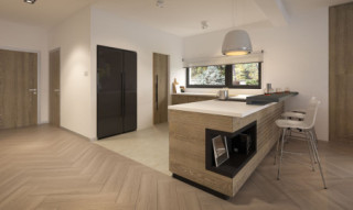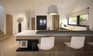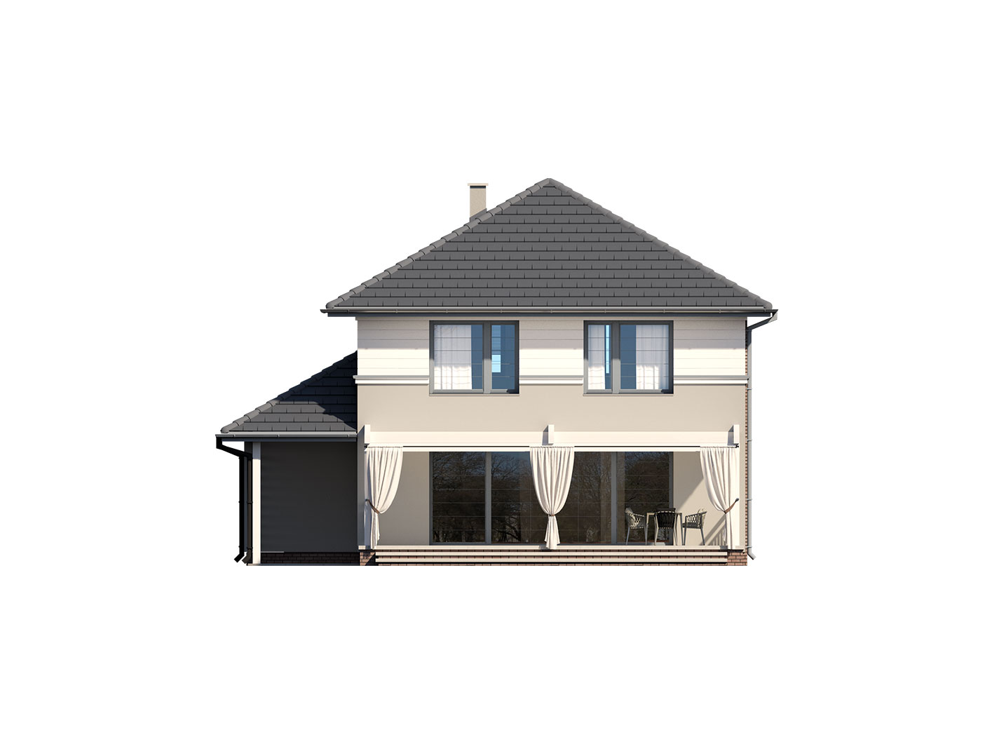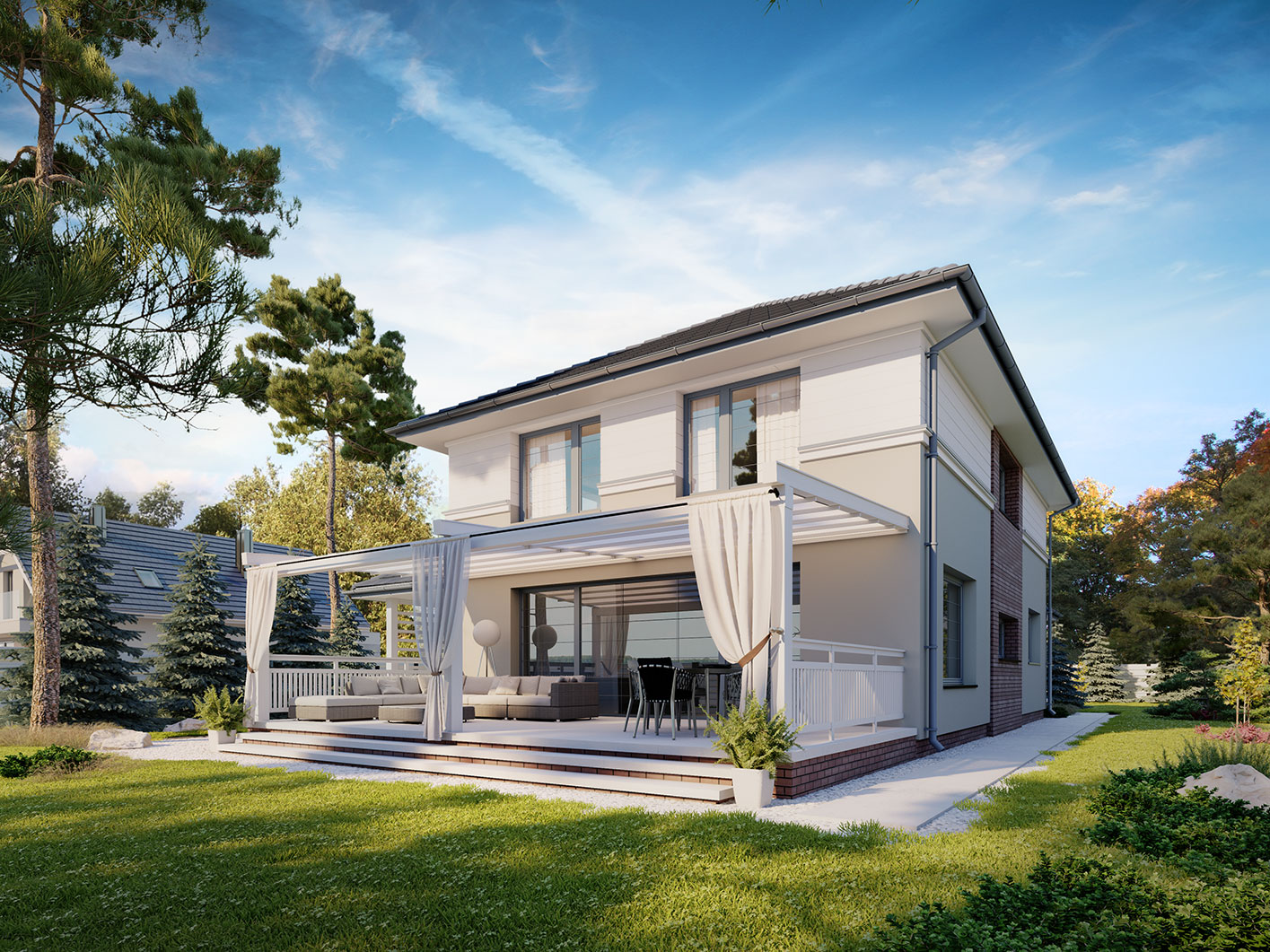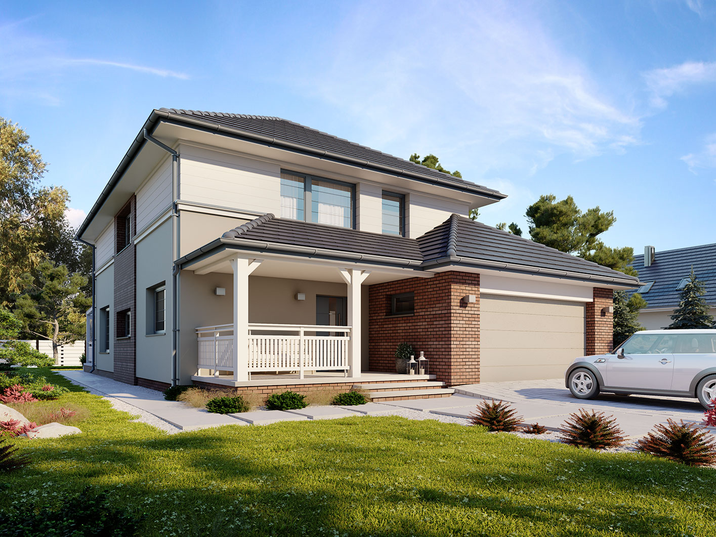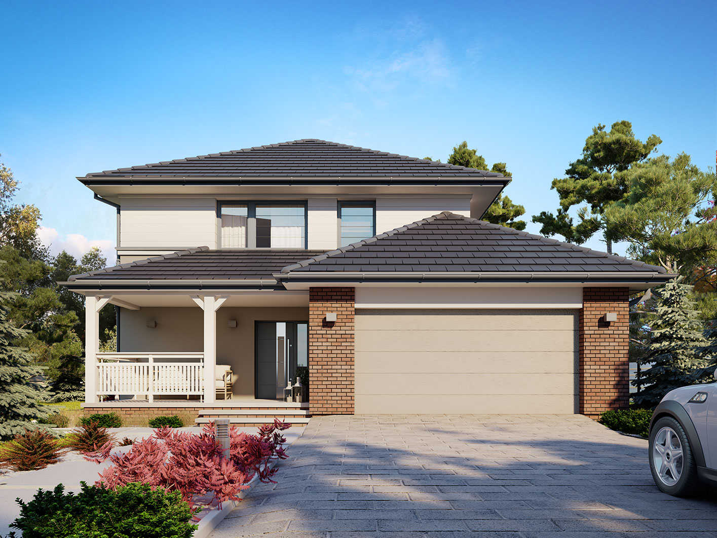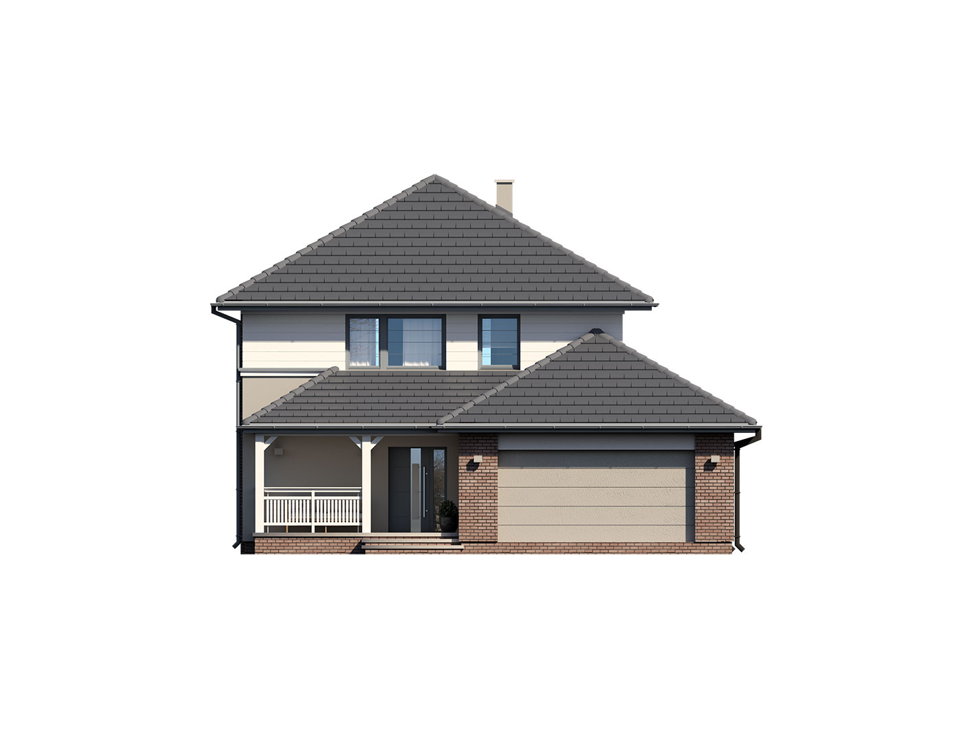 Karo 2, to idealny przykład reprezentacyjnego domu piętrowego przeznaczonego dla 4-6 osobowej rodziny. Ta typowo miejska rezydencja o nowoczesnym wyglądzie zawiera w swojej prostej bryle optymalną powierzchnię użytkową. Posiada bogaty program funkcjonalny, rozłożony na dwóch pełnych kondygnacyjnych, który zapewni komfort nawet dla wymagających inwestorów. Parter zaprojektowano jako otwartą przestrzeń dzienną, złożoną z połączonego salonu, jadalni i kuchni. Dodatkowo przy wejściu do domu przewidziano pokój, który można wykorzystać jako gabinet lub dodatkową sypialnię. Na piętrze zaprojektowano 4 sypialnie i łazienkę, pralnię i garderobę. Główna sypialnia ma zapewnioną własną łazienkę oraz mały pokoi do pracy. Dodatkowym atutem projektu jest duża, zadaszona weranda wejściowa. Karo zachwyca wysmakowaną, ponadczasową, klasyczną bryłą ujętą we współczesny elegancki wizerunek. Rezydencja ta stanowi doskonałą propozycję dla inwestorów poszukujących komfortowego domu w estetycznym wydaniu