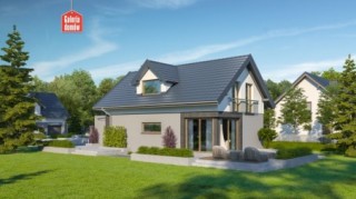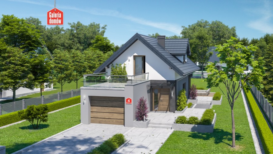 Dom przy Migdałowej 4 to budynek jednorodzinny z dachem dwuspadowym przygotowany z myślą o wąskich działkach. Prosta konstrukcja dachu oraz forma budynku sprawiają, iż jest to dom oszczędny w budowie i nie sprawia trudności w trakcie realizacji. Wnętrze dzieli się na strefę dzienną, na parterze i nocną, na poddaszu. Przestronny salon posiada szerokie przeszklenia, co sprawia iż przyjemnie otwiera się na zieloną strefę ogrodu. Znalazło się w nim miejsce na kominek, narożną sofę oraz stół jadalniany. Kuchnia również posiada duże okno, przez co pracuje się w niej przyjemnie. Na parterze zaprojektowano również niewielką łazienkę, pralnię i spiżarnię. Poddasze mieści 3 pokoje, główną łazienkę oraz garderobę. Każdy pokój ma dostęp do balkonów. Sypialnia małżeńska wychodzi na okazały taras. Nowoczesna estetyka, energooszczędne rozwiązania i przemyślany układ wnętrza sprawiają, iż dom jest ciekawą propozycją, szczególnie dla inwestorów posiadających wąskie działki.