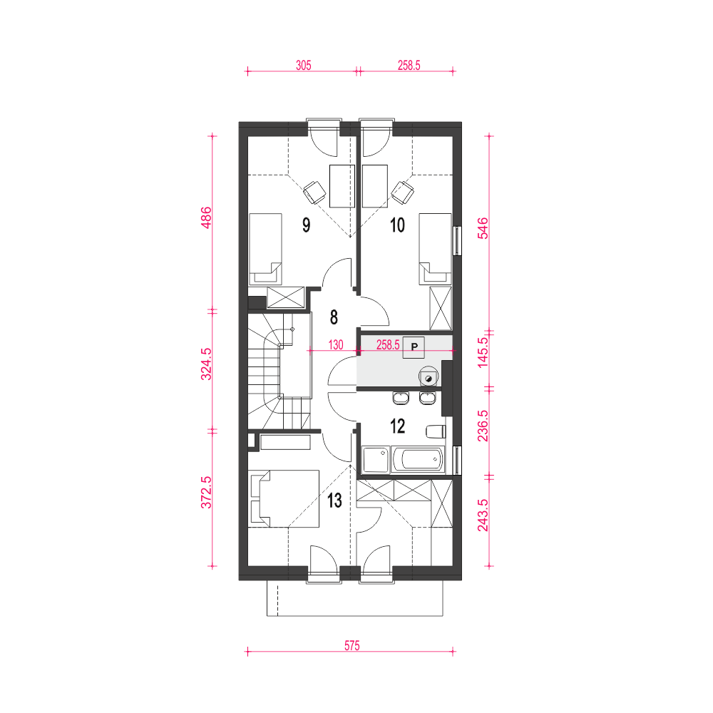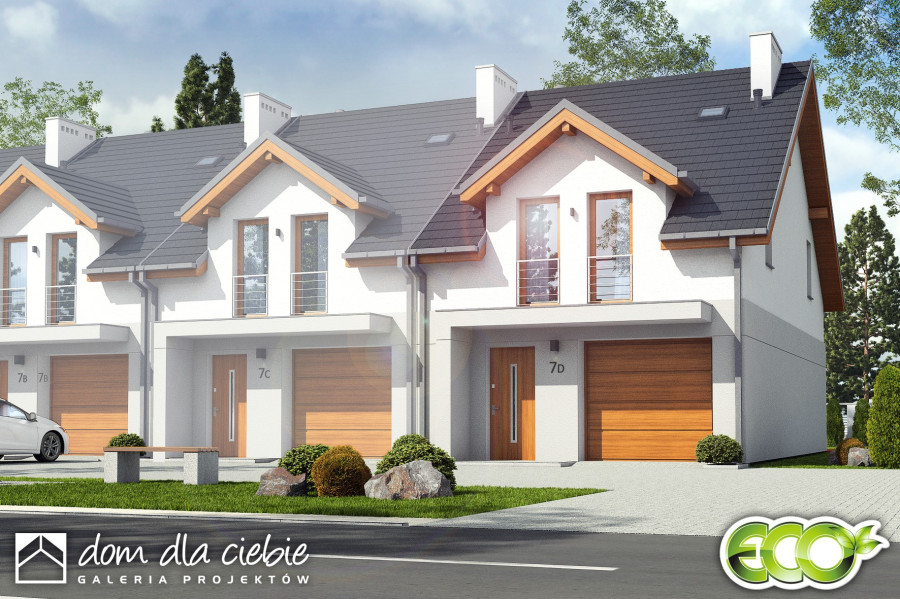Projekt domu Jukka segment skrajny prawy to atrakcyjny dom parterowy z poddaszem użytkowym w zabudowie szeregowej. To idealny projekt na wąskie działki o bardzo prostej i zwartej formie oraz o niedużej powierzchni użytkowej - blisko 100 m2 - co przekłada się na niski koszt budowy i eksploatacji domu. Projekt Jukka to dom dla 4-5cio osobowej rodziny z wbudowanym garażem, o tradycyjnej konstrukcji ścian z pustaków ceramicznych izolowanych styropianem. Dach dwuspadowy zaprojektowano jako podniesiony na ściankach kolankowych o wysokości 1,14 m. Funkcja domu obejmuje część ogólnodostępną na parterze i prywatną na poddaszu. Na parterze zaprojektowano część wejściową z wiatrołapem, holem, WC i schodami schodami prowadzącymi na poddasze. Dalej mamy przewidziany ustawny salon z kominkiem i jadalnią, oraz wygodny aneks kuchenny. Z salonu dostaniemy się na przydomowy ogród. Na poddasz zlokalizowana na poddaszu, obejmuje przedpokój z którego dostaniemy się do trzech sypialni, wspólnej łazienki oraz pomieszczenia pralni z piecem gazowym c.o. Jukka szeregówka, to projekt domu o parametrach energooszczędnych, o prostej konstrukcji i zwartej formie. To idealny projekt do realizacji inwestycji deweloperskich.