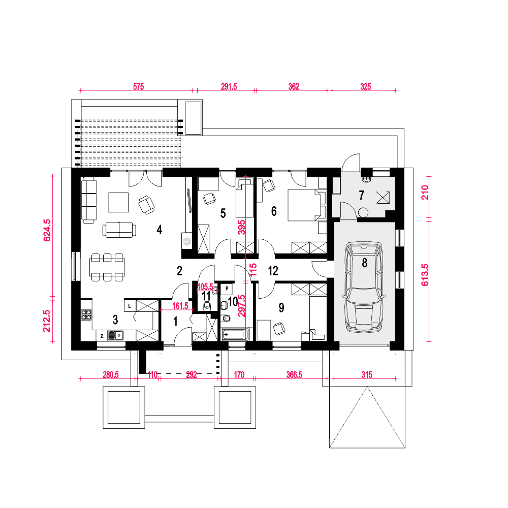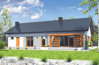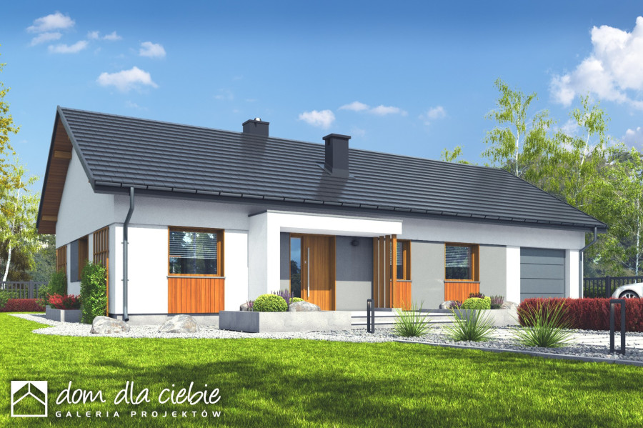 Projekt domu Kaja to propozycja niedużego domu dla 4 osobowej rodziny.Projekt posiada wszystkie funkcje potrzebne dla komfortu mieszkańców. W strefie wejściowej mamy wiatrołap i garderobę oraz dostępne z holu wc. Kompaktowy salon wyposażony jest w jadalnię a w kuchni mamy schowaną wygodną spiżarnię. W strefie nocnej znajdziemy 3 sypialnie , dwie z bezpośrednim wyjściem na ogród za domem oraz łazienkę. Korytarz prowadzi do jednostanowiskowego garażu, za którym znajdziemy kotłownię z piecem na paliwo stałe z wyjściem na zewnątrz.fundamenty: BETONOWE ściany: POROTHERM+OCIEPLENIE rodzaj stropu: TERIVA I elewacje: TYNK STRUKTURALNY pokrycie dachu: DACHÓWKA CEM. lub CER.