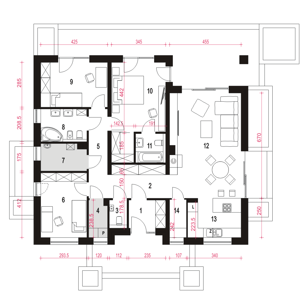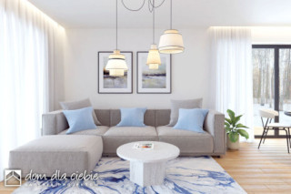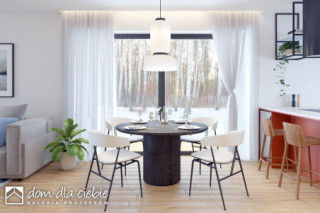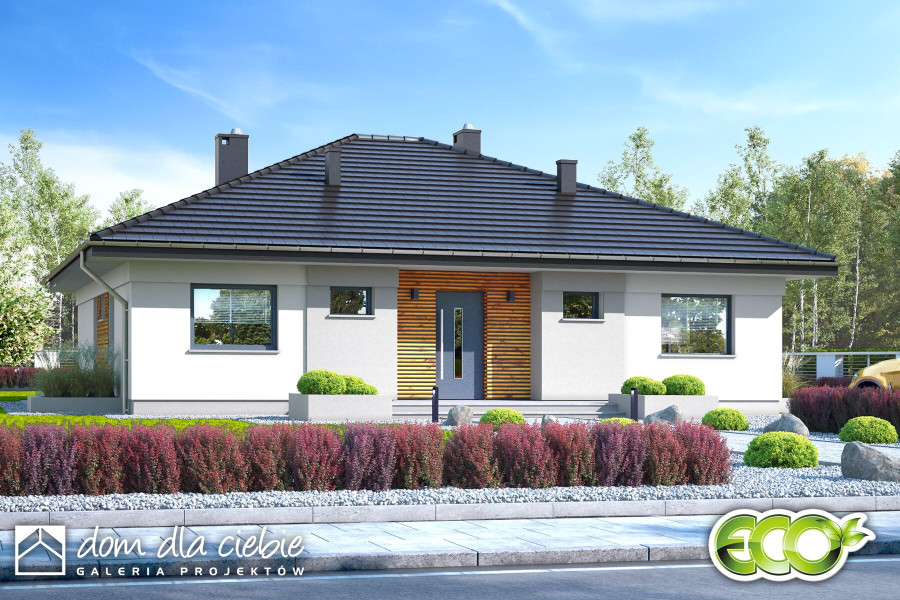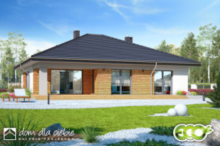 Projekt domu parterowego Klara bez garażu to idealna propozycja dla 4ro osobowej rodziny. Dom zaprojektowany jest w technologii murowanej z tradycyjną więźbą dachową, przekryty spadzistym dachem kopertowym. To funkcjonalny projekt domu parterowego, łączący strefę ogólnodostępną i prywatną na jednej kondygnacji. W części wejściowej mamy zaprojektowany wygodny wiatrołap i hol z szafami wnękowymi, pralnię oraz toaletę. W części ogólnodostępnej przewidziano przestronny i dobrze doświetlony salon z miejscem na wygodny stół jadalniany, z widokiem na ogród. Dzięki dużym drzwiom tarasowym od strony ogrodowej, dostaniemy się wprost na taras zewnętrzny, zadaszony podcieniem. W strefie ogólnodostępnej projekt przewiduje również wygodną kuchnię z wyspą i praktyczną spiżarnią. Kuchnia z układem mebli w kształcie litery "L", zapewnia wygodną przestrzeń do pracy, a duże frontowe okno doświetla idealnie przestrzeń roboczą. Do części prywatnej domu dostaniemy się przez korytarz dostępny z holu wejściowego. W części prywatnej mamy zaprojektowane trzy pokoje sypialne w tym jeden typu master bedroom. Znajdziemy tu też wygodną, wspólną łazienkę z wanną oraz pomieszczenie techniczne z piecem CO. Klara to atrakcyjna propozycja domu energooszczędnego, o nowoczesnym wyglądzie. To projekt domu z serii "eco" - ekonomiczny w budowie i w utrzymaniu - idealna propozycja dla rodzin planujących budowę pierwszego domu.fundamenty: BETONOWE ściany zewnętrzne: POROTHERM+STYROPIAN TERMO ORGANIKA rodzaj stropu: TERIVA I elewacje: TYNK STRUKTURALNY pokrycie dachu: DACHÓWKA CEM. lub CER.
