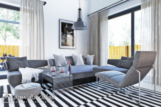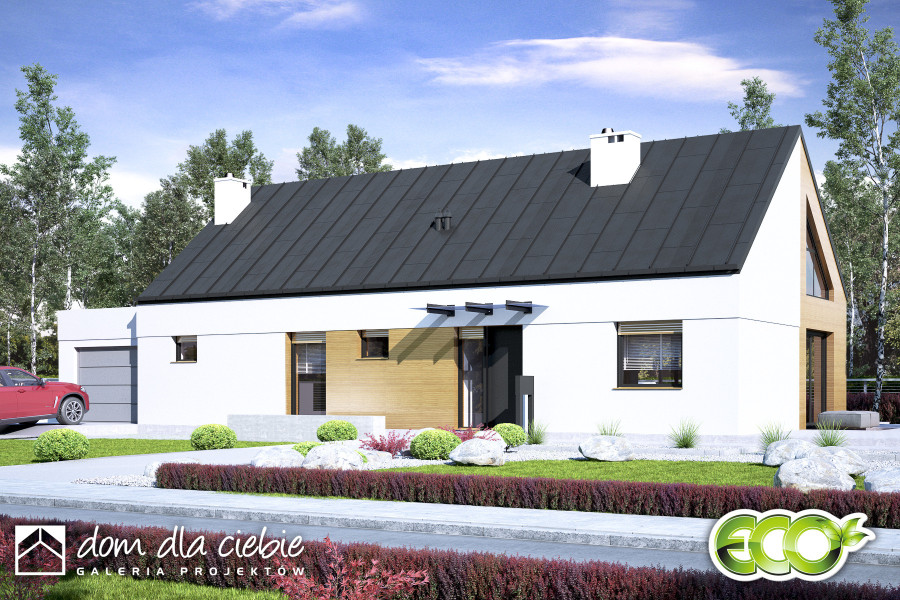 Żurawinka II to nowoczesna architektura małego domu. Nadaje się na wąskie działki i przeznaczona jest dla 4-osobowej rodziny. Zaprojektowana została w technologii murowanej z prefabrykowanymi wiązarami dachowymi. Bryła domu przekryta jest stromym dachem dwuspadowym. Funkcja Żurawinki II zawiera w sobie salon z kominkiem, kuchnię ze spiżarnią oraz miejsce (jadalnia) na stół rodzinny. Hol prowadzi do części domu z dwoma pojedynczymi sypialniami rozdzielonymi wspólną wygodną łazienką oraz sypialni podwójnej z łazienką indywidualną. Na końcu korytarza znajduje się pomieszczenie techniczne – pralnia. Z boku domu znajduje się jednostanowiskowy garaż.fundamenty: BETONOWE ściany zewnętrzne: POROTHERM+STYROPIAN TERMO ORGANIKA rodzaj stropu i konstrukcja dachu: wiązary prefabrykowane MITEK elewacje: TYNK STRUKTURALNY pokrycie dachu: BLACHA