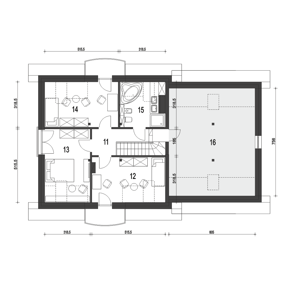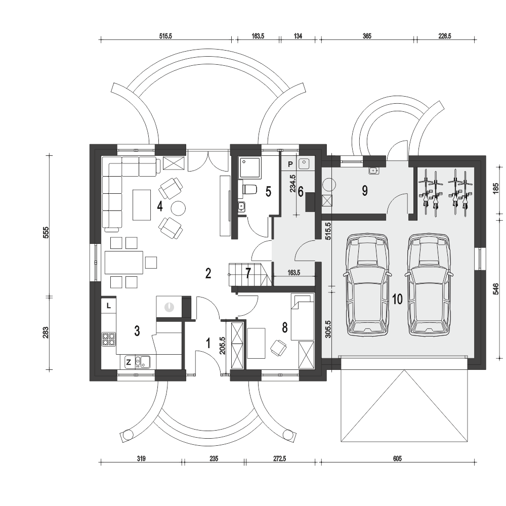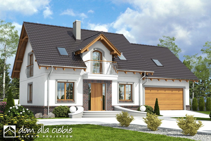 Dom Dla Ciebie 5 z garażem dwustanowiskowym, wariant A3 bez wykuszu, to mniejsza wersja popularnego projektu Dom Dla Ciebie 1. Dom Dla Ciebie 5 to projekt domu o popularnej powierzchni użytkowej około 110 m2. To projekt z użytkowym poddaszem, o tradycyjnej więźbie drewnianej ze ścianką kolankową o wysokości około 1m. Przeznaczony jest dla 4ro osobowej rodziny i tak jak pozostałe projekty z tej serii zaprojektowany został z zachowaniem podziału na dwie strefy: ogólnie dostępną i prywatną. Strefa ogólnie dostępna przewidziana jest na parterze. Mamy tu zaprojektowany wiatrołap z wnękowymi szafami, hol, kuchnię ze spiżarnią, salon z jadalnią i kominkiem oraz dodatkowy pokój od frontu, który może służyć np. jako gabinet. Ponadto jest tu nieduża łazienka z prysznicem oraz przechodnia pralnia z której dostaniemy się do garażu. Za garażem, od strony ogrodu zaprojektowana jest kotłownia, która dodatkowo może spełnić funkcję pomieszczenia gospodarczego. Do części prywatnej, na poddasze prowadzą jednobiegowe schody, którymi ostaniemy się do przedpokoju prowadzącego do 3 wygodnych i dobrze oświetlonych pokoi z balkonami. Bezpośrednio ze schodów możemy się dostać do nieużytkowego strychu nad garażem, który z łatwością możemy zaadaptować na cele mieszkaniowe. Na poddaszu jest też przewidziana ogólnie dostępną łazienka z narożną wanną i prysznicem. Projekt domu Dom Dla Ciebie 5, to propozycja dla szukających projektu domu tradycyjnego o stylowej architekturze, funkcjonalnym wnętrzu i o energooszczędnych parametrach.
