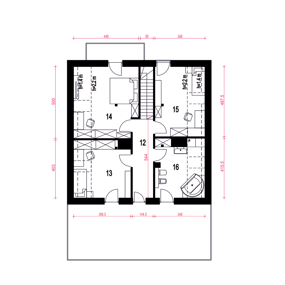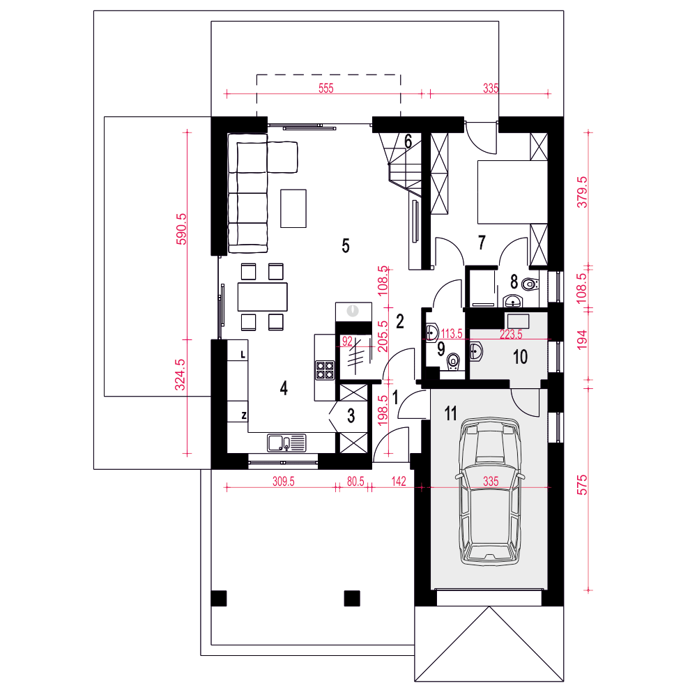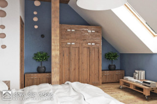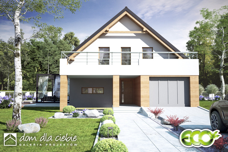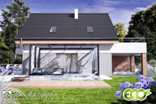 Projekt Nowalia to propozycja dla osób posiadających węższą działkę. Budynek został zaprojektowany na planie kwadratu z wysuniętym garażem. Prosta forma budynku oraz dwuspadowy dach wpłynie pozytywnie na koszty budowy. Jest to dom wolnostojący z poddaszem użytkowym. Strefa dzienna na parterze składa się z: salonu z kominkiem, jadalni, otwartej kuchni ze spiżarnią. Na parterze przewidziano również sypialnię z łazienką, wiatrołap, hol z garderobą WC, kotłownię z piecem CO oraz garaż. Na poddasze wchodzi się schodami z salonu. Tu zaprojektowano hol oraz trzy sypialnie i salon kąpielowy. Od frontu przewidziano taras będący również zadaszeniem niewielkiej wiaty i wejścia do domu. Dom nadaje sie dla 4-5 osobowej rodziny. Architektura zewnętrzna łączy w sobie elementy tradycyjne i nowoczesne.