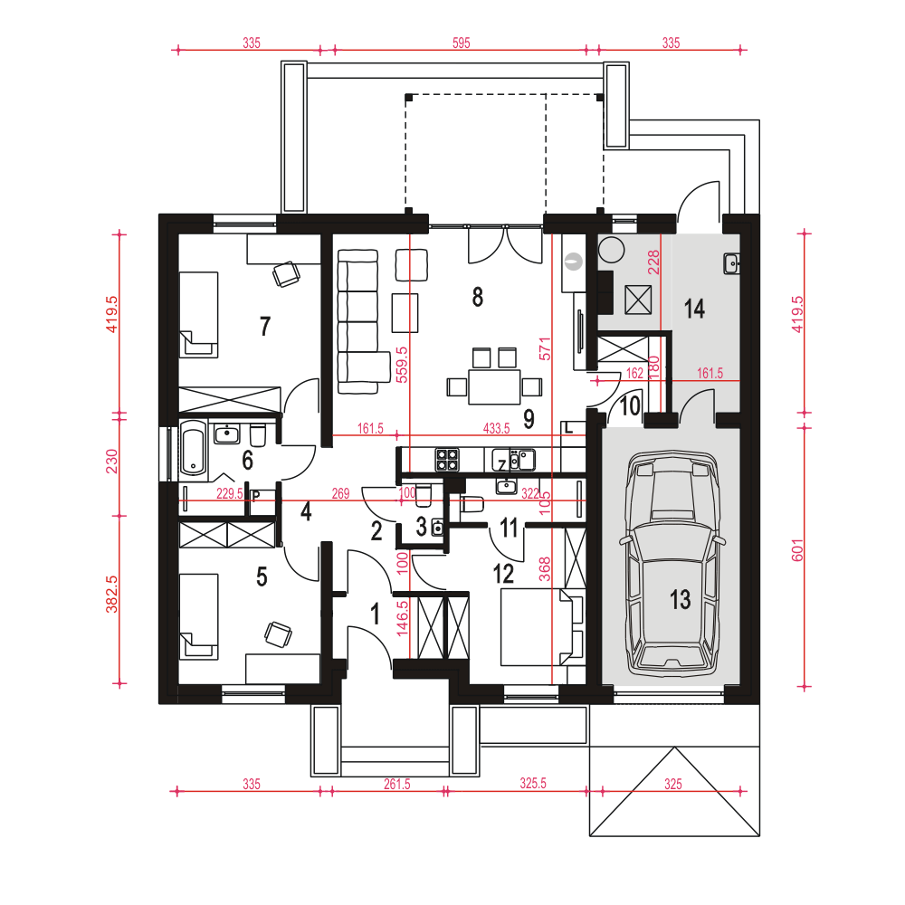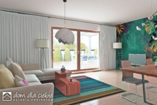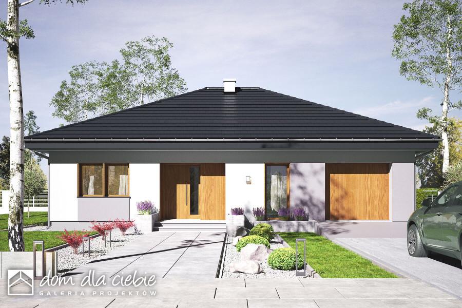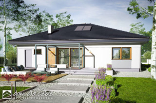 Opal to wygodny parterowy dom z garażem dla 4-ro osobowej rodziny. W strefie wejściowej budynku znajdziemy wygodny wiatrołap z miejscem na obszerną szafę oraz hol z dostępem do wc. W salonie z kominkiem znajdziemy miejsce na stół jadalniany a z kuchni dostaniemy się do spiżarni będącej jednocześnie przejściem do garażu. W strefie prywatnej domu znajdziemy wygodną sypialnię małżeńską z własną łazienką oraz dwie sypialnie i łazienkę. Za garażem znajduje kotłownia z piecem na paliwo stałe z wyjściem na zewnątrz.Całości funkcji dopełnia przestronny taras zadaszony nowoczesną wiatą.fundamenty: BETONOWE ściany zewnętrzne: POROTHERM+STYROPIAN TERMO ORGANIKA ściany wewnętrzne: POROTHERM rodzaj stropu: TERIVA elewacje: TYNK STRUKTURALNY/OKŁ. DREWNOPODOBNA pokrycie dachu: DACHÓWKA CERAMICZNA