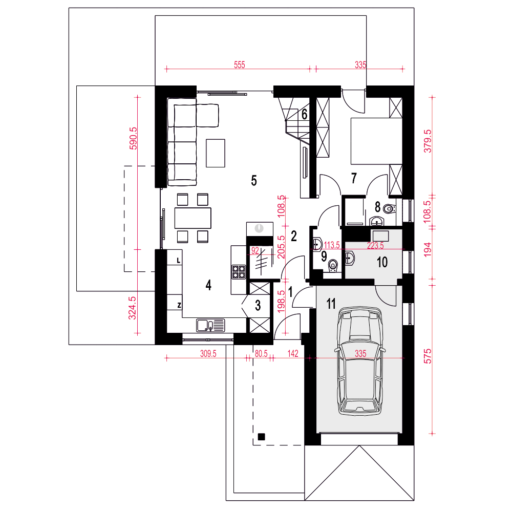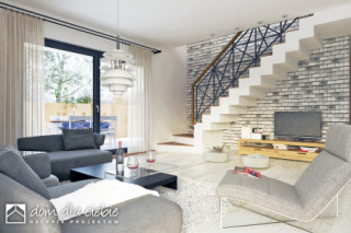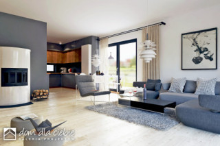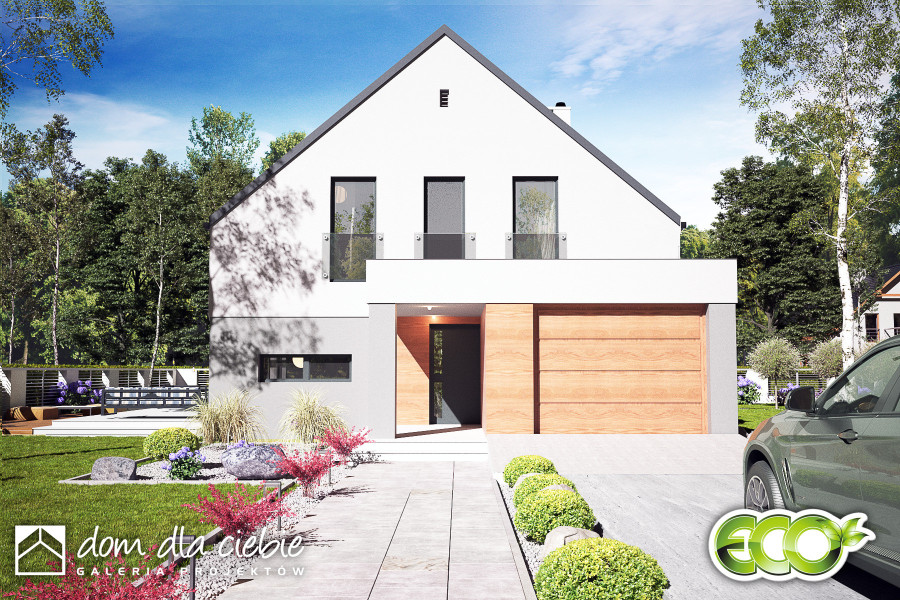 Projekt Nowalia Mode to propozycja dla osób posiadających węższą działkę. Budynek został zaprojektowany na planie kwadratu z wysuniętym garażem. Prosta forma budynku oraz dwuspadowy dach wpłynie pozytywnie na koszty budowy. Jest to dom wolnostojący z poddaszem użytkowym. Strefa dzienna na parterze składa się z: salonu z kominkiem, jadalni, otwartej kuchni ze spiżarnią. Na parterze przewidziano również sypialnię z łazienką, wiatrołap, hol z garderobą WC, kotłownia z piecem CO oraz garaż. Na poddasze wchodzi się schodami z salonu. Tu zaprojektowano hol oraz trzy sypialnie i salon kąpielowy. Dom nadaje sie dla 4-5 osobowej rodziny.fundamenty: BETONOWE ściany: POROTHERM+STYROPIAN rodzaj stropu: ŻELBETOWY MONOLITYCZNY elewacje: TYNK STRUKTURALNY pokrycie dachu: DACHÓWKA CEM. lub CER.