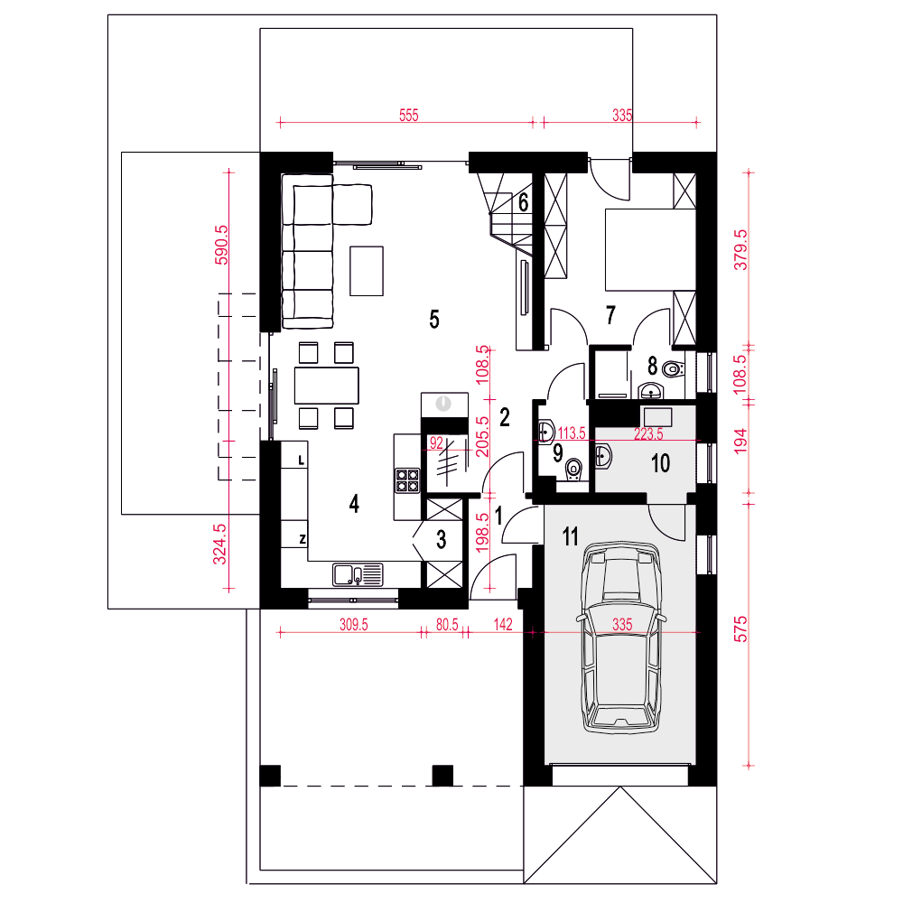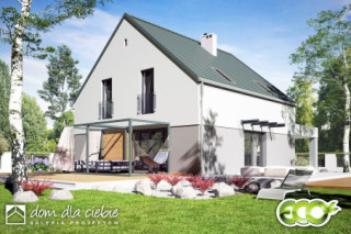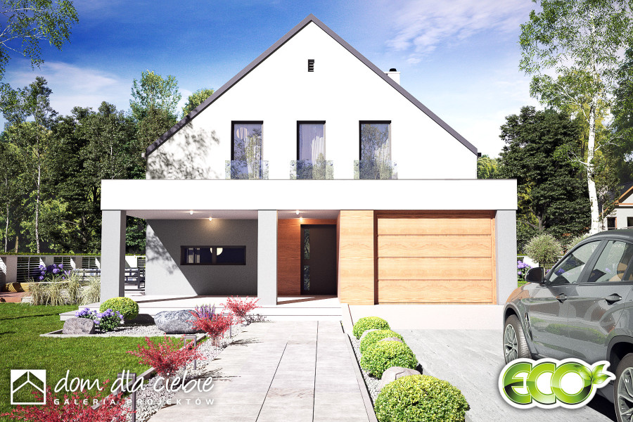 Projekt Nowalia Mode A1 to propozycja dla osób posiadających węższą działkę. Budynek został zaprojektowany na planie kwadratu z wysuniętym garażem i niewielka wiatą. Prosta forma budynku oraz dwuspadowy dach wpłynie pozytywnie na koszty budowy. Jest to dom wolnostojący z poddaszem użytkowym. Strefa dzienna na parterze składa się z: salonu z kominkiem, jadalni, otwartej kuchni ze spiżarnią. Na parterze przewidziano również sypialnię z łazienką, wiatrołap, hol z garderobą WC, kotłownia z piecem CO oraz garaż. Na poddasze wchodzi się schodami z salonu. Tu zaprojektowano hol oraz trzy sypialnie i salon kąpielowy. Dom nadaje sie dla 4-5 osobowej rodziny.