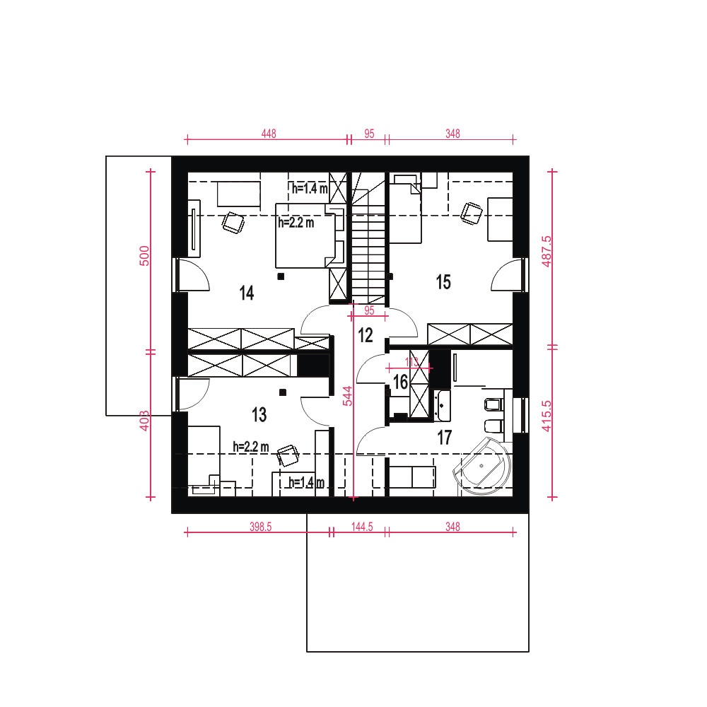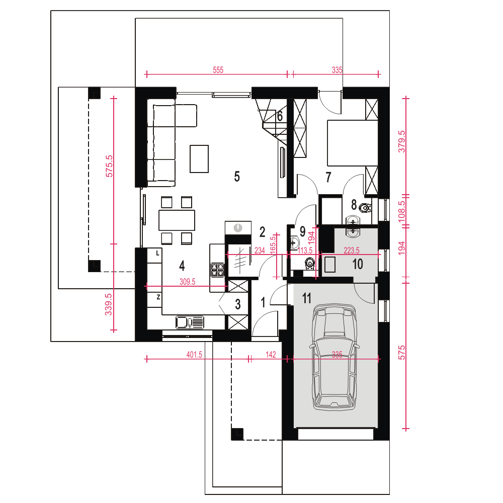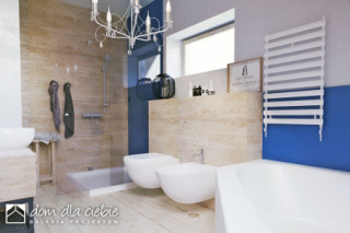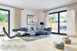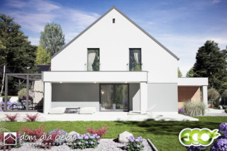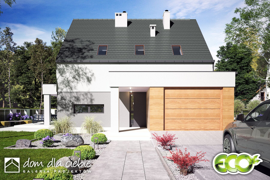 Projekt Nowalia II Mode została zaprojektowana na planie kwadratu z wysuniętym garażem. Prosta forma budynku oraz dwuspadowy dach wpłynie pozytywnie na koszty budowy. Jest to dom wolnostojący z poddaszem użytkowym. Strefa dzienna na parterze składa się z: salonu z kominkiem, jadalni, otwartej kuchni ze spiżarnią. Na parterze przewidziano również sypialnię z łazienką, wiatrołap, hol z garderobą, WC, kotłownię z piecem CO oraz garaż. Na poddasze wchodzi się schodami z salonu. Tu zaprojektowano hol oraz trzy sypialnie i salon kąpielowy. Dom nadaje się dla 4-5 osobowej rodziny. Architektura zewnętrzna łączy w sobie elementy tradycyjne i nowoczesne.fundamenty: BETONOWE ściany: POROTHERM 25cm+OCIEPLENIE 20cm rodzaj stropu: ŻELBETOWY MONOLITYCZNY elewacje: TYNK STRUKTURALNY pokrycie dachu: DACHÓWKA CEM. lub CER.