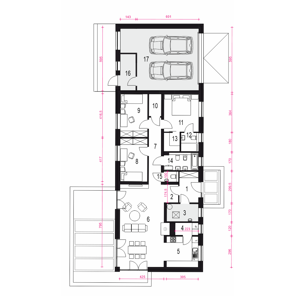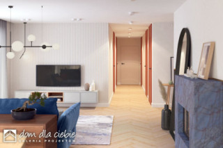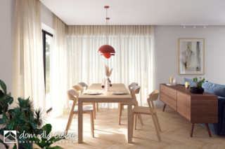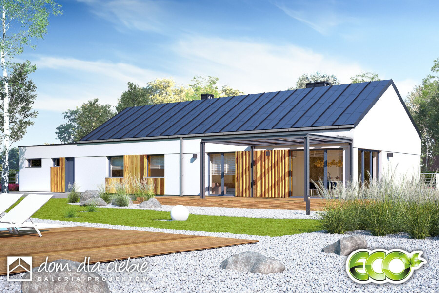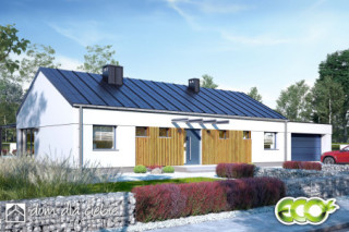Flora to projekt nowoczesnego parterowego domu typu stodoła. Przedstawiony wariant posiada przybudowany dwustanowiskowy garaż z pomieszczeniem gospodarczym. To propozycja domu jednorodzinnego o maksymalnie uproszczonej formie - z dachem dwuspadowym na planie prostokąta. Flora to projekt kompaktowego domu parterowego przeznaczonego dla czteroosobowej rodziny. Obszerna i wygodna strefa dzienna sprzyja relaksowi. Wygodny salon posiada duże przeszklenia wychodzące na ogród. Usytuowanie kuchni pozwala na jej zamknięcie. Zaprojektowana obok spiżarnia pomieści dodatkowe sprzęty i zapasy. Strefa nocna to 3 sypialnie, w tym jedna z własną łazienką i garderobą, wspólna łazienka z oknem, oraz wspólna garderoba. W projekcie przewidziano ogrzewanie na paliwo stałe.