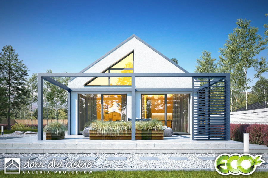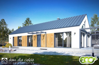 Projekt domu jednorodzinnego Natan II to projekt domu na wąską działkę, w układzie szczytowym względem frontu działki. Dom zaprojektowano na planie wydłużonego prostokąta, z prostym dwuspadowym dachem, z wykończeniem jednorodnym materiałem z nielicznymi elementami drewnianymi. Z jednej strony dom pozbawiony jest okien, co pozwala zbliżyć się budynkiem na co najmniej 3m od granicy działki. Jest to propozycja kompaktowego domu parterowego przeznaczonego dla czteroosobowej rodziny. Projekt przewiduje wygodną strefę dzienną (z salonem z wyjściem na częściowo zadaszony taras, z kuchnią, małym schowkiem - spiżarnią, wc oraz funkcjonalną strefę nocną (3 sypialnie, w tym jedna z prywatną łazienką i garderobą, duża ogólnodostępna łazienka z oknem oraz kotłownia). Dużym atutem tego domu jest salon, nad którym nie ma stropu a przestrzeń nad nim ograniczają dopiero połacie dachowe. Prosta konstrukcja domu i bryły, przełoży się na niskie koszty budowy, odczuwalne w trakcie realizacji inwestycji.fundamenty: BETONOWE ściany zewnętrzne: PUSTAK CERAM. POROTHERM+STYROPIAN TERMO ORGANIKA ściany wewnętrzne: PUSTAK POROTHERM rodzaj stropu: DREWNIANY elewacje: TYNK STRUKTURALNY/OKŁ. KAMIENNA/KLINKIEROWA pokrycie dachu: DACHÓWKA CEM. lub CER.