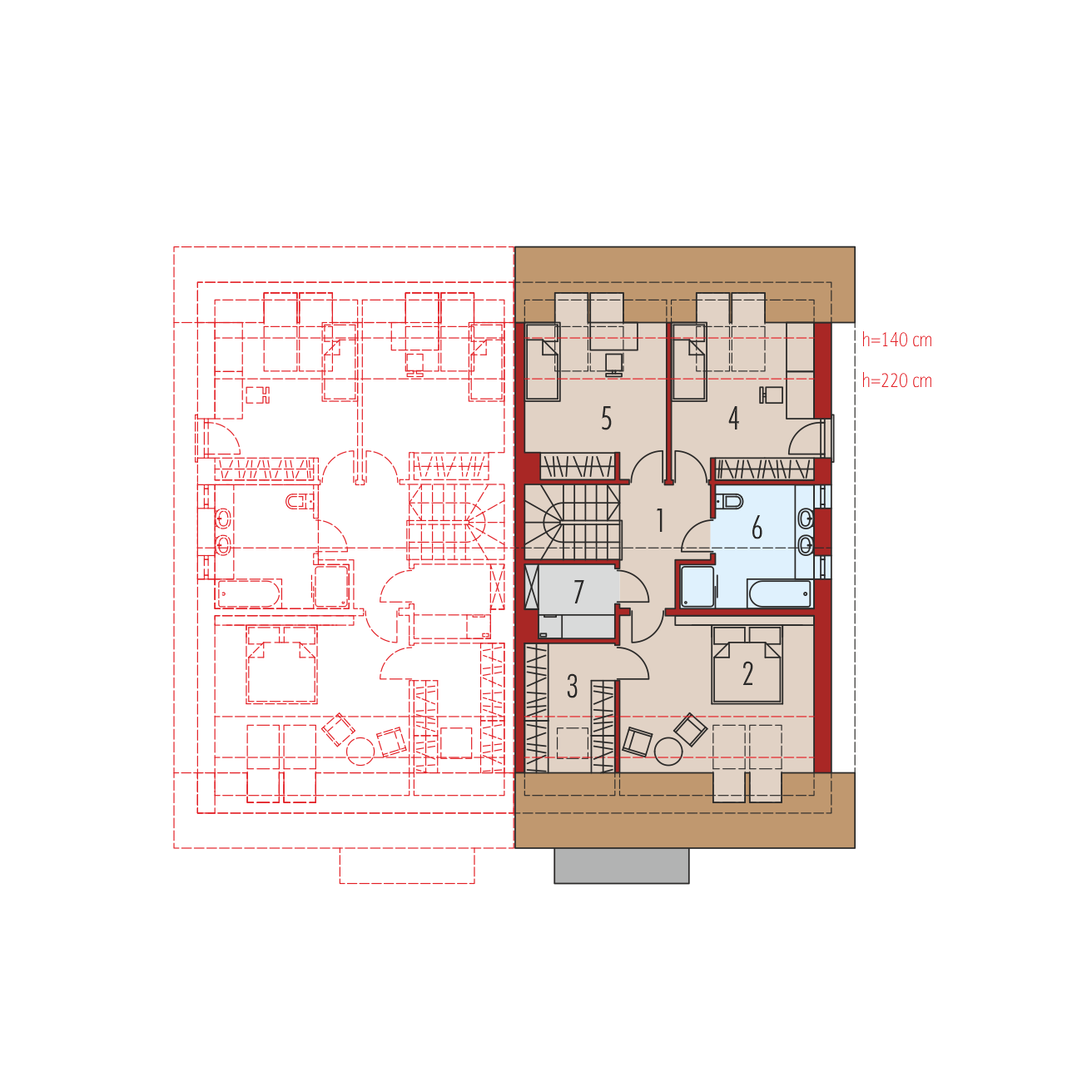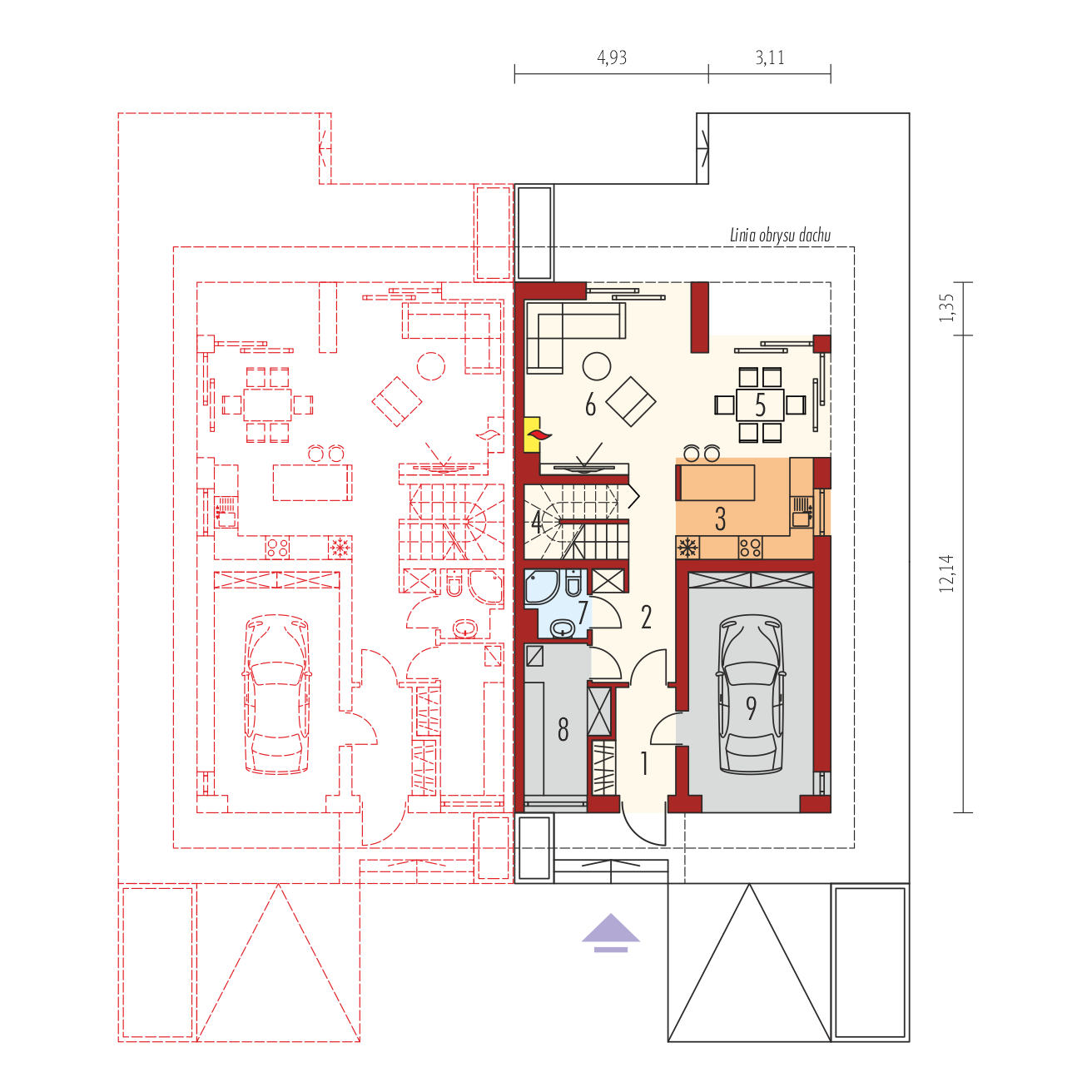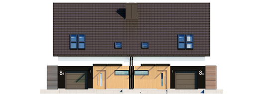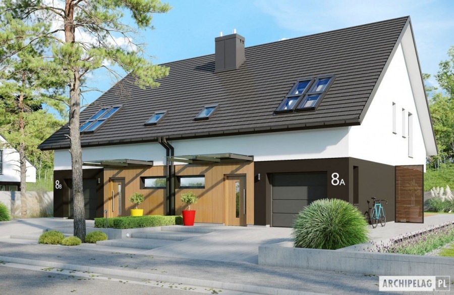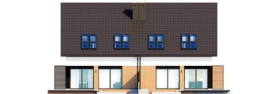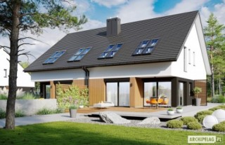 Powierzchnie i pozostałe dane liczbowe podano dla pojedynczego domu (połowa bliźniaka). Koszty budowy dotyczą pojedynczego domu (połowa bliźniaka). Cena dokumentacji technicznej obejmuje obydwa domy. Charakterystyka: Dom jednorodzinny w zabudowie bliźniaczej, parterowy z poddaszem użytkowym, niepodpiwniczony, z garażem jednostanowiskowym Przeznaczenie: Dom dla 3-4-osobowej rodziny Technologia i konstrukcja: Ściany zewnętrzne: murowane, dwuwarstwowe, beton komórkowy firmy H+H 24 cm, ocieplenie styropian Termo Organika 20 cm Ściany wewnętrzne: nośne i działowe murowane, beton komórkowy firmy H+H 24 cm i 12 cm Strop: międzypiętrowy gęstożebrowy Teriva Dach: konstrukcja drewniana, ocieplenie wełna mineralna Isover 30 cm, dachówka płaska Bergamo firmy Röben Inne: schody wewnętrzne drewnianeRozwiązania instalacyjne: Ogrzewanie: kocioł gazowy kondensacyjny firmy Viessmann, rozprowadzenie ciepła: grzejniki firmy Purmo Wentylacja: grawitacyjna OZE: kolektory słoneczneWykończenie: Elewacje: tynk cienkowarstwowy mineralny w kolorze białym TO-PA001 i grafitowym TO-GY015 z palety firmy Termo Organika, okładzina drewniana w układzie pionowym z efektem 3D z barwionego modrzewia syberyjskiego lub świerku skandynawskiego Stolarka: drewniana, PVC lub aluminiowa, drzwi tarasowe podnoszono-przesuwne typu HS aluminiowo-drewniane INNOVIEW firmy FAKRO, obudowy żaluzji wewnętrznych CleverBox Interior firmy BeClever, drzwi wejściowe i brama garażowa firmy Hörmann Okna połaciowe: rozwiązania technologiczne i wyłaz dachowy firmy VELUX Pobierz ekspercki poradnik VELUX i dowiedz się jak wybrać okna dachowe Otoczenie: kostka betonowa i płyty tarasowe firmy Libet, system tarasowy ProDeck - deska kompozytowa Terra w kolorze orzechWersje domów w serii Lukas - zapytaj o dostępność: - Lukas G1 (bliźniak) – wariant podstawowy, dach bez okapów, z lukarną nad garażem - Lukas II G1 wersja A (bliźniak) – podobny układ funkcjonalny (zmiany w strefie wejściowej, bez lukarny), dach bez okapów - Lukas II G1 wersja B (bliźniak) – układ funkcjonalny jak w wersji II G1 w. A, dach z okapami - Lukas II G1 (szeregowy) – układ funkcjonalny jak w wersji II G1 w. A i B, zabudowa szeregowa - odbicie lustrzane do wszystkich wersji Wszystkie wersje domów możliwe w dwóch standardach/wariantach instalacyjnych: - ENERGO: piec gazowy kondensacyjny, grzejniki, wentylacja grawitacyjna - ENERGO PLUS: pompa ciepła, ogrzewanie podłogowe, wentylacja mechaniczna, dodatkowo panele fotowoltaiczne Istnieją techniczne możliwości wykonania zmian: - podpiwniczenia budynku - wykonania budynku dwulokalowego - wykonania budynku w technologii szkieletowej - dokonania zmian funkcjonalnych wg indywidualnych wymagań