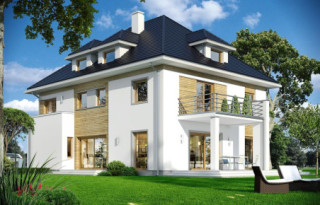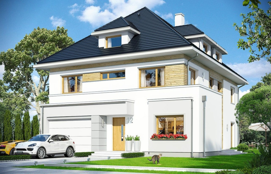 Projekt domu Agat 2 jest nową wersją naszego projektu Agat, tym razem w nowocześniejszej stylistyce, dostosowanej do miejskiej zabudowy na dość wąskiej i niedużej parceli. Często dysponując niedużym placem Inwestorzy chcą zbudować spory dom z dużą ilością pomieszczeń. Nie ma wówczas innego wyjścia jak iść „w górę”, zwiększając wysokość domu i ilość kondygnacji. Projekt domu Agat 2 to doskonała propozycja dla tego rodzaju zabudowy. Dom ma zwartą sylwetkę, zaplanowaną na prostokątnym rzucie. Dom jest piętrowy, zakończony poddaszem z lukarnami, przykrytym czterospadowym dachem. Proporcjonalna bryła, dobrze dobrane detale i kolorystyka powodują, że budynek wygląda atrakcyjnie, reprezentacyjnie, a zarazem jego skala nie jest przesadzona. Architekturę domu można określić jako połączenie tradycyjnej formy, z nowoczesnymi detalami i materiałami. Wnętrze domu : na parterze zaprojektowano salon, jadalnię, kuchnię ze spiżarnią, dodatkowy pokój ( gabinet, lub sypialnię gościnną ), łazienkę, przedsionek z szatnią, oraz garaż z pomieszczeniem gospodarczym. Na piętrze mieszczą się cztery pokoje, w tym apartament rodziców z własną dużą łazienką i garderobą, oraz tarasem ogrodowym, ogólnodostępna druga łazienka, garderoba i pralnia. Poddasze to jednoprzestrzenne 80-ciometrowe wnętrze z łazienką, do dowolnego zagospodarowania. Projekt domu Agat 2 jest bardzo funkcjonalny, energooszczędny i dość prosty w budowie. To bardzo rozsądna propozycja projektu sporego domu na działce miejskiej. Zapraszamy !