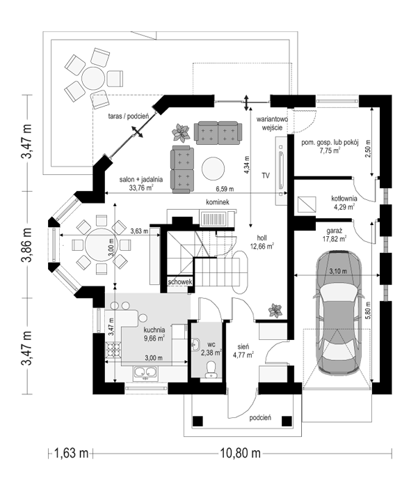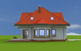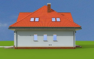 Projekt domu Agatka to dom dla 4- 5-osobowej rodziny, budynek parterowy z poddaszem użytkowym przykryty kopertowym, czterospadowym dachem.Dom zaprojektowano w spokojnej stylistyce z przenikającymi się tradycyjnymi i nowoczesnymi detalami. Zwarta bryła budynku z wbudowanym garażem, została ozdobiona lukarnami z balkonami, wykuszem jadalni, oraz narożnym podcieniem salonu. Prosta, czytelna bryła podkreśla elegancję zewnętrznej architektury budynku. Przestrzeń parteru w projekcie domu Agatka zaprojektowano w taki sposób, aby wszystkie pomieszczenia otaczały hol i centralnie usytuowane schody. Część dzienną stanowią hol, salon, jadalnia i kuchnia - pomieszczenia tworzące jedno otwarte wnętrze, są jednak częściowo od siebie oddzielone. W części gospodarczej na parterze zaprojektowano garaż, kotłownię i dodatkowe pomieszczenie (może ono być również zaadaptowane na dodatkowy pokój - np. gabinet). Na poddaszu mieszczą się trzy duże sypialnie z garderobą i szafami wbudowanymi, oraz przestronna łazienka - pokój kąpielowy. Na niewielkiej powierzchni udało się zaprojektować funkcjonalne wnętrza z przestronnymi, ustawnymi pokojami. Projekt domu Agatka z biura MGProjekt dostępny jest także w wersji odbicia lustrzanego.