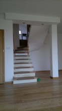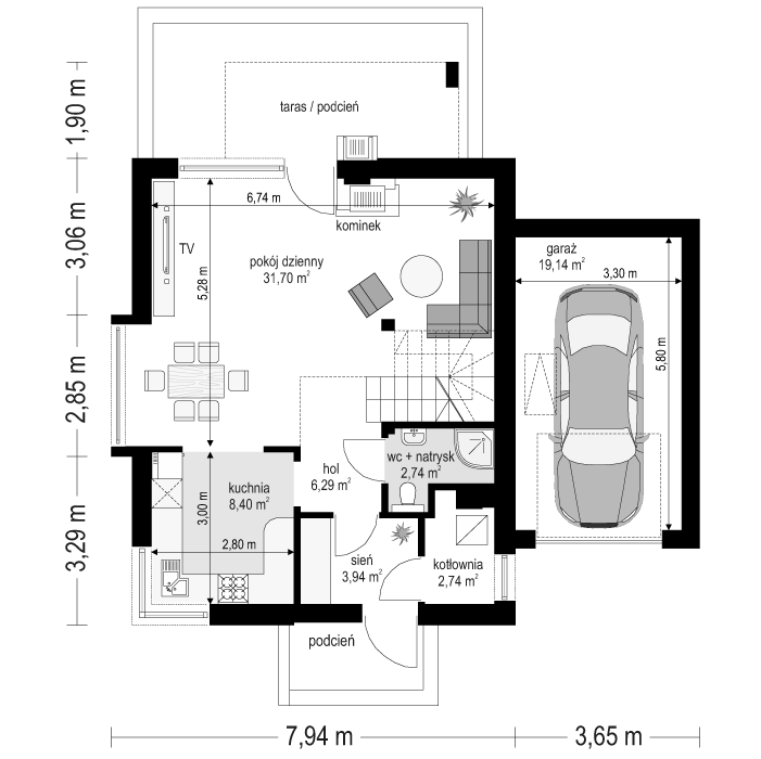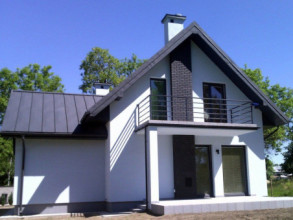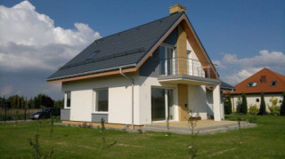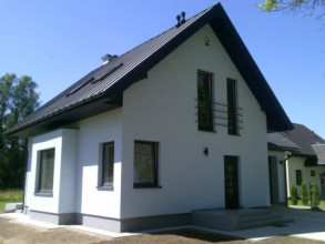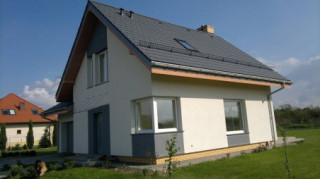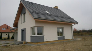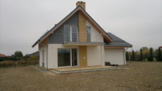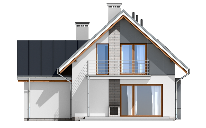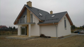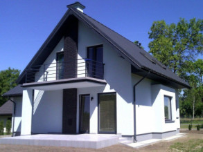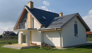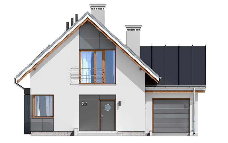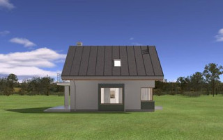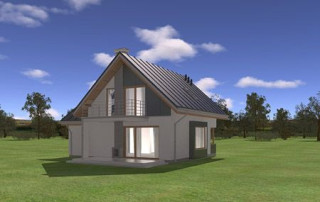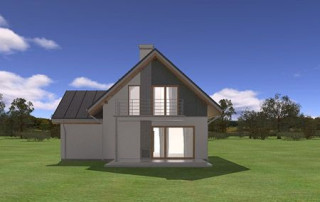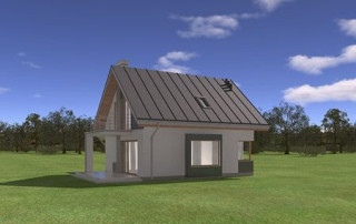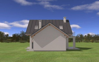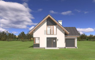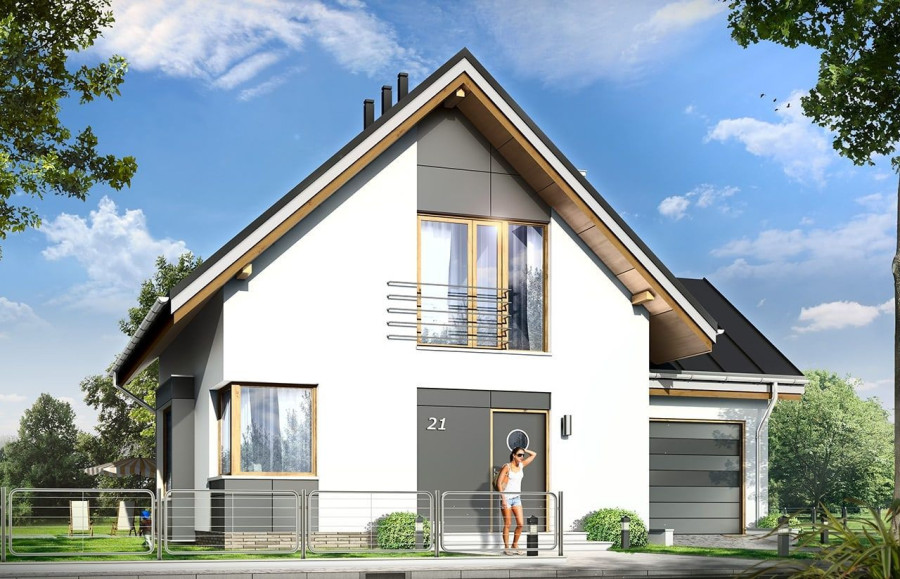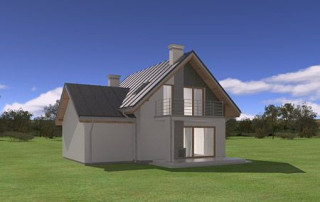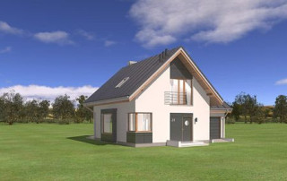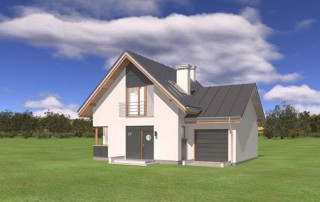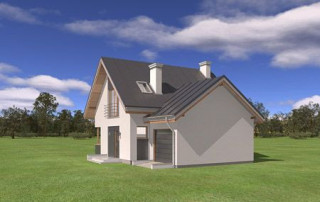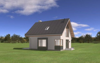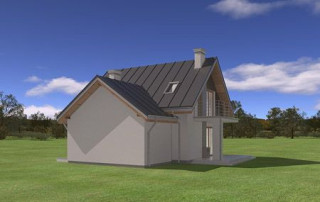 Projekt domu Gucio 2 to nowoczesny niewielki domek dla 4- 5-osobowej rodziny. Parterowy budynek przekryty dwuspadowymi dachami, z dobudowanym do głównej bryły garażem. Dom zaprojektowano, aby dać jak największy komfort przyszłym mieszkańcom, tworząc otwartą przestrzeń dzienną, charakterystyczną dla dużych domów jednorodzinnych. Salon połączony z holem, aneksem jadalnym z wykuszem, wyeksponowanymi reprezentacyjnymi schodami będzie wspaniałym miejscem do życia dla przyszłych domowników. Kominek w domu Gucio 2 usytuowany został na ścianie zewnętrznej, co pozwoli rozkoszować się widokiem ognia i ogrodu równocześnie. Duże przeszklone drzwi łączą pokój dzienny z częściowo zadaszonym tarasem. Na parterze znajduje się też wygodna kuchnia, przedsionek, kotłownia, wc z natryskiem i garaż. Na poddaszu zaprojektowano trzy wygodne sypialnie z niewielkimi "skosami", oraz z wbudowanymi szafami - garderobami. Dodatkowo na poddaszu znajduje się ładna łazienka. Nad garażem mieści się strych gospodarczy dostępny z garażu. Architektura domu podkreśla prostotę form, nowoczesność w doborze materiałów, co wszystko razem tworzy udaną kompozycję. Dom jest łatwy w budowie i niedrogi w późniejszym utrzymaniu. Projekt domu Gucio 2 dostępny jest także w wersji odbicia lustrzanego oraz w wersji bez garażu projekt domu Gucio.
